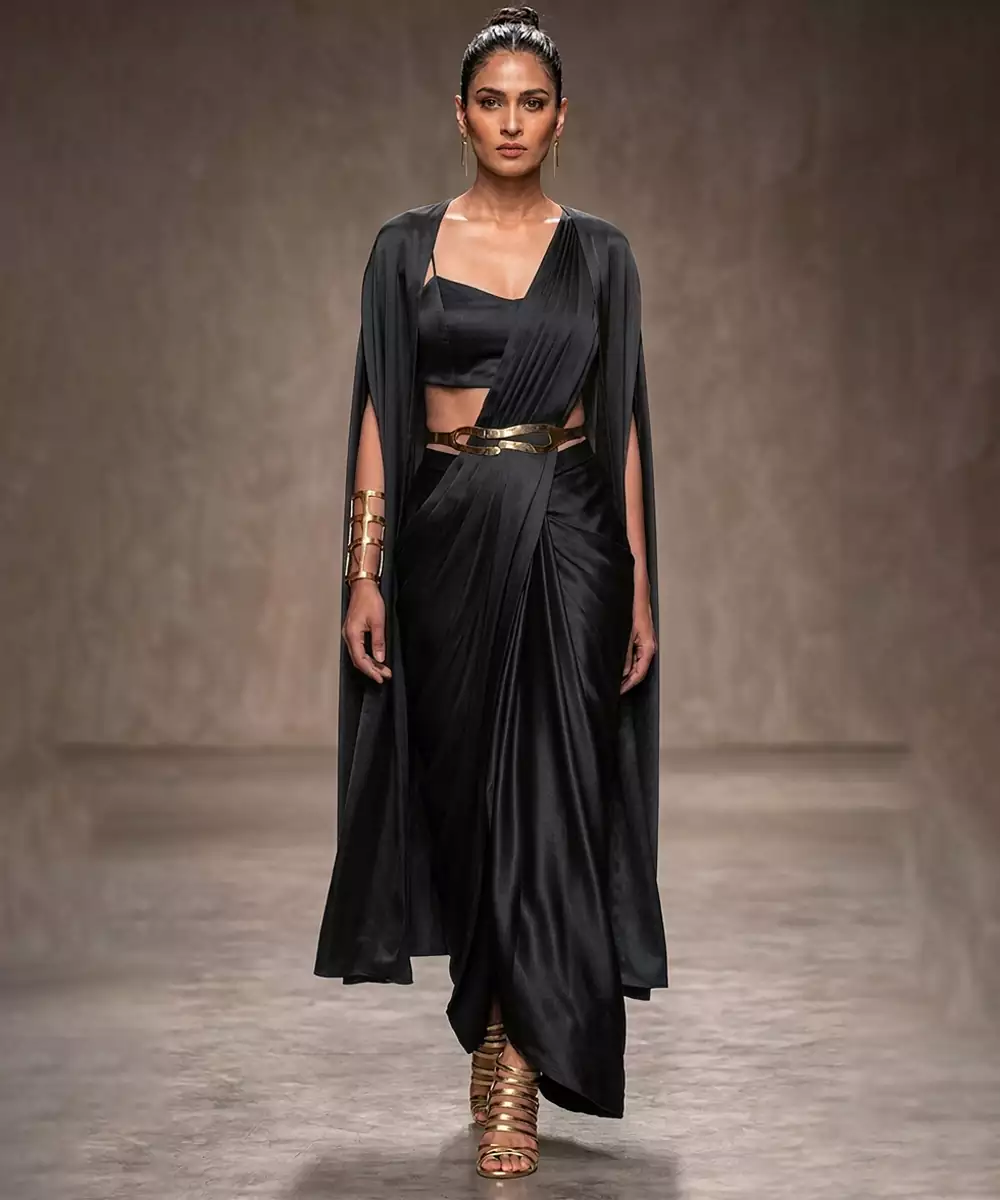 Black Modal Satin Draped Saree Set