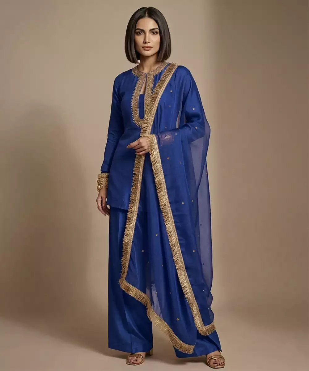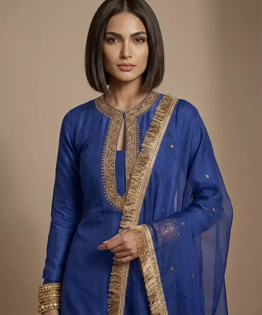 This Blue Raw Silk Kurta Set Showcases Detailed Embroidery That Enhances Its Rich And Elegant Appeal. The Luxurious Fabric Ensures A Graceful Drape And Comfortable Fit. Ideal For Festive Occasions, It Pairs Beautifully With Traditional Accessories For A Sophisticated And Timeless Look.