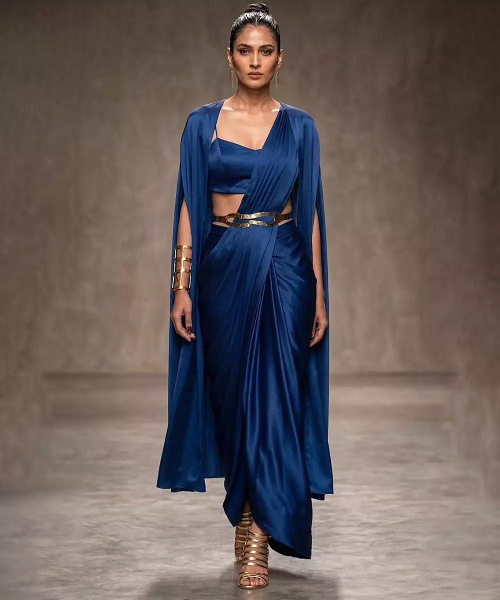 This Blue Modal Satin Draped Saree Set Features A Smooth Texture With A Subtle Sheen That Enhances Its Elegant Appeal. The Pre Draped Silhouette Ensures Ease Of Wear And A Flattering Fit. Perfect For Evening Events Or Festive Occasions, It Pairs Beautifully With Statement Accessories For A Chic Look.