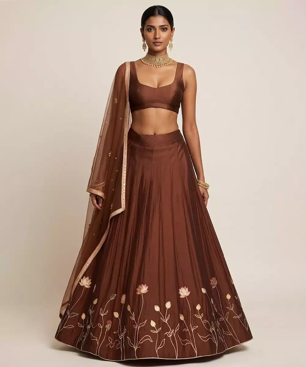 This Brown Silk Lehenga Set Features Intricate Embroidery That Adds Depth And Richness To Its Design. The Smooth Fabric Ensures Comfort And Elegance. Perfect For Festive Occasions, It Pairs Effortlessly With Minimal Or Bold Accessories For A Refined Appearance.