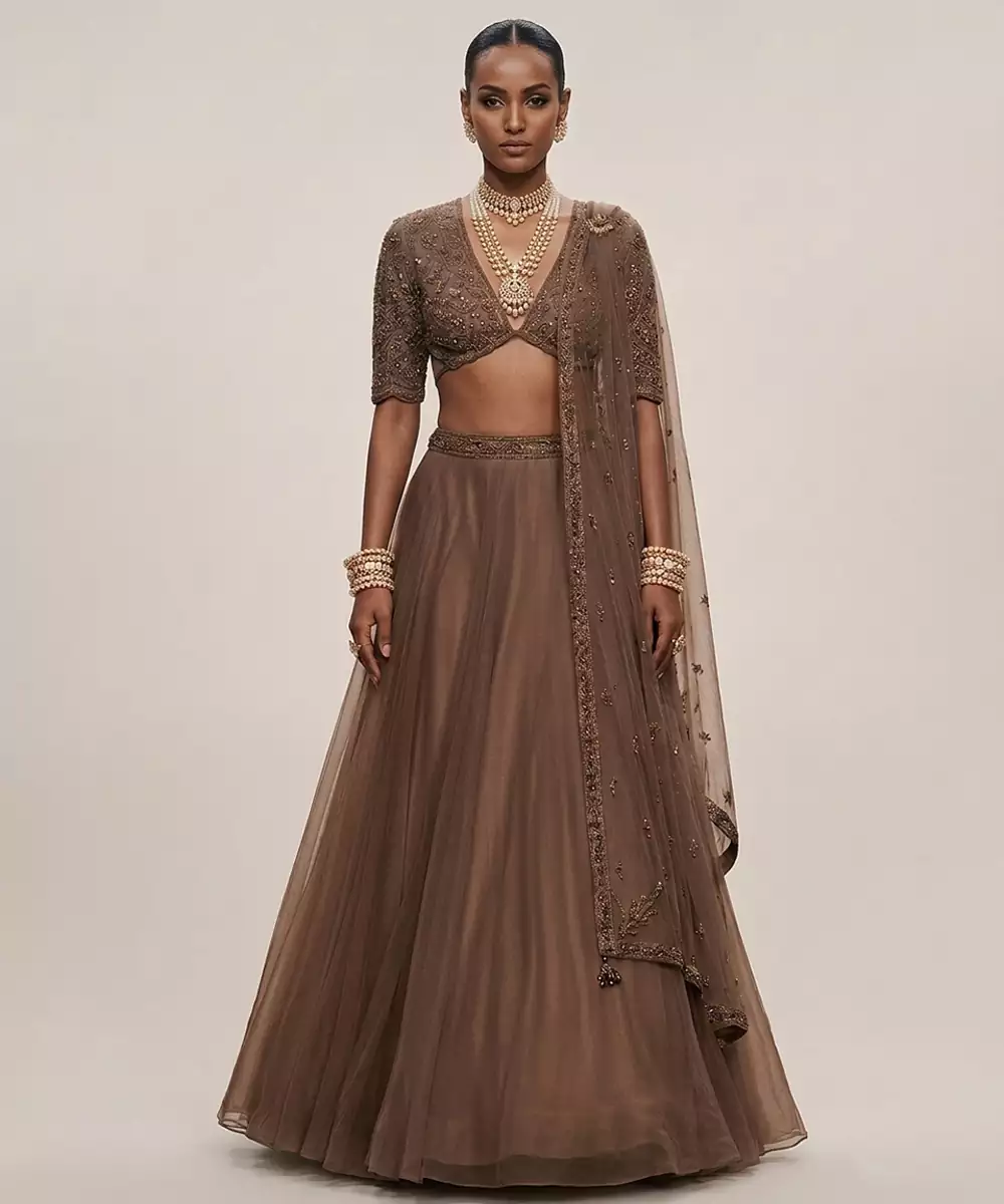 This Chocolate Brown Organza Lehenga Set Features Detailed Embroidery That Enhances Its Rich Tone. The Lightweight Fabric Creates A Graceful Silhouette. Ideal For Festive Occasions, It Pairs Beautifully With Statement Accessories For A Sophisticated And Elegant Look.