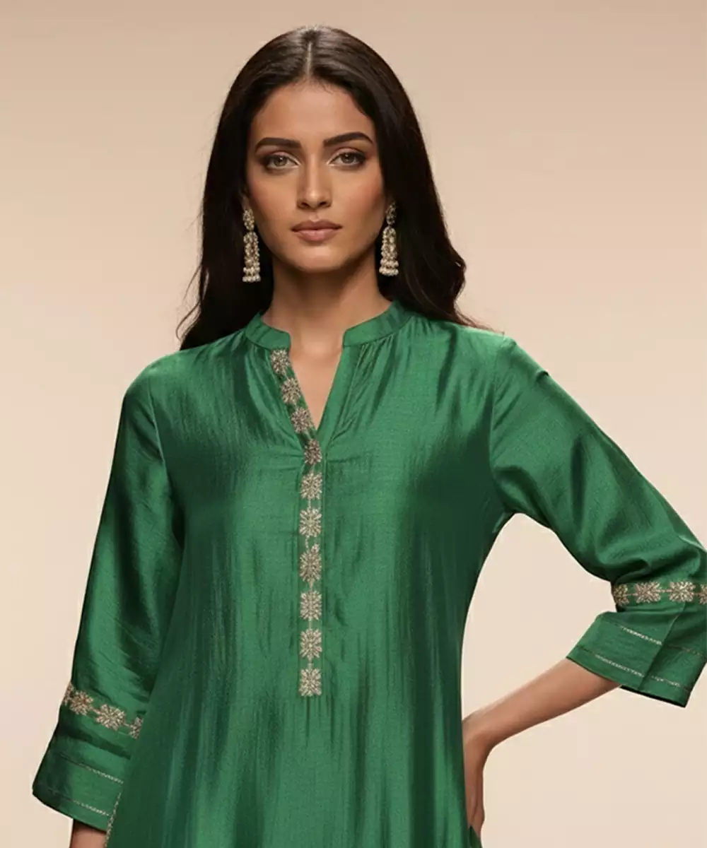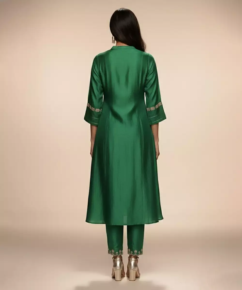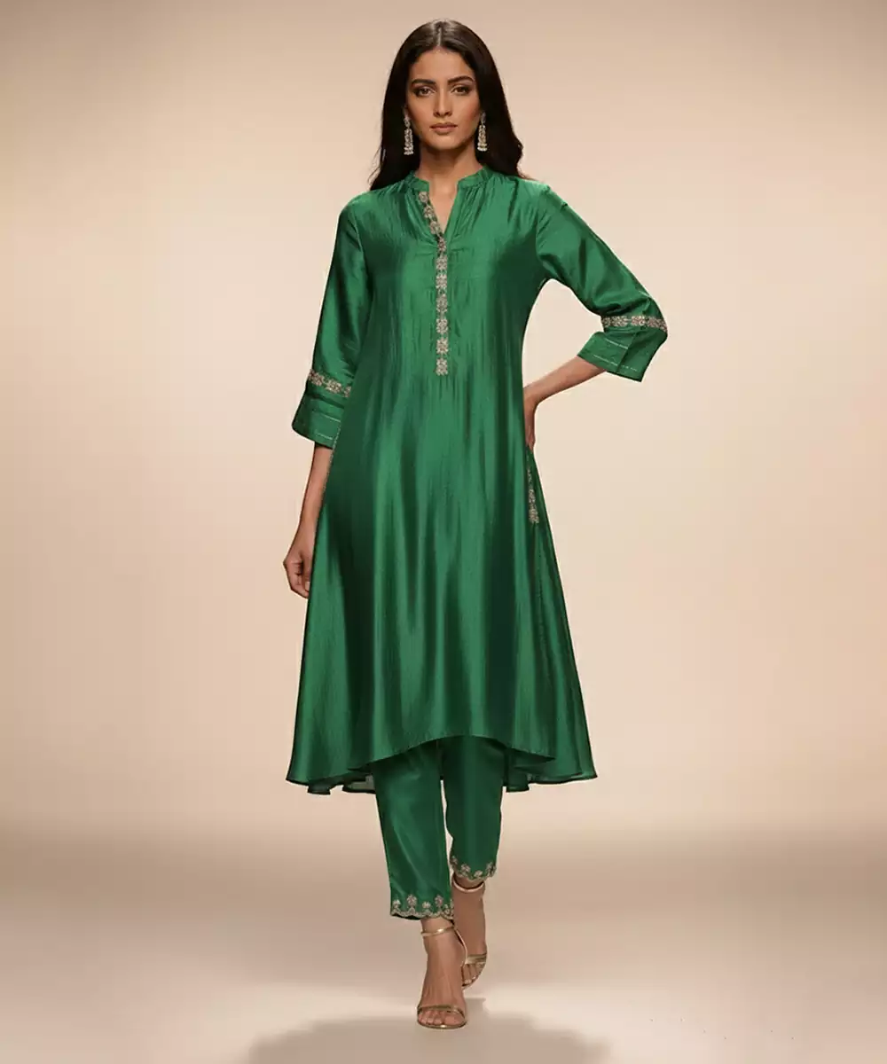 This Green Embroidered Chanderi Anarkali Kurta Set Reflects Classic Craftsmanship With Modern Elegance. The Airy Chanderi Fabric Drapes Beautifully While The Intricate Embroidery Adds Festive Sophistication. Paired With Coordinated Bottoms And Dupatta, It Creates A Graceful Ensemble Perfect For Celebrations, Weddings, And Traditional Gatherings.