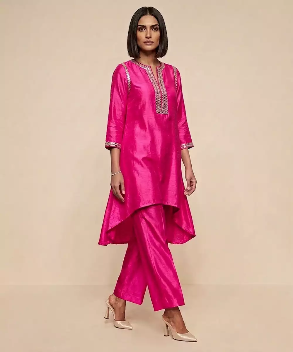 This Hot Pink Raw Silk Kurta Set Showcases Vibrant Embroidery That Enhances Its Bold And Festive Appeal. The Rich Texture And Structured Silhouette Create A Striking Look. Ideal For Celebrations, It Pairs Effortlessly With Statement Accessories For A Chic And Contemporary Style.
