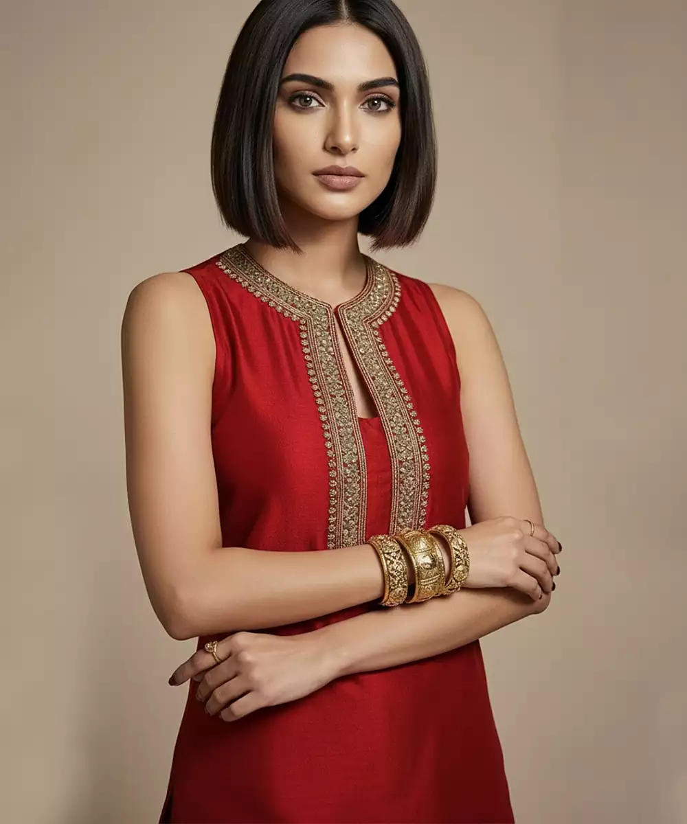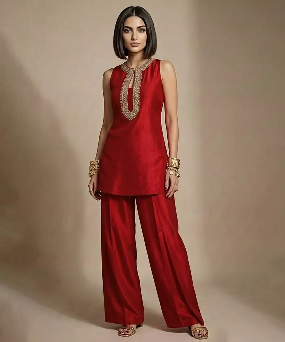 This Red Embroidered Raw Silk Co Ord Set Radiates Festive Grandeur With Its Vibrant Color And Elegant Craftsmanship. The Textured Raw Silk Fabric Adds Depth And Structure, While Intricate Embroidery Enhances Its Traditional Appeal. Perfect For Weddings, Celebrations, And Festive Occasions With A Refined Ethnic Style.