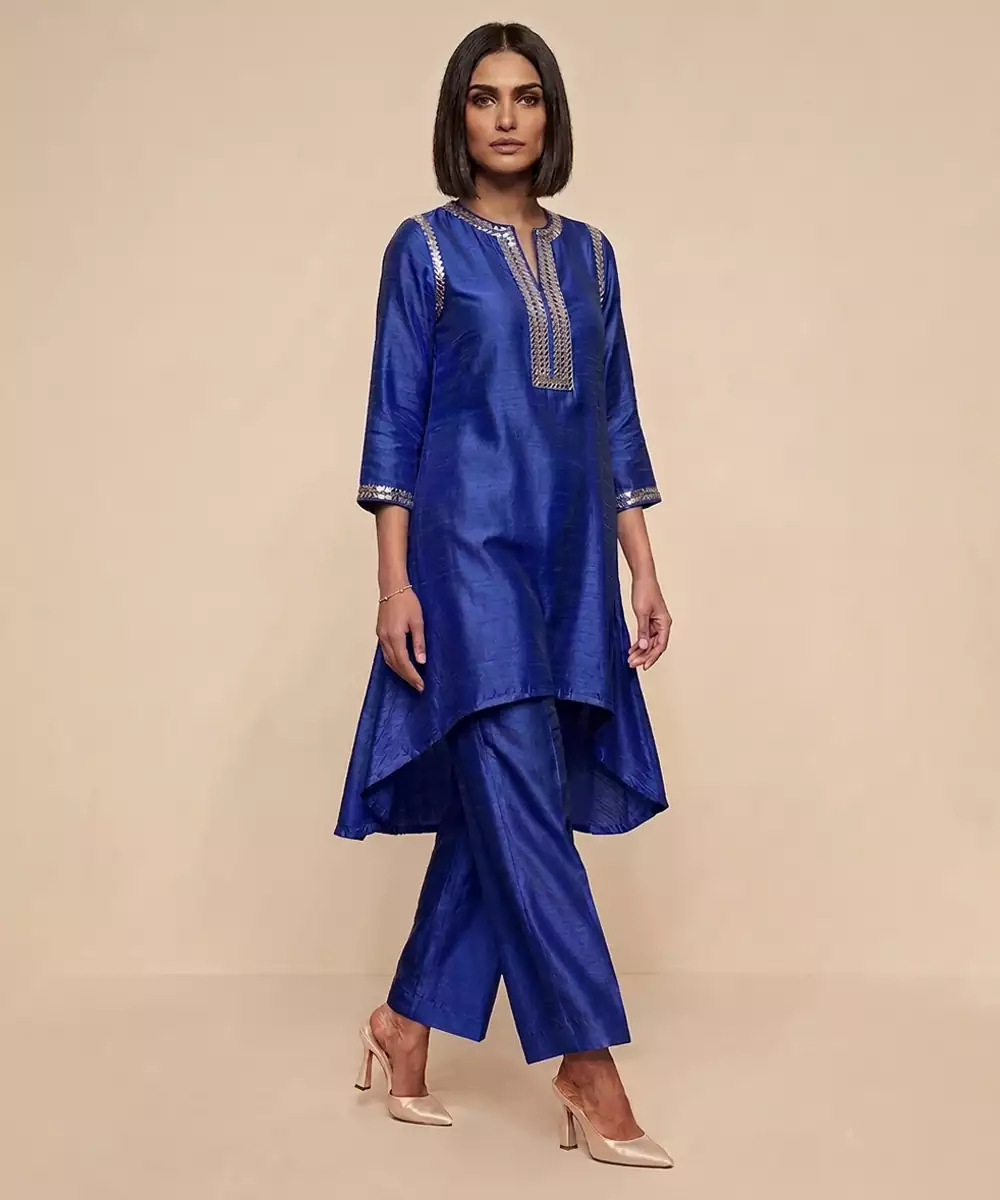 This Royal Blue Raw Silk Kurta Set Features Intricate Embroidery That Enhances Its Deep And Regal Appeal. The Luxurious Fabric Offers A Graceful Drape And Comfortable Fit. Perfect For Festive Occasions, It Pairs Beautifully With Traditional Jewelry For A Timeless And Elegant Look.