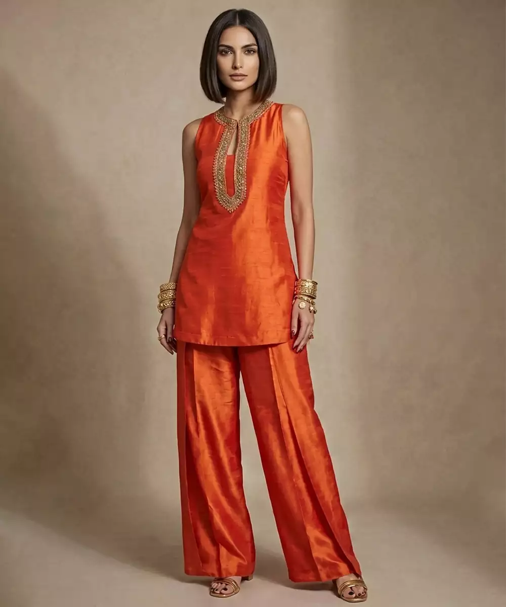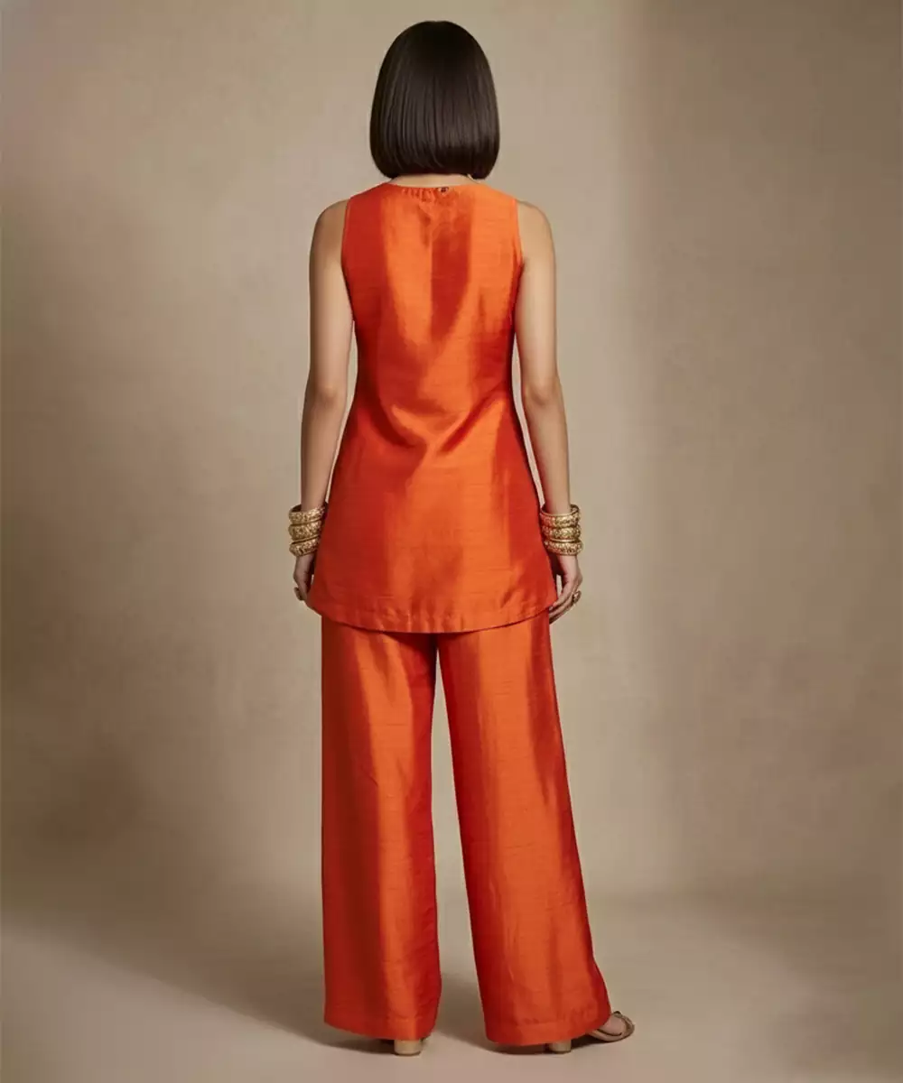 This Rust Orange Embroidered Raw Silk Co Ord Set Features Rich Color And Elegant Craftsmanship. The Luxurious Raw Silk Fabric Adds Structure And Depth While Intricate Embroidery Enhances Its Festive Charm. Styled With Coordinated Pieces, It Creates A Striking Ensemble Perfect For Celebrations And Weddings.