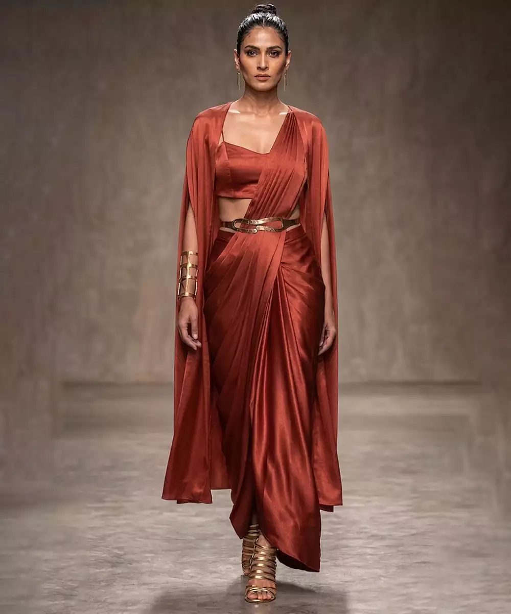 This Rust Orange Modal Satin Draped Saree Set Features A Rich Tone With A Smooth, Lustrous Finish. The Pre Draped Design Ensures Effortless Wear And A Flattering Silhouette. Perfect For Festive Occasions, It Pairs Beautifully With Minimal Or Statement Accessories For A Warm And Elegant Look.