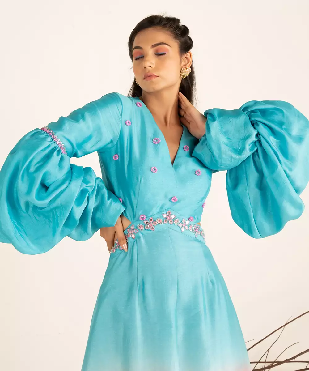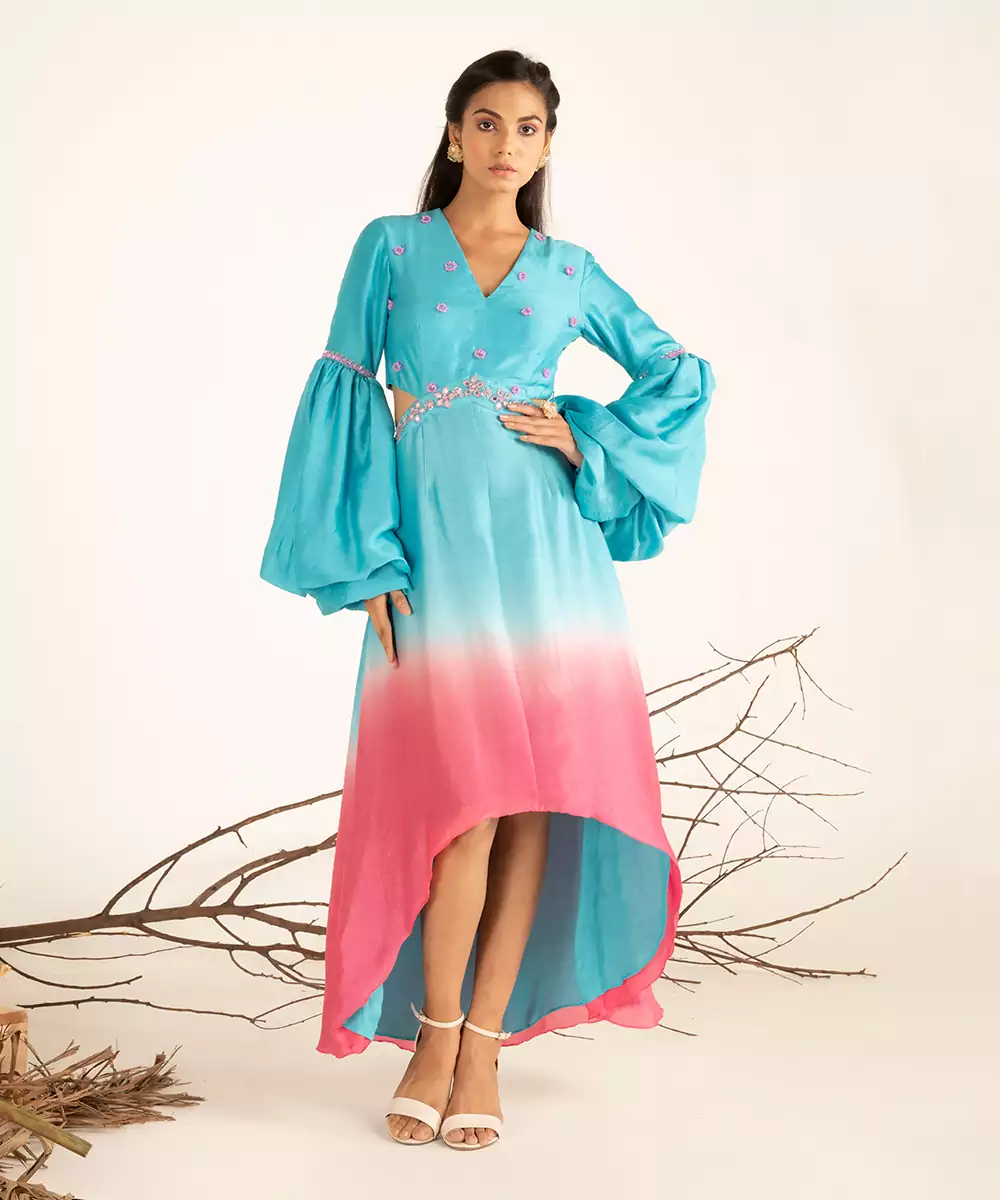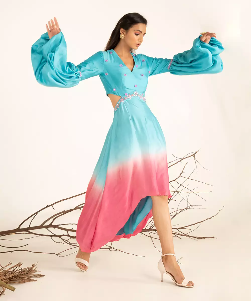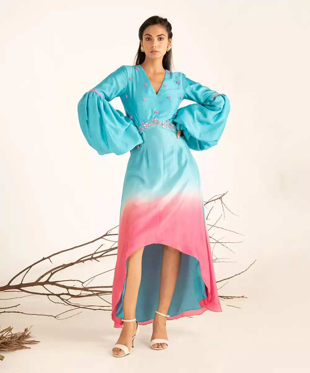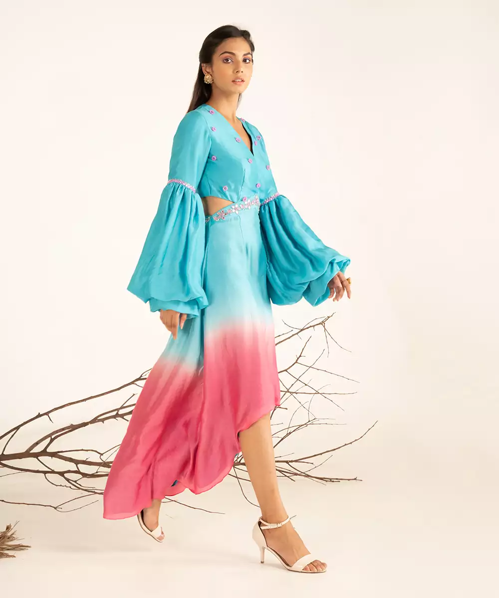 Hand Embroidery (Mirror, Beads, Tubelight), Ombre Dye, Paradise Blue And Pink Cosmos, 1 Piece, V Neckline, Zip Closure