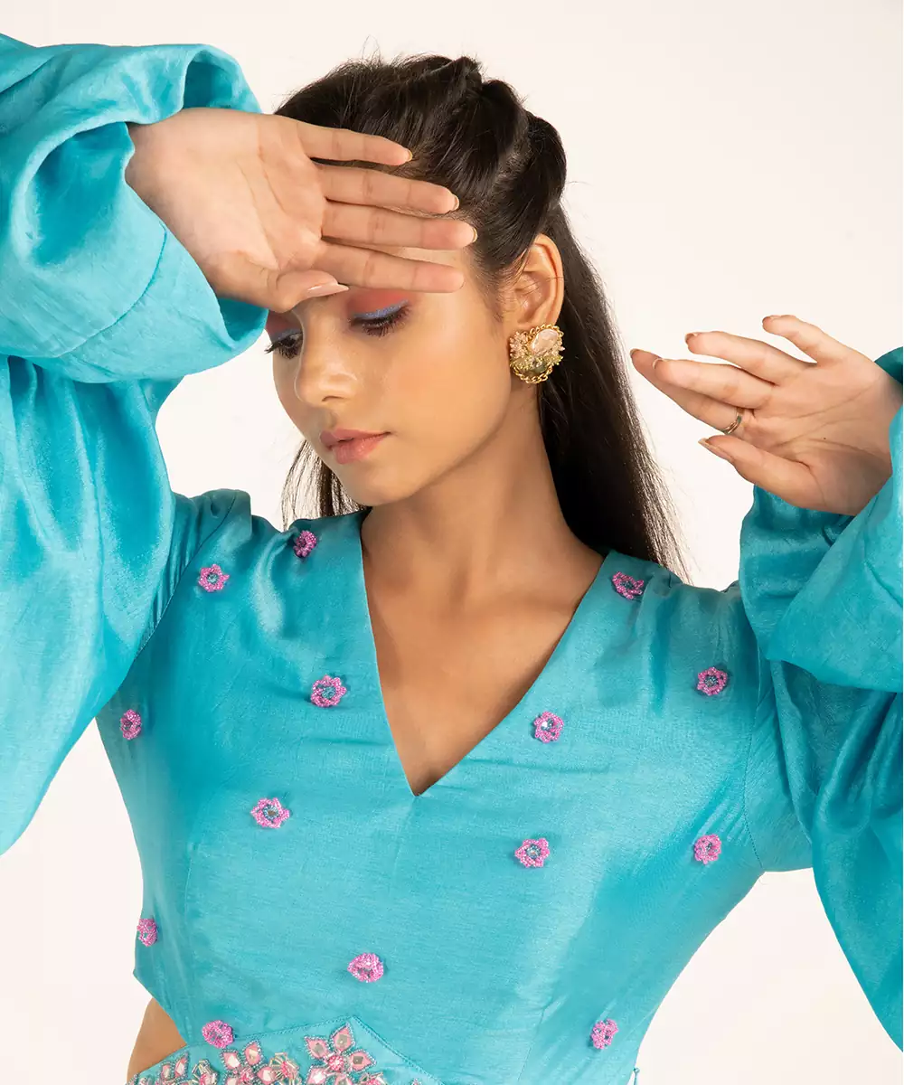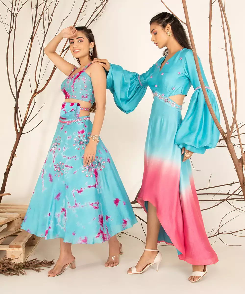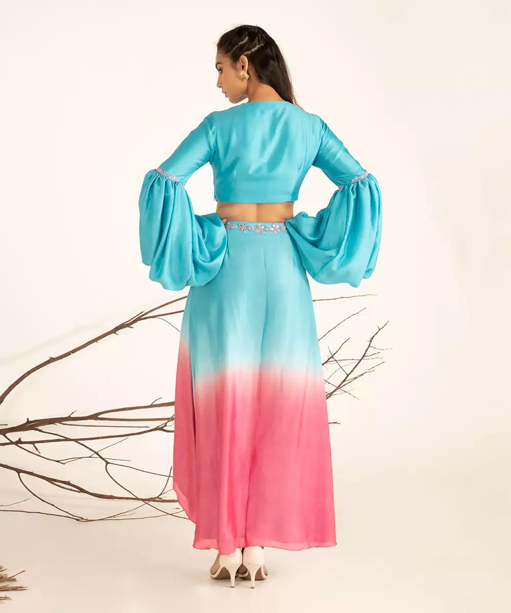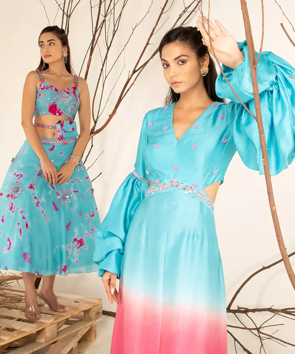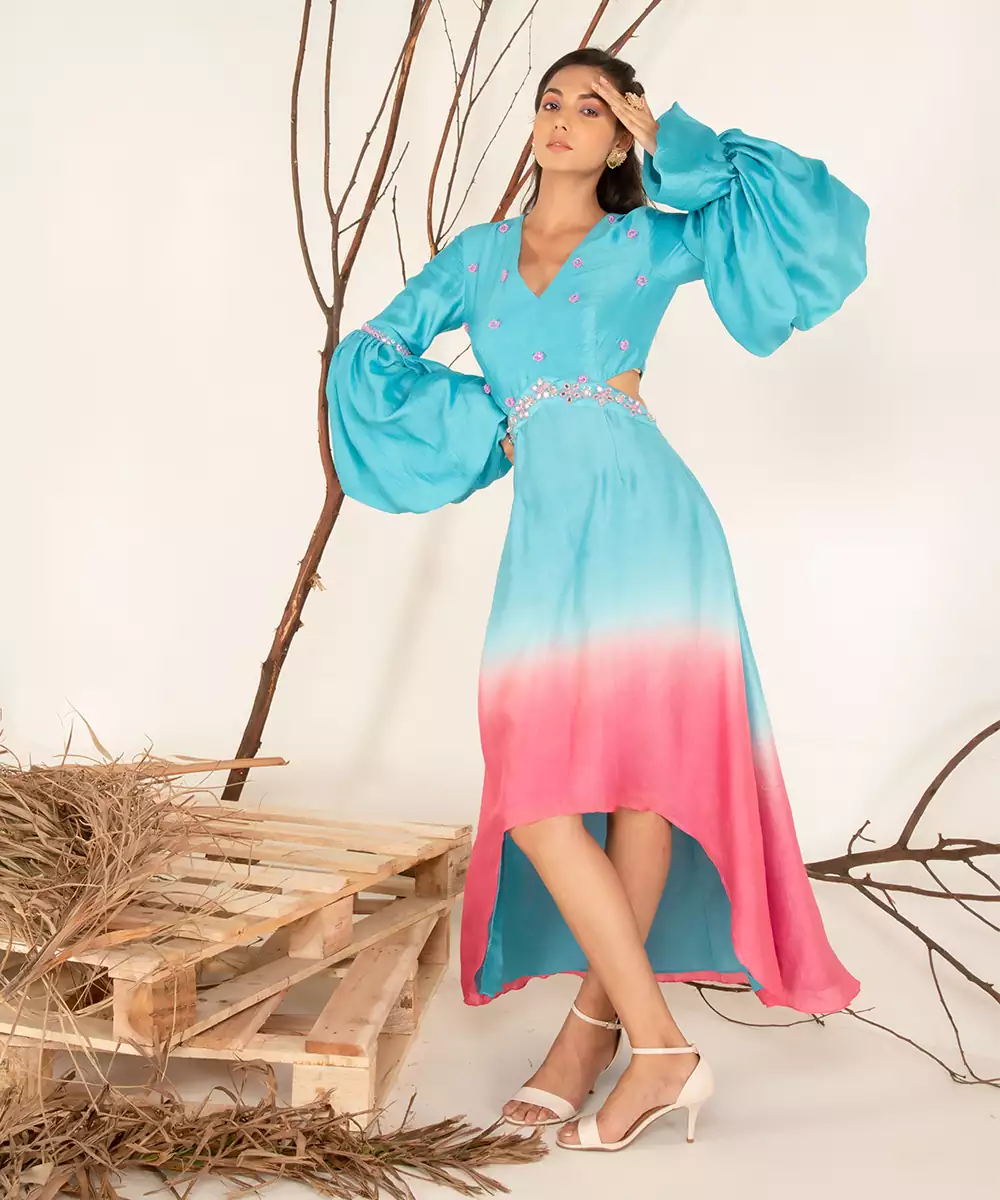 Hand Embroidery (Mirror, Beads, Tubelight), Ombre Dye, Paradise Blue And Pink Cosmos, 1 Piece, V Neckline, Zip Closure
