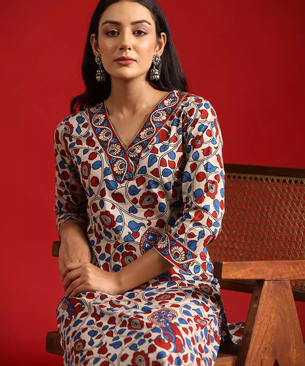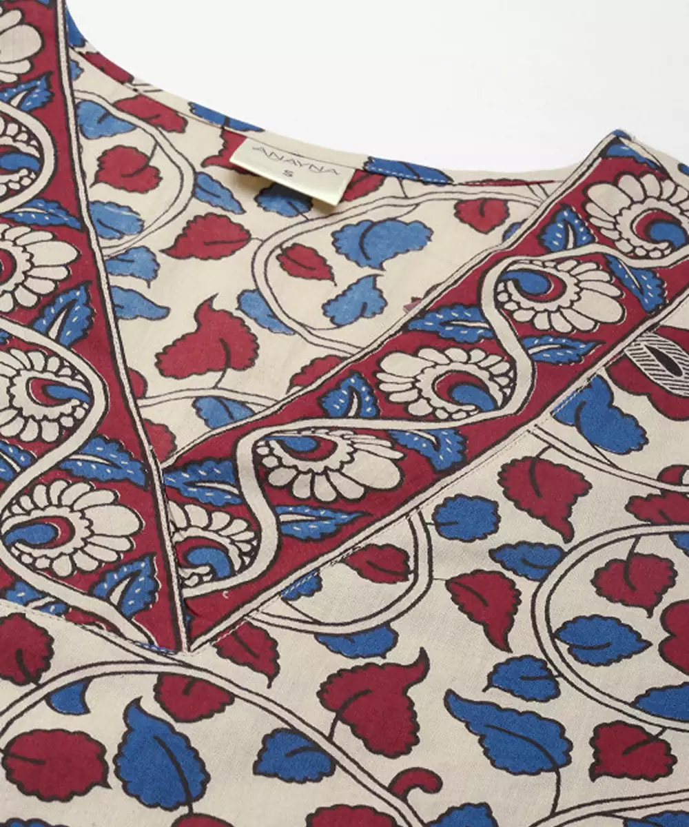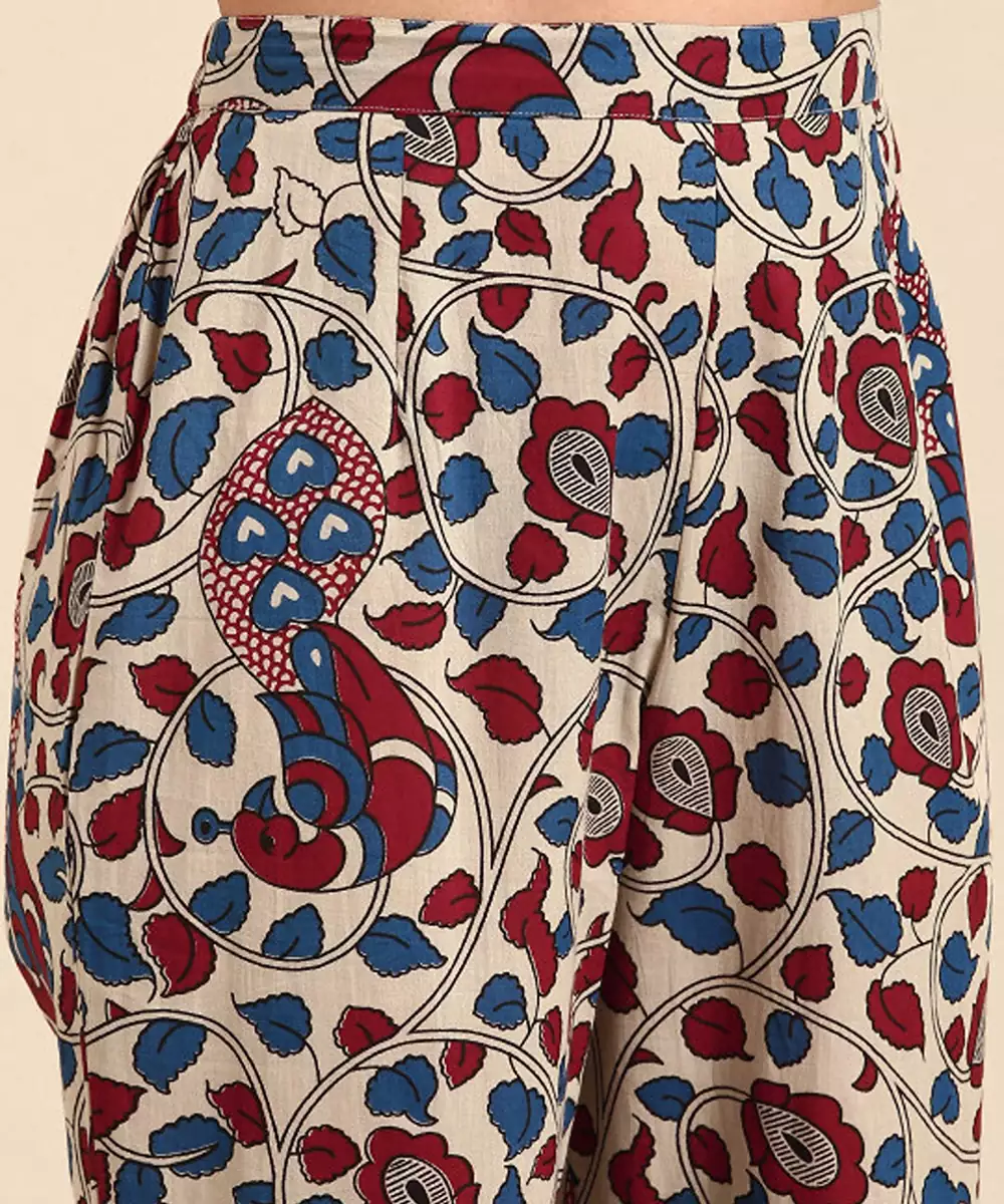 Beige Floral Printed Pure Cotton Kurta With Trousers