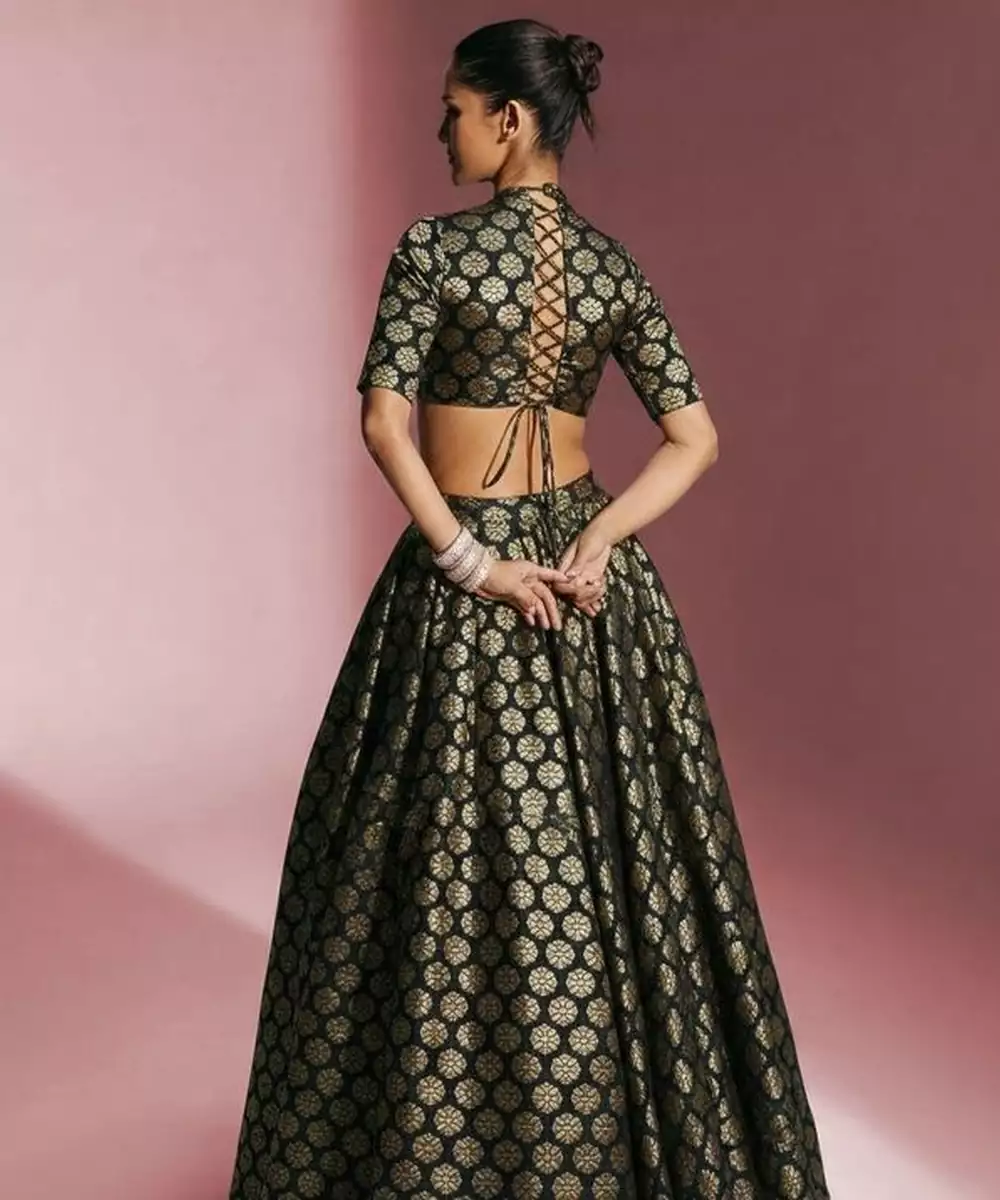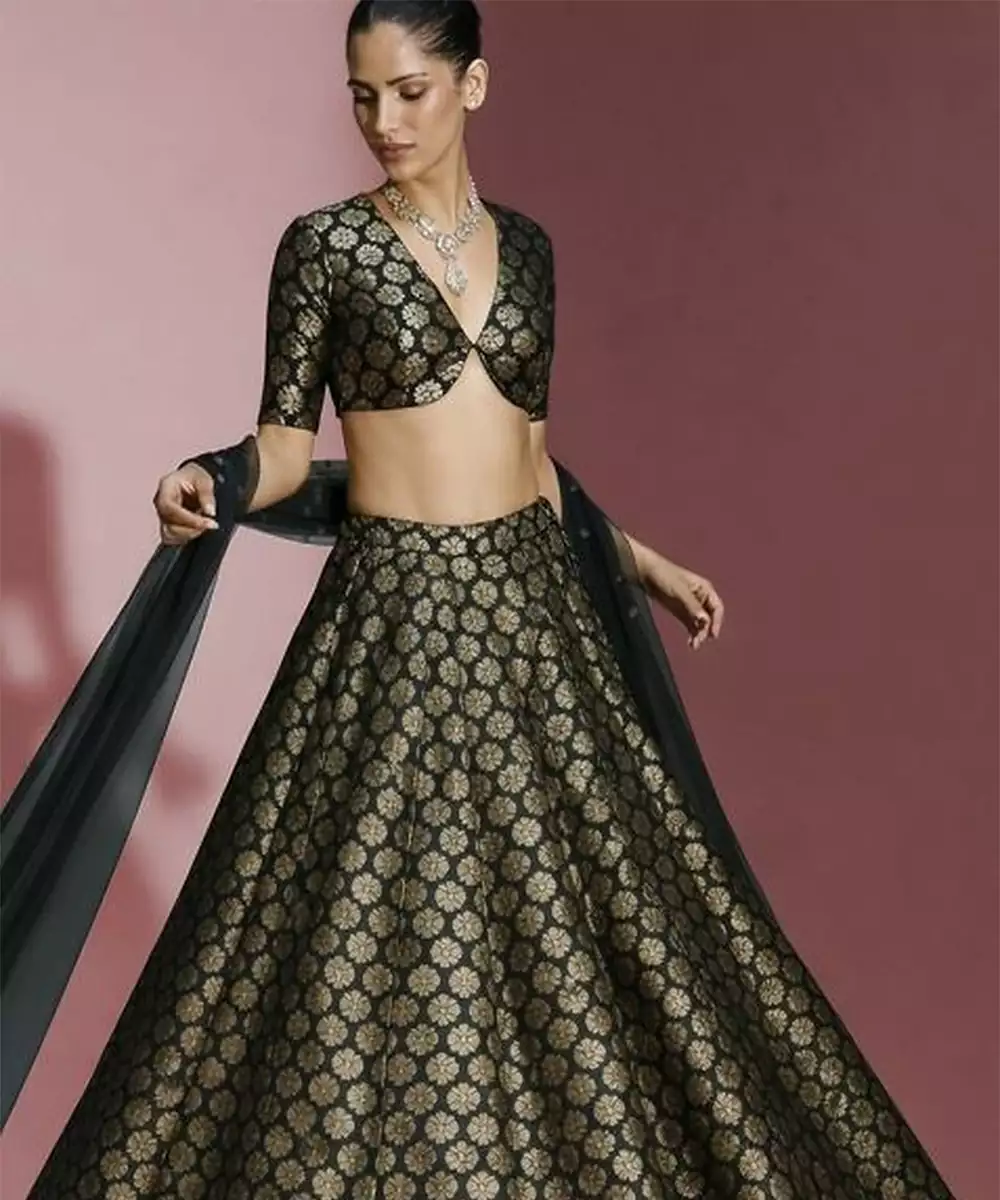 This Black Brocade Lehenga Set Showcases Elegant Woven Patterns That Create A Rich And Luxurious Look. The Structured Fabric Adds Depth And Sophistication. Styled With A Coordinated Blouse And Dupatta, It Is Perfect For Festive Evenings, Weddings, And Traditional Celebrations.