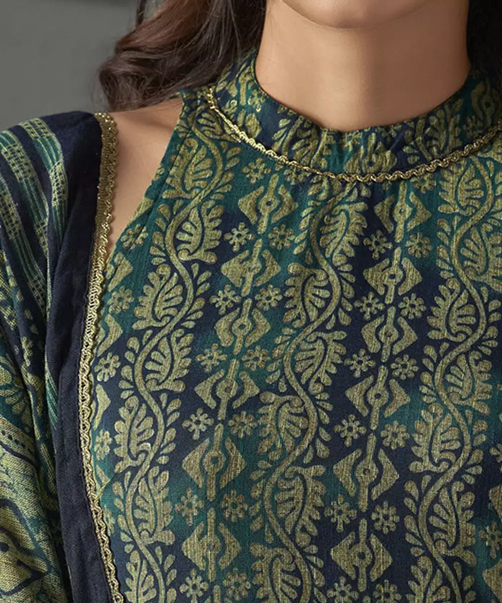 Blue, Gold Toned Printed Kurta With Trousers & Dupatta Kurta Design: