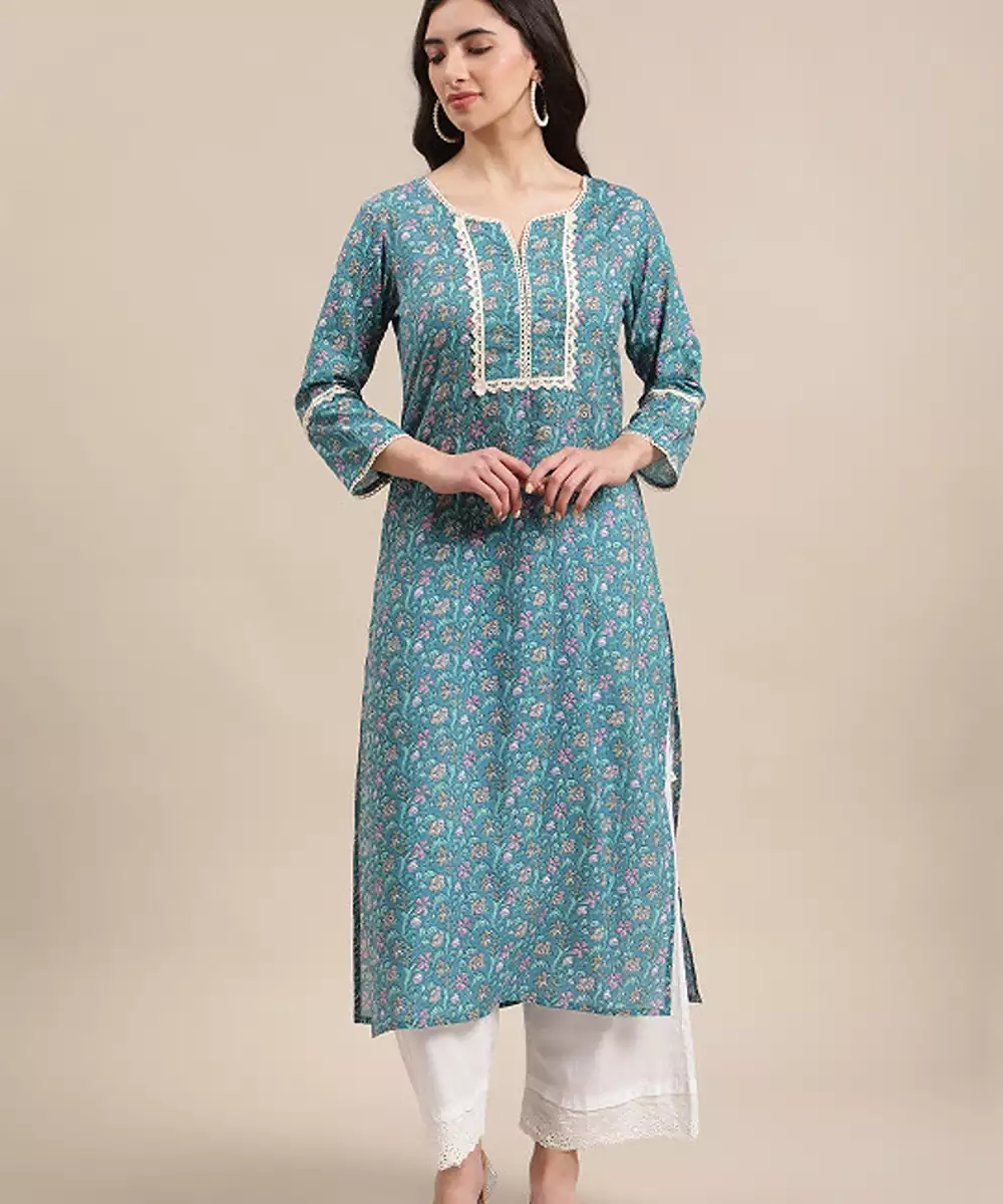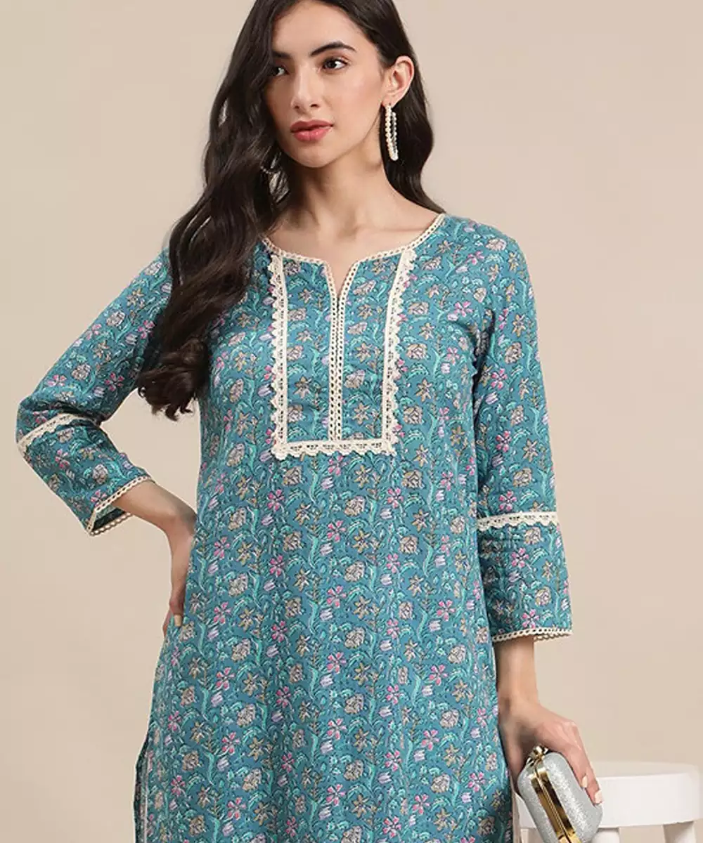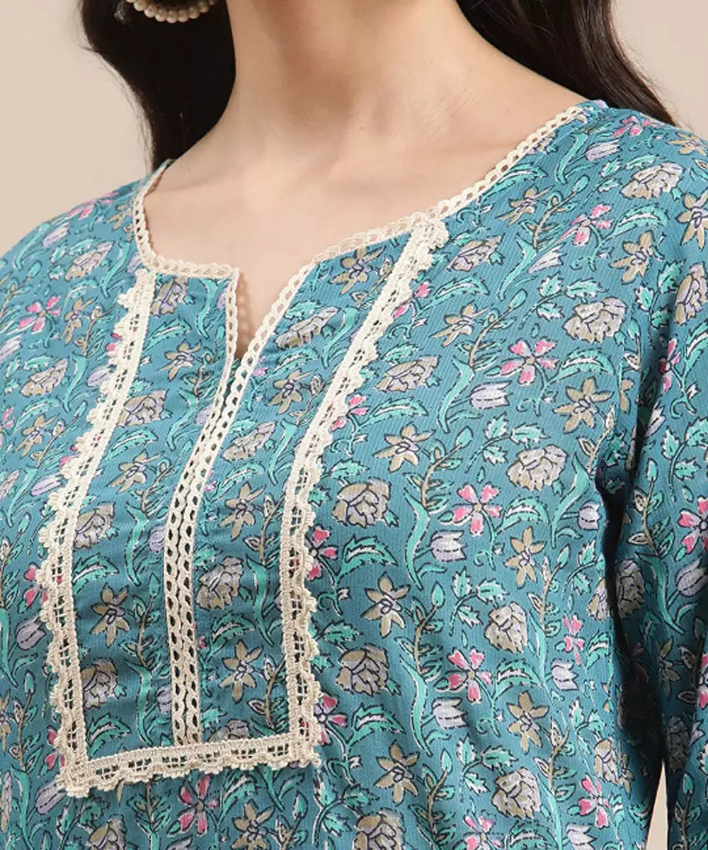 Blue Jaipuri Floral Print Pure Cotton Lace Detailed Kurta