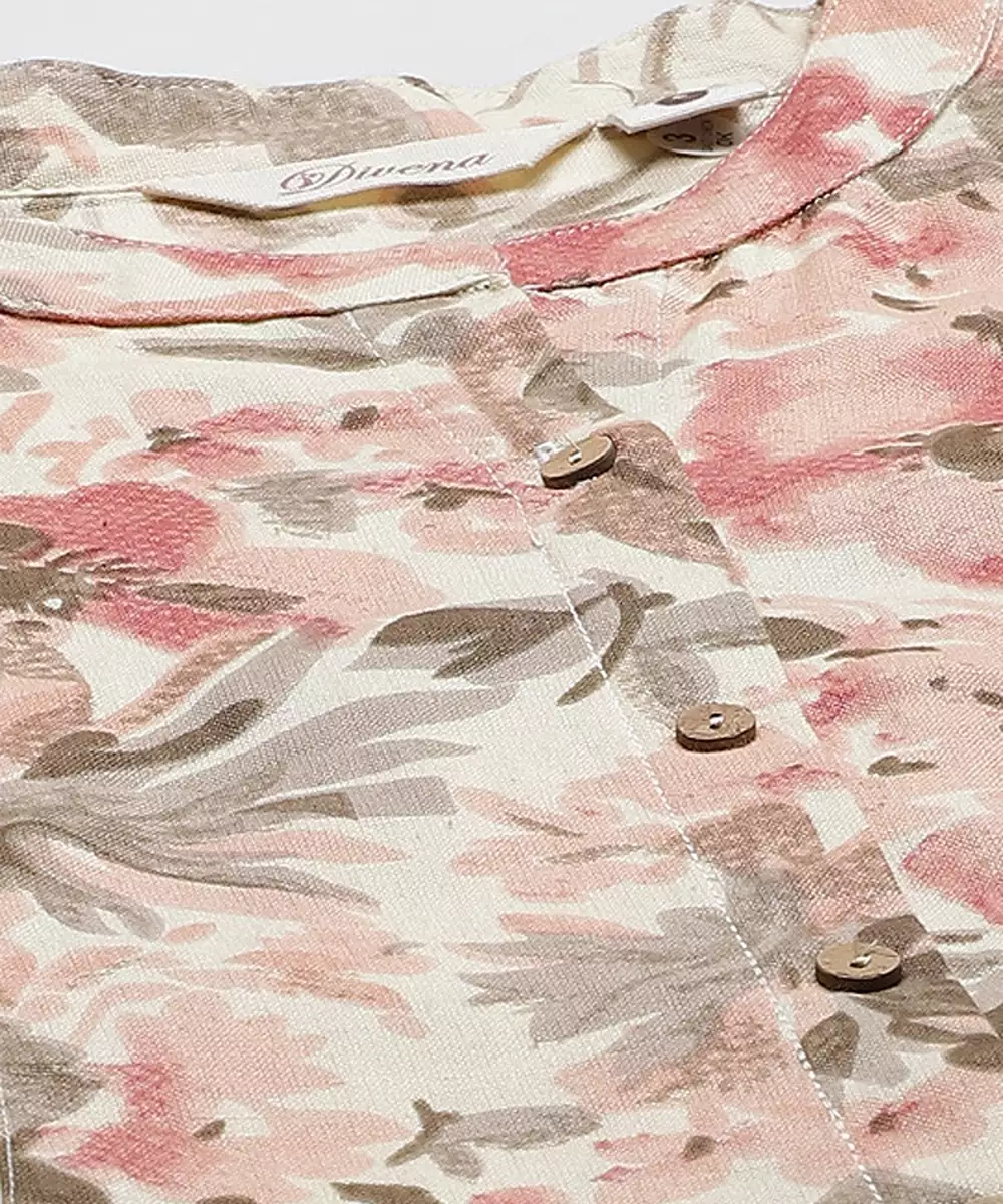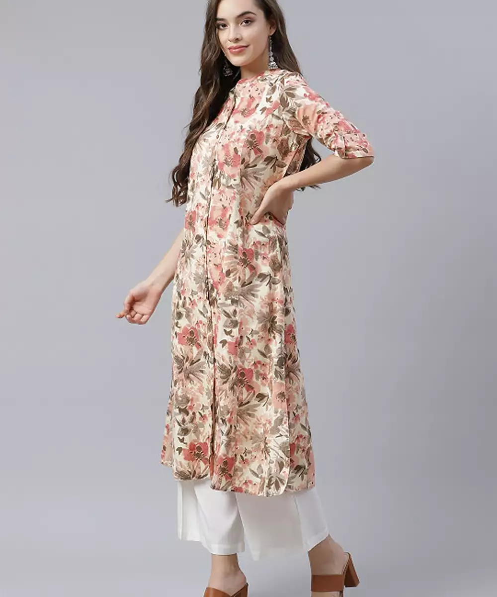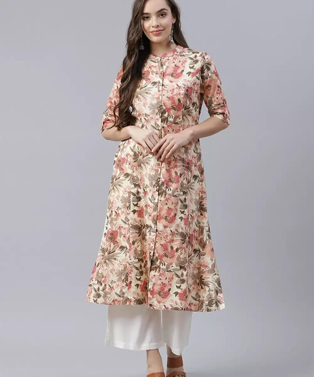 Cream & Peach Coloured Cotton Floral Print A Line Kurta