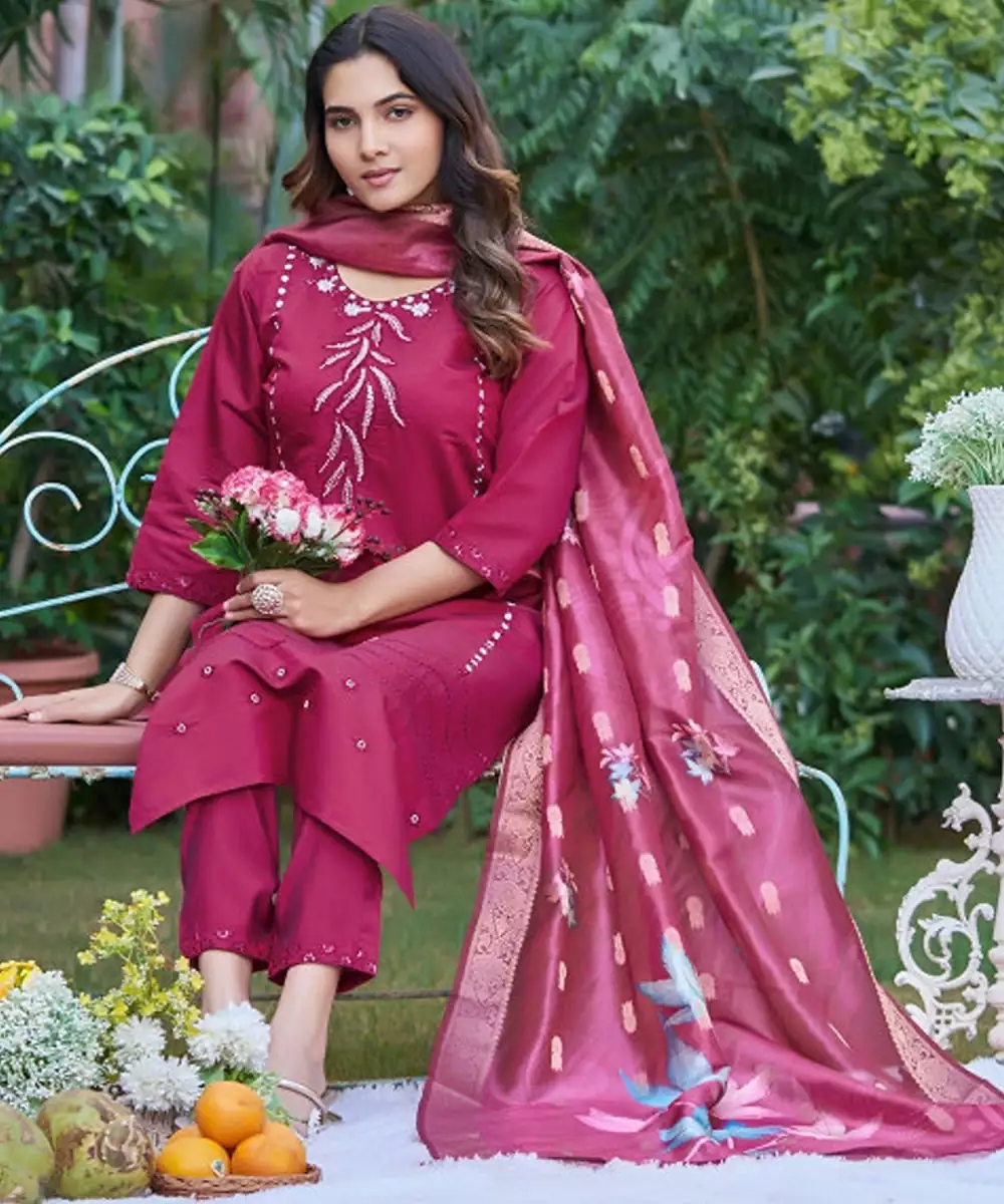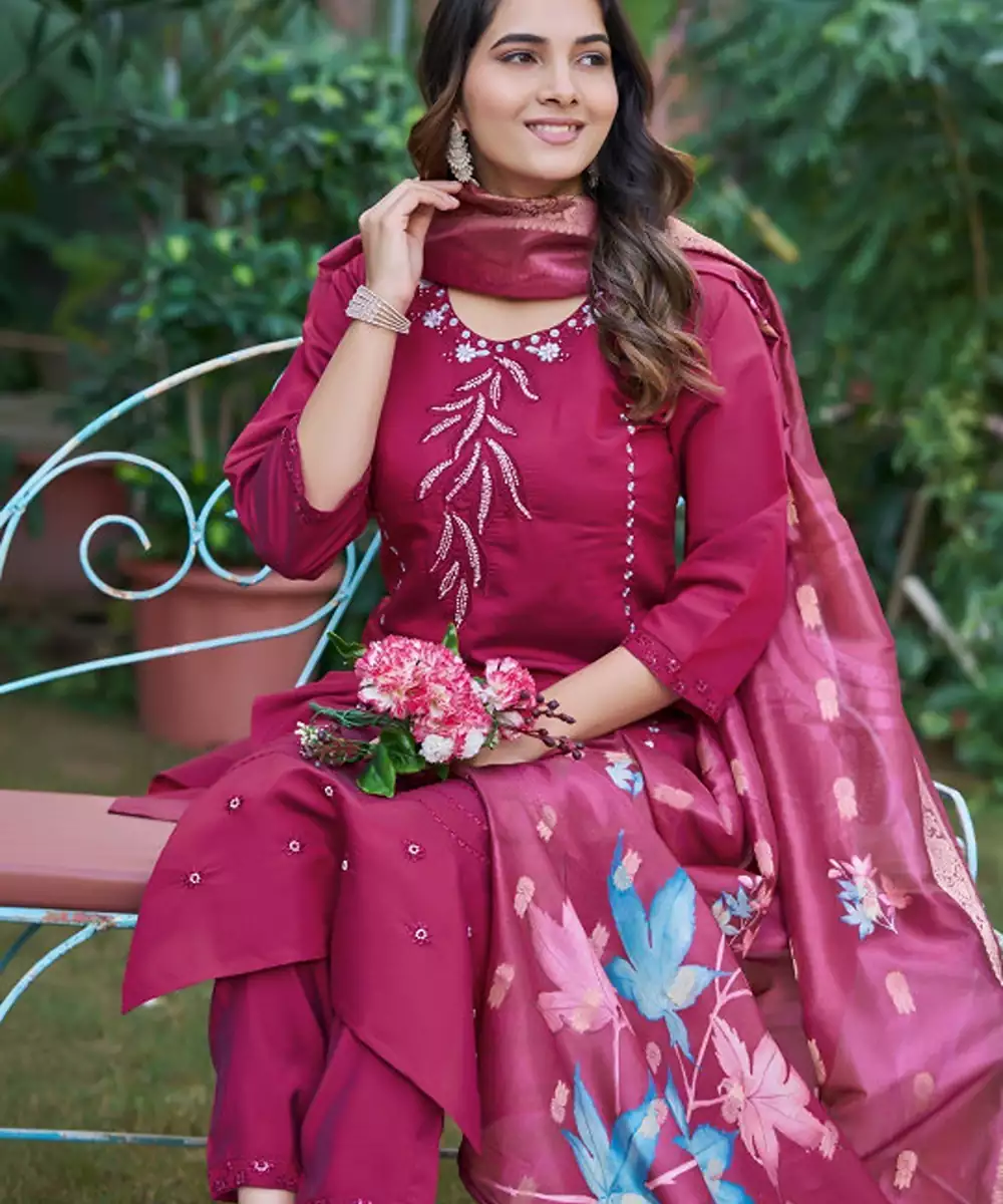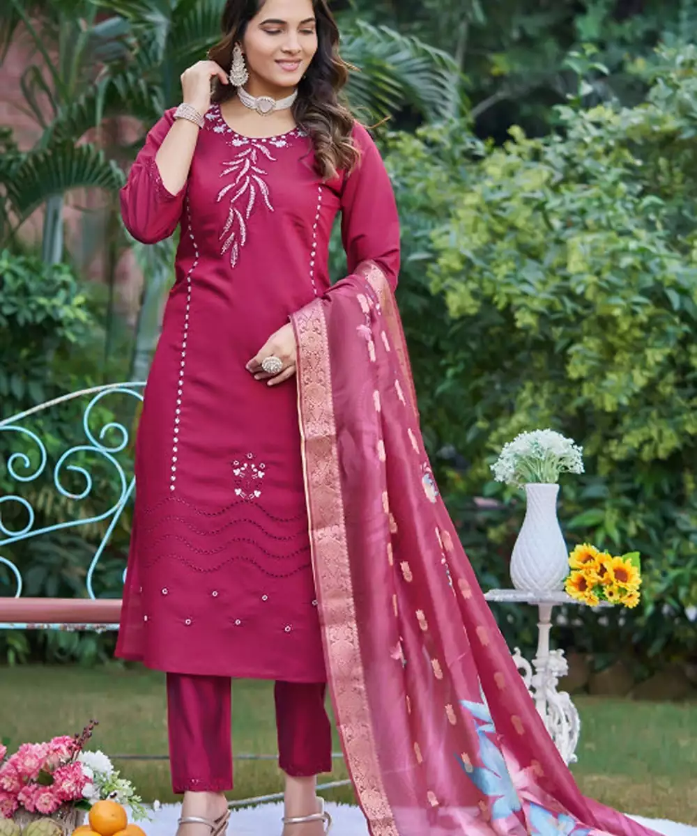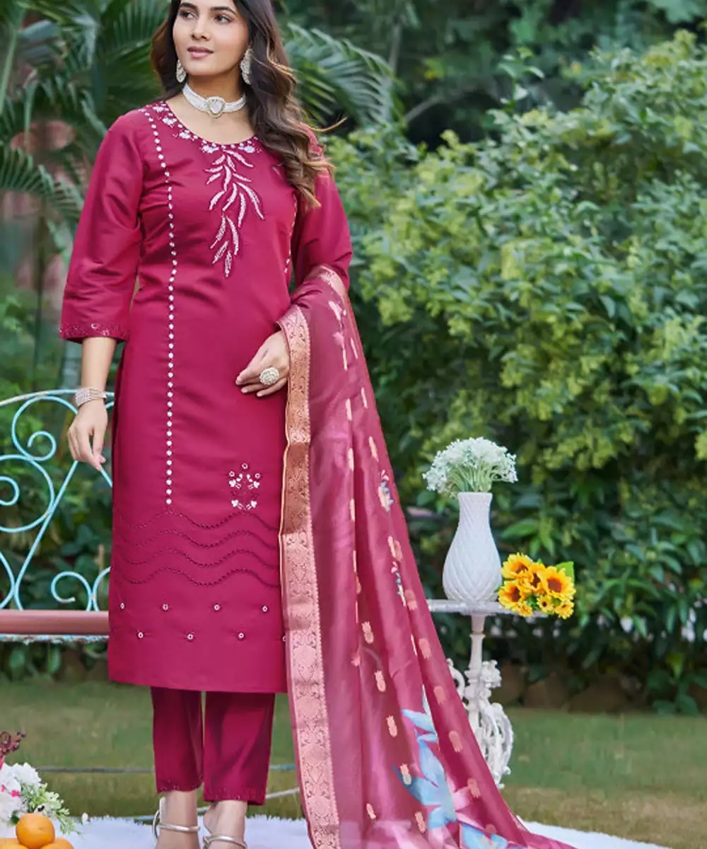 Magenta Embroidered Kurta With Trousers With Dupatta Kurta Design:
