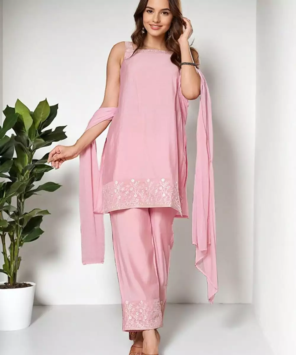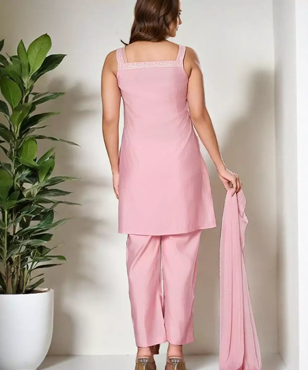 Pink Embroidered Kurta With Trousers With Dupatta Kurta Design: