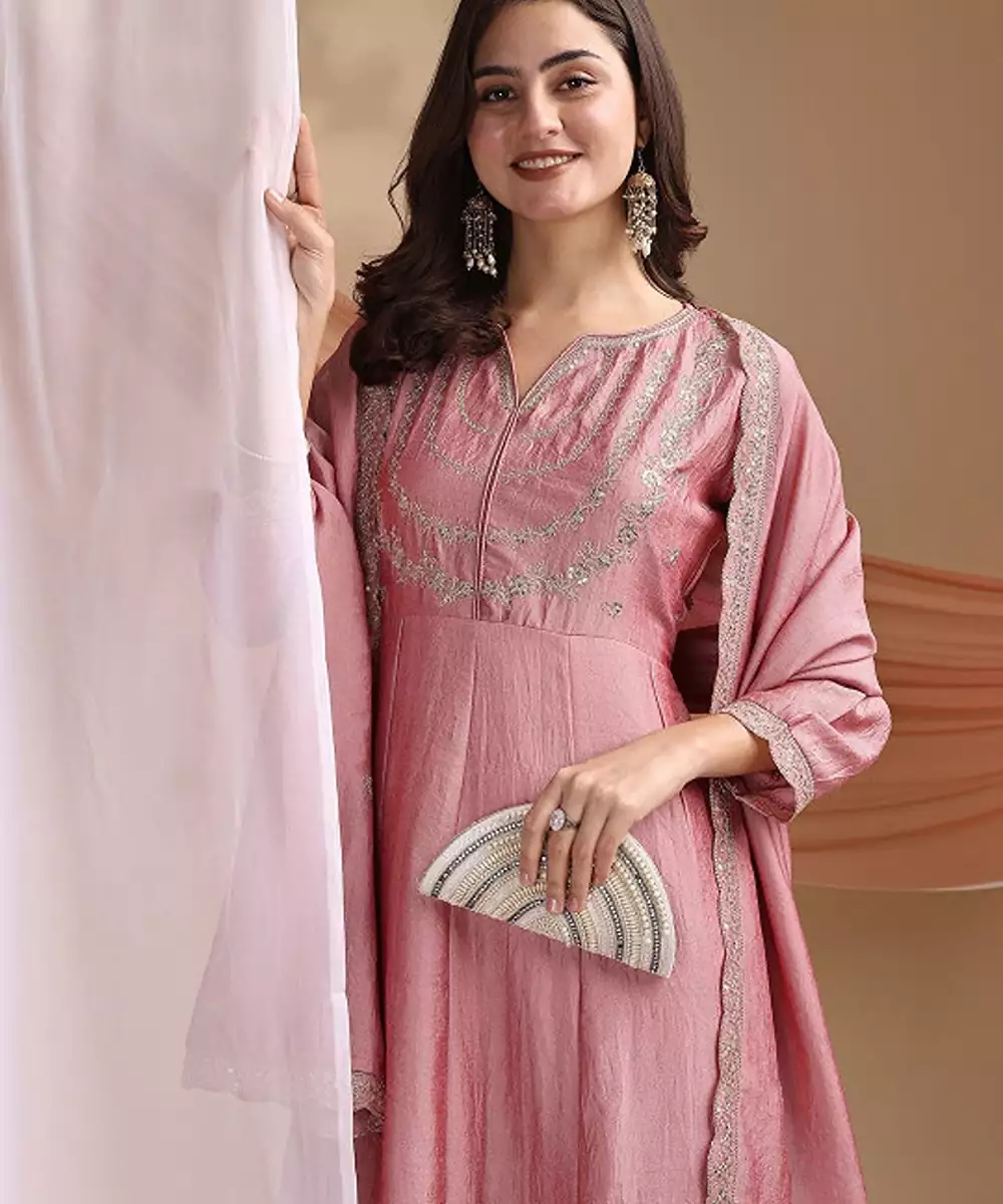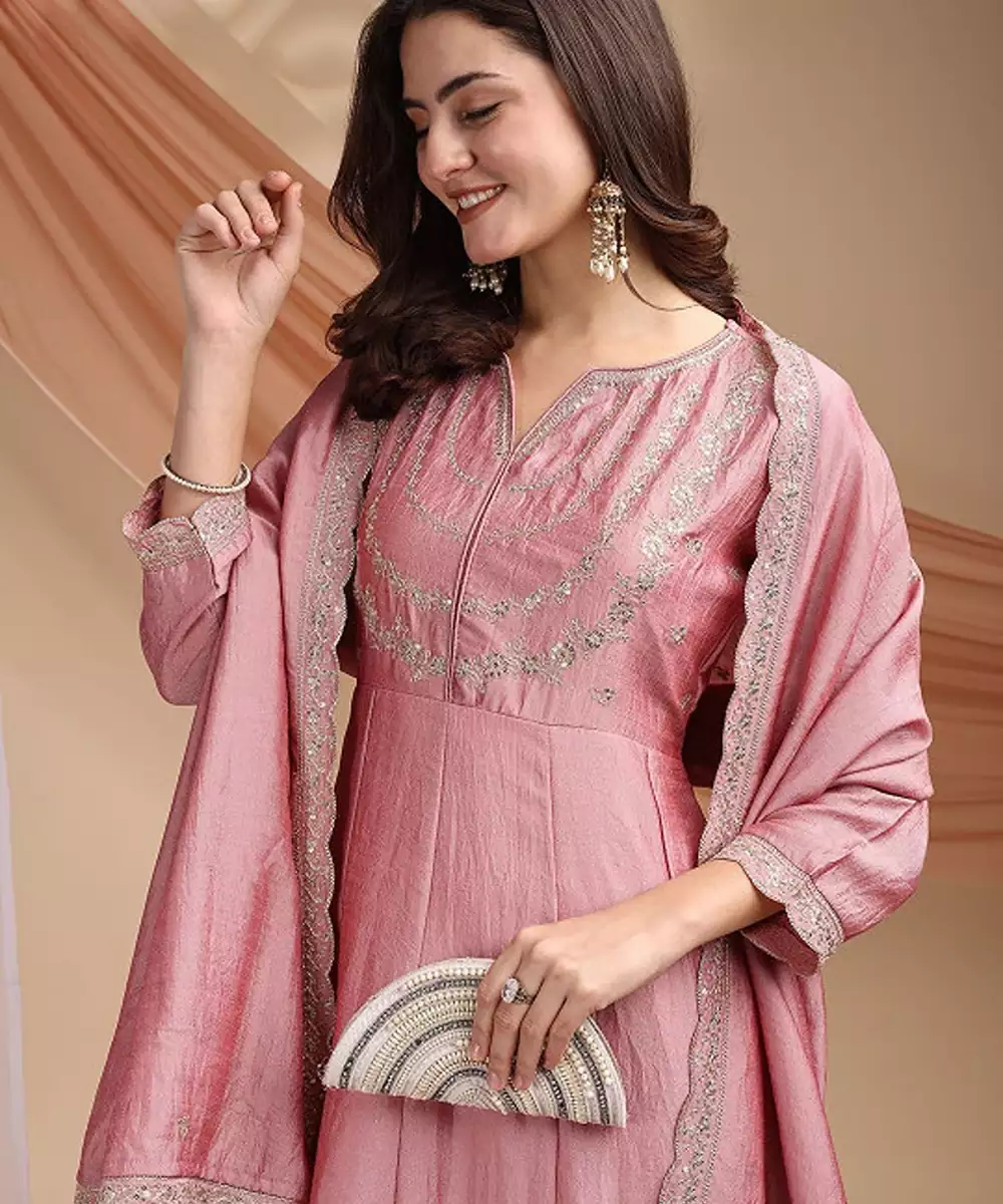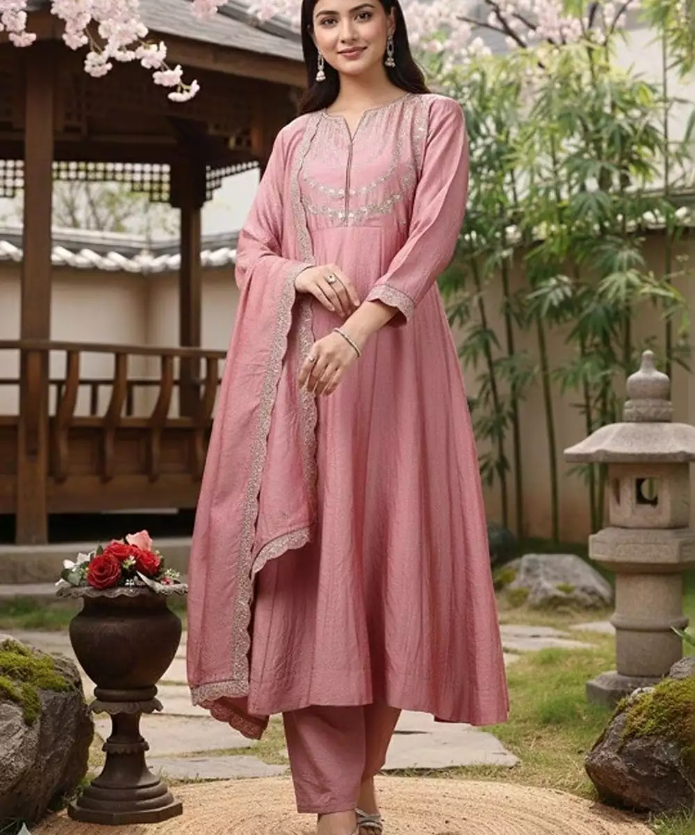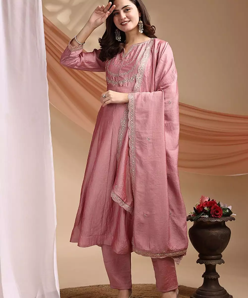 Embroidered Round Neck Kurta & Trousers With Dupatta