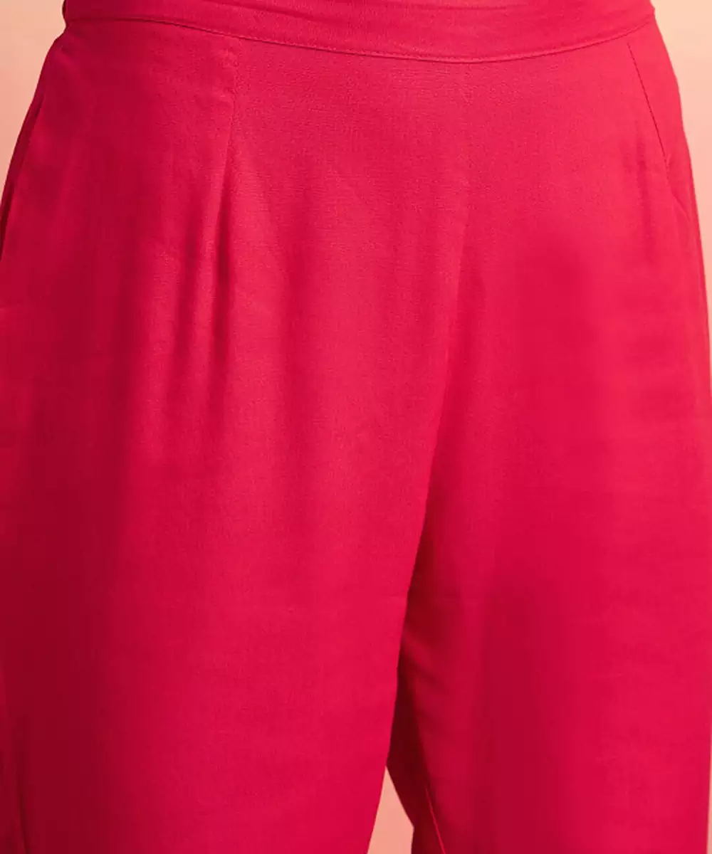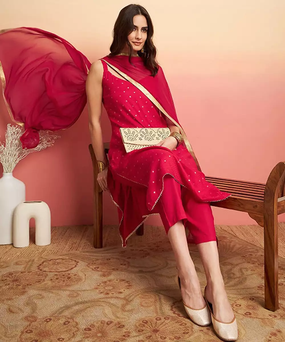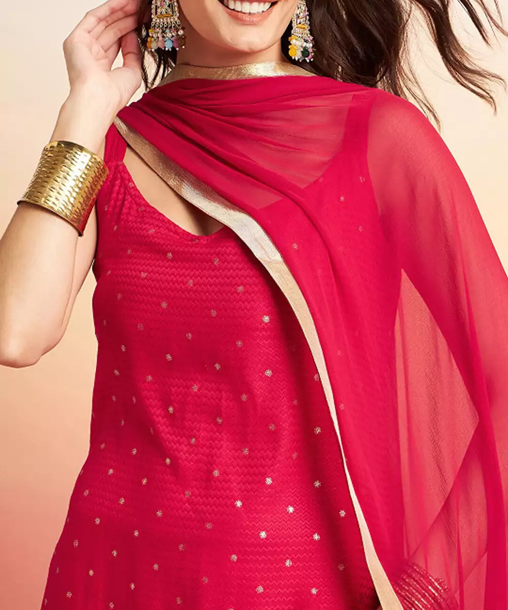 This Kurta Set Consists Of Kurta, Trousers And Dupatta Kurta Design Red Kurta Printed Round Neck Shoulder Straps Straight Shaped Calf Length With Straight Hem And Side Slits Machine Weave Regular Viscose Rayon Trousers Design: Red Solid Trousers Elasticated Waistband Slip On Closure Dupatta Design: Red Dupatta Solid With Taping Border