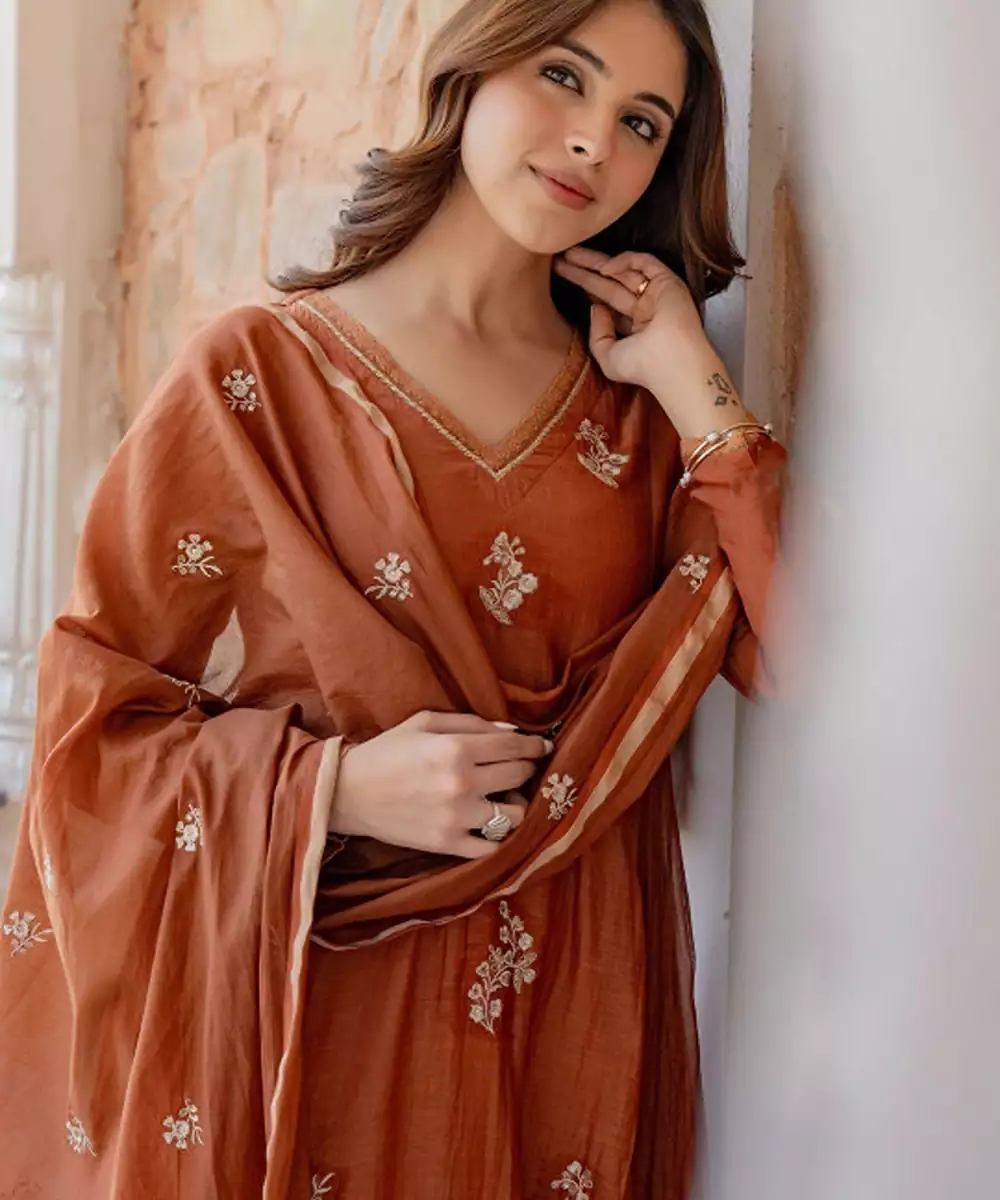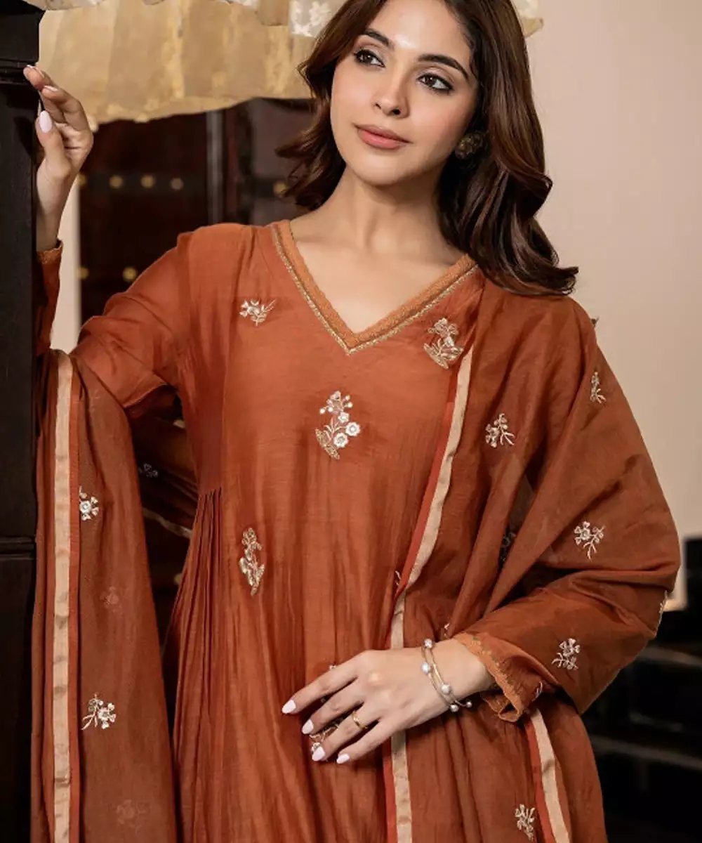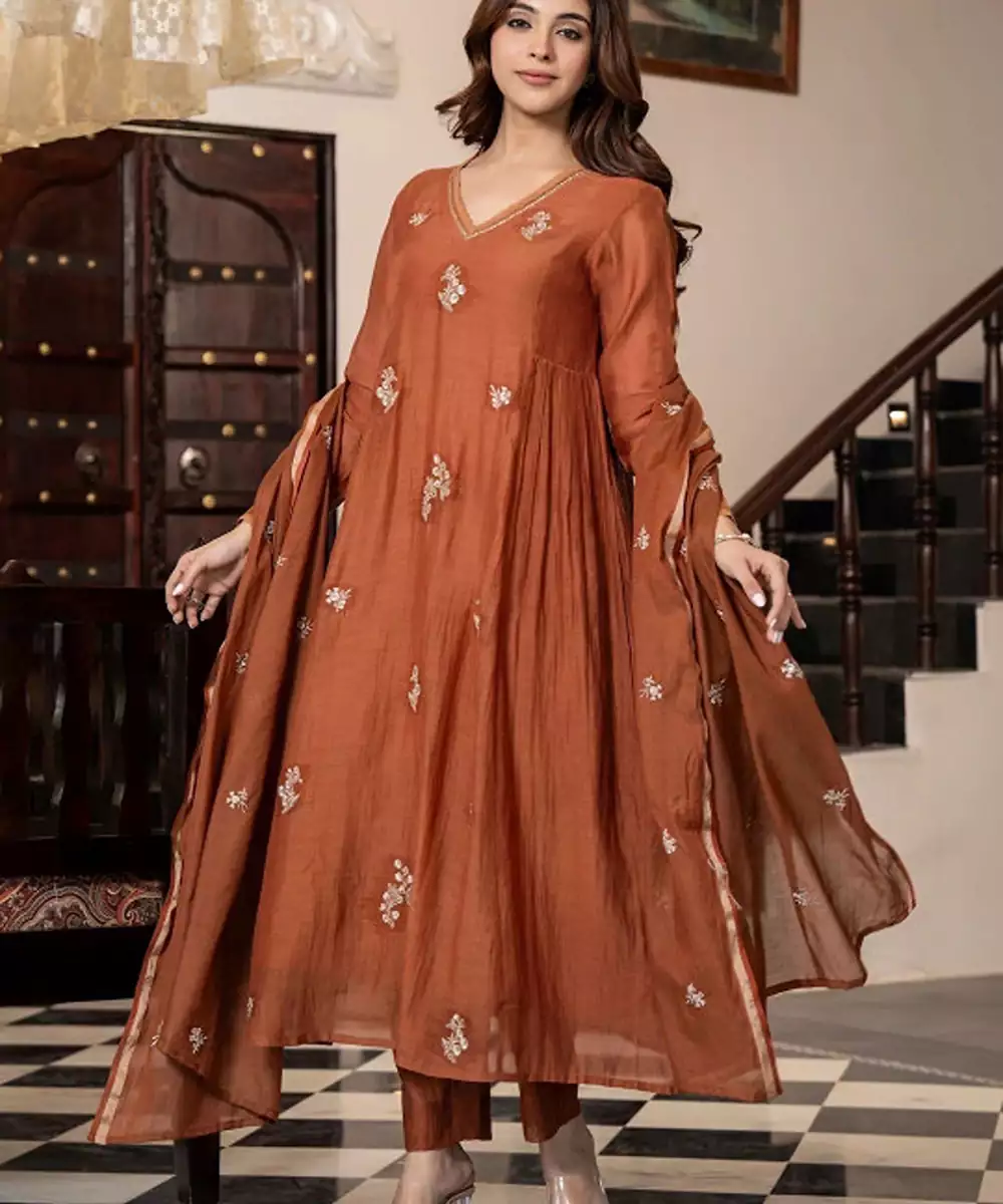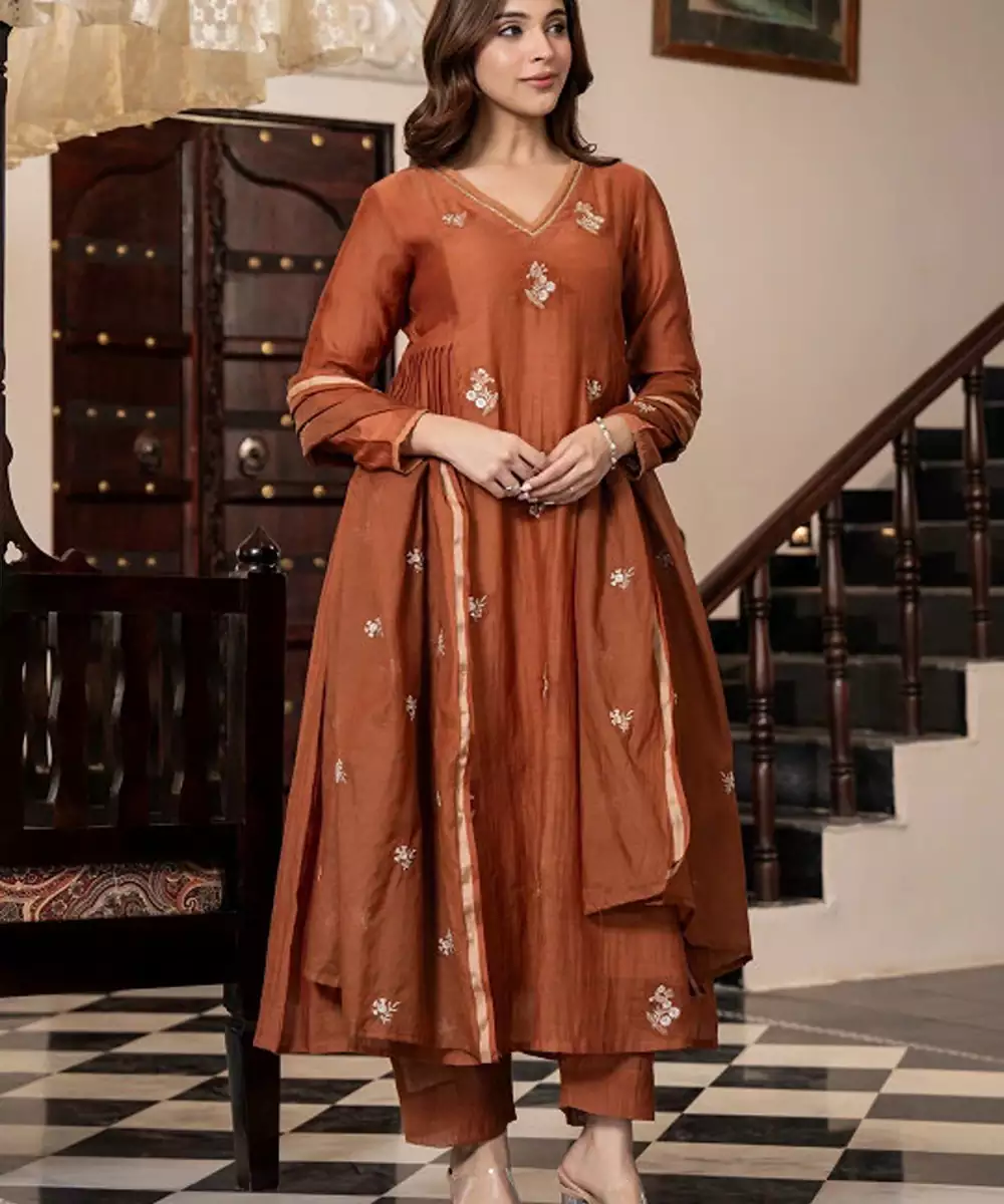 Rust Embroidered Kurta With Trousers With Dupatta Kurta Design: