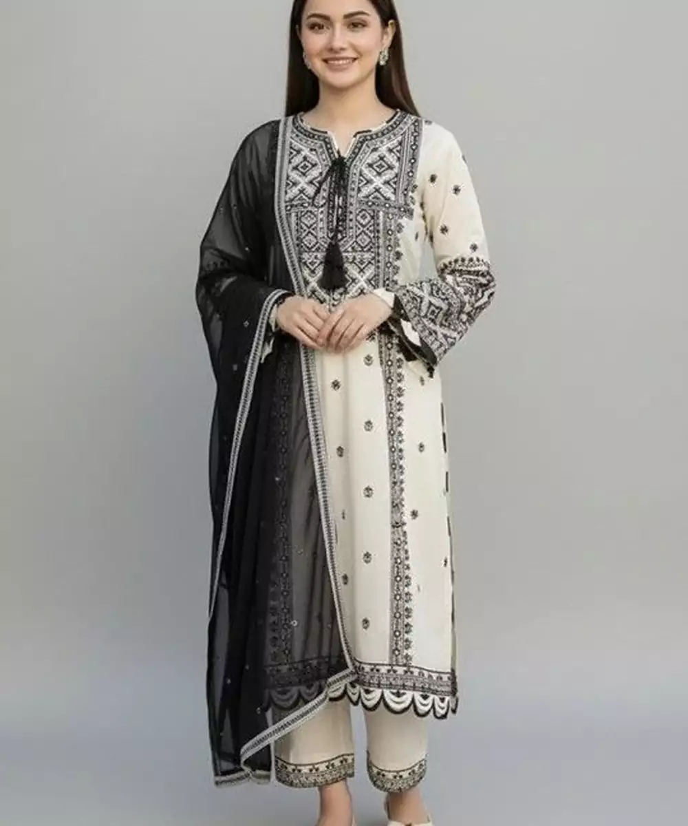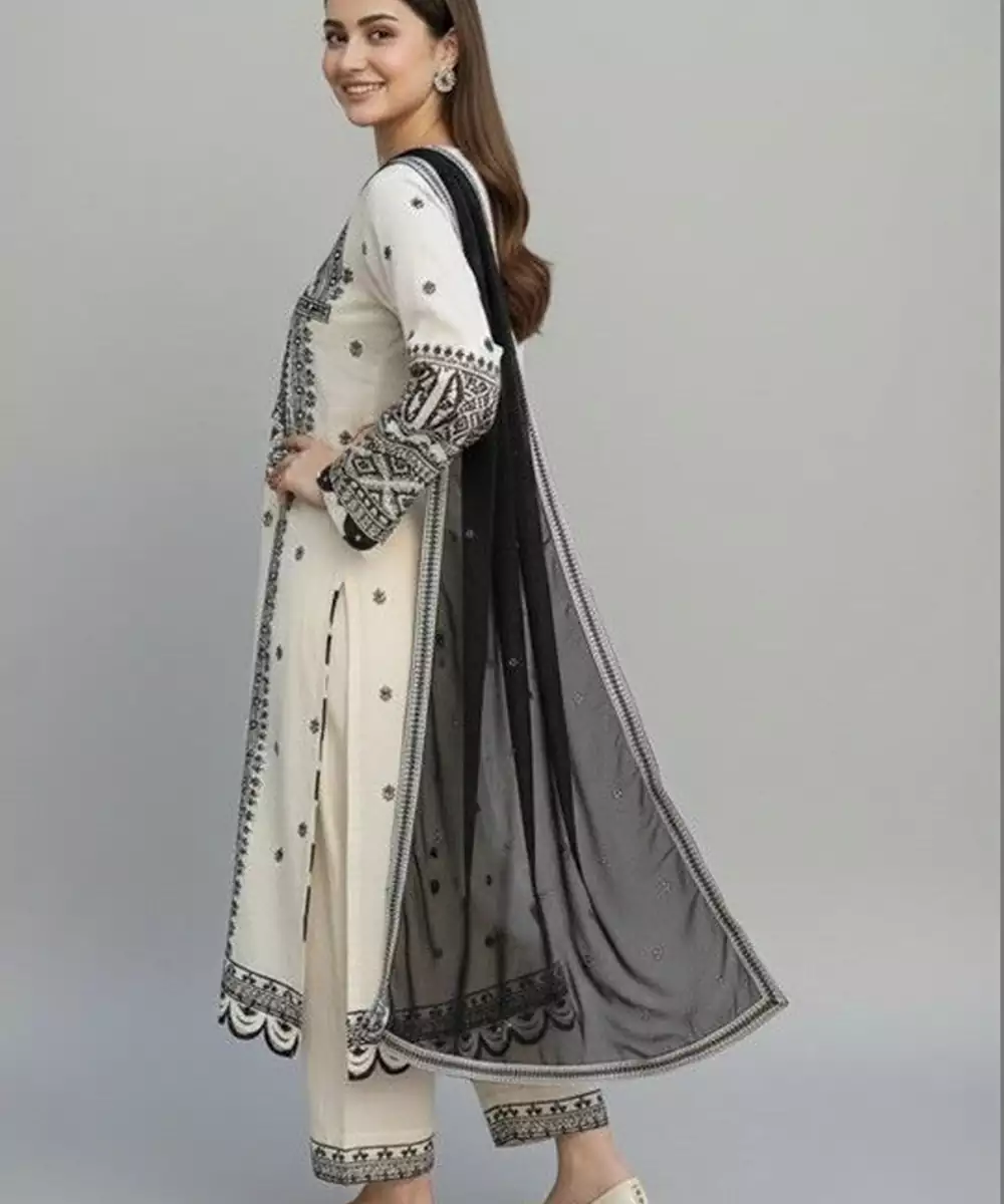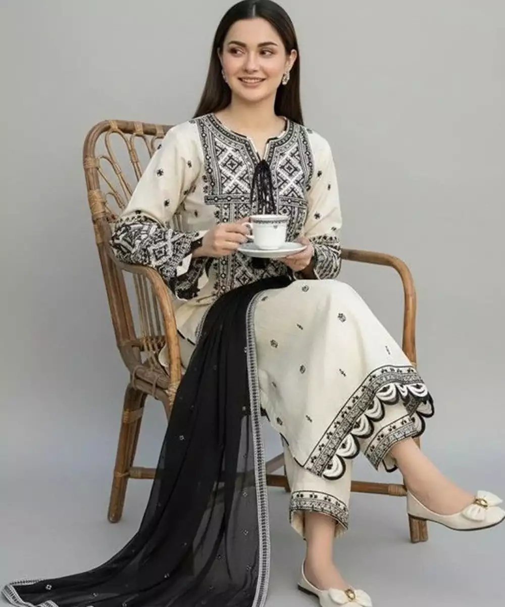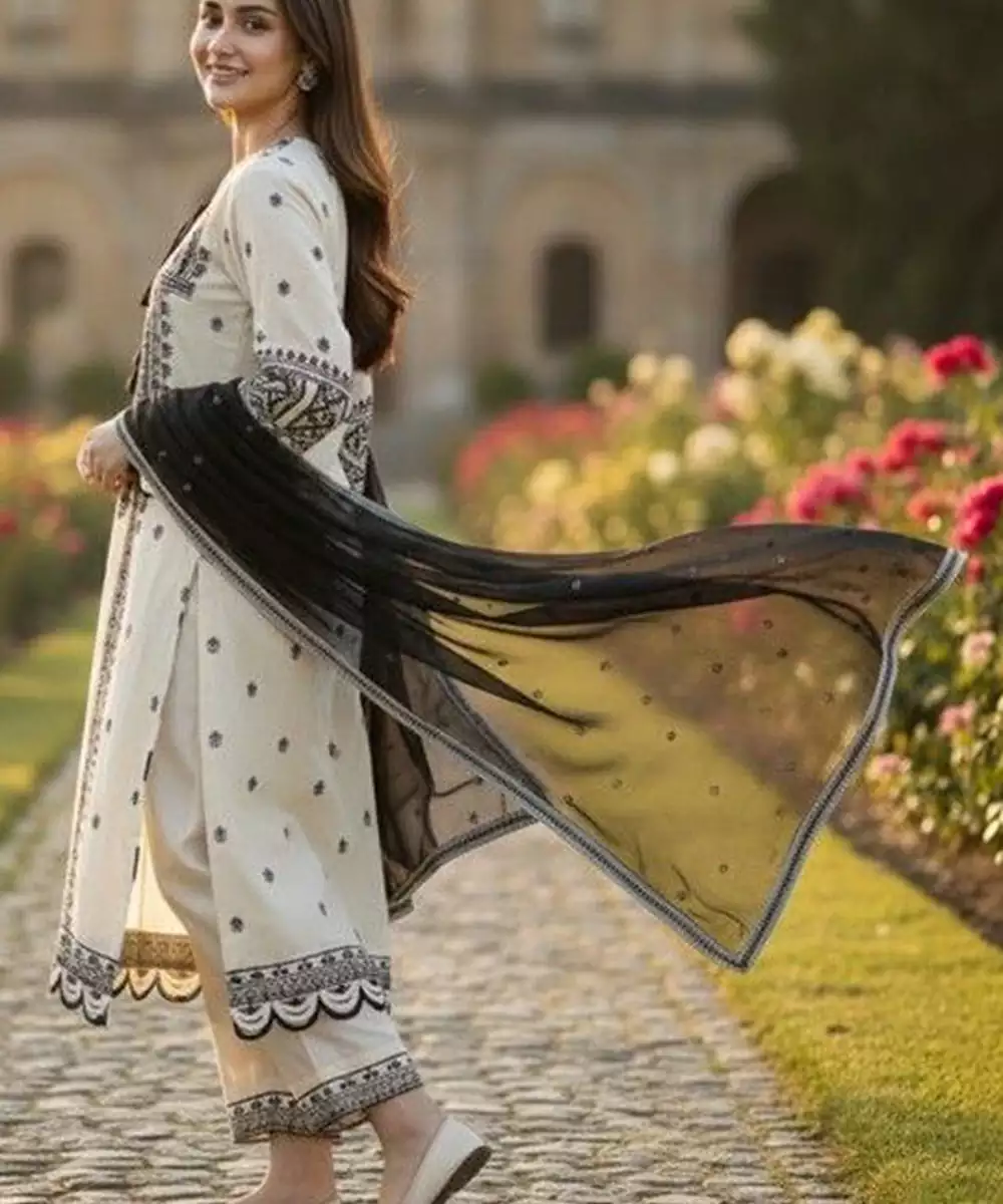 Off White Embroidered Kurta With Trousers With Dupatta Kurta Design:
