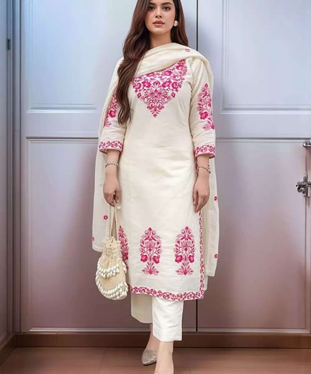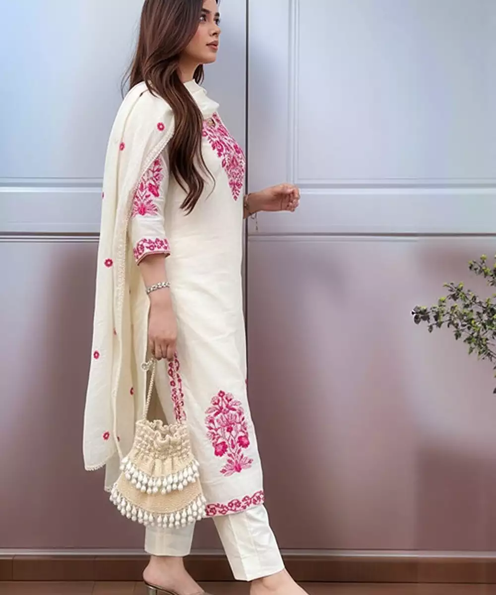 Cream Coloured Embroidered Kurta With Trousers With Dupatta Kurta Design: