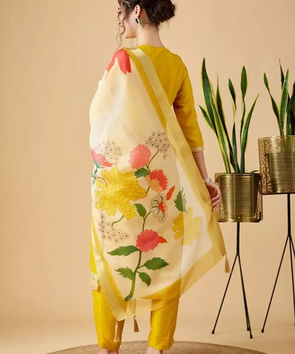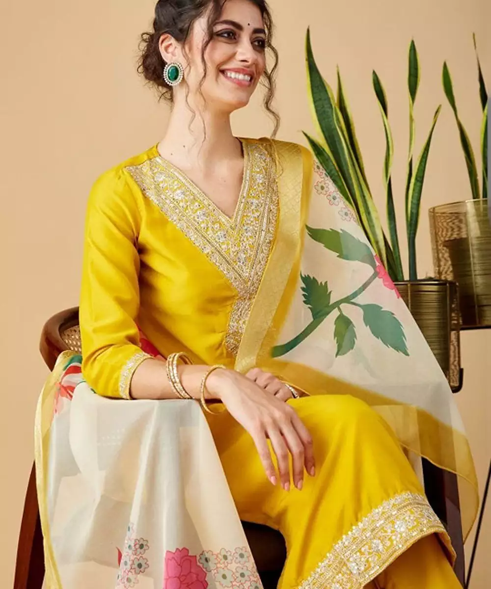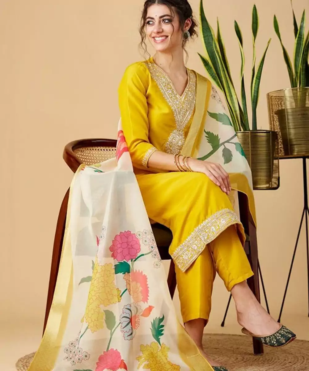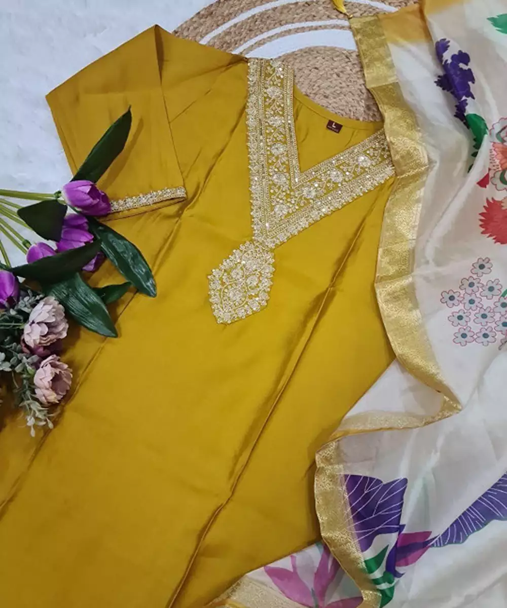 Yellow Embroidered Kurta With Trousers With Dupatta Kurta Design: