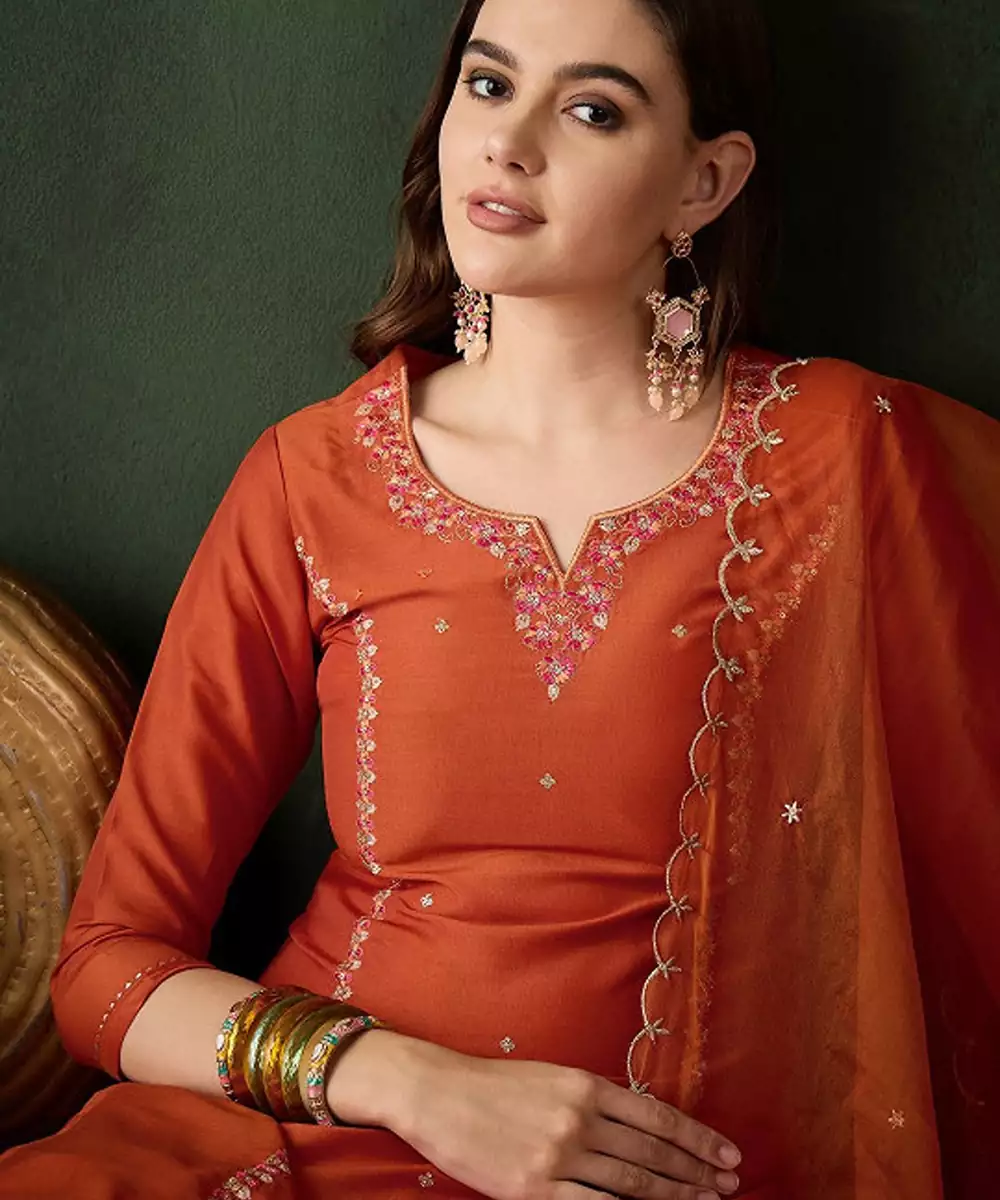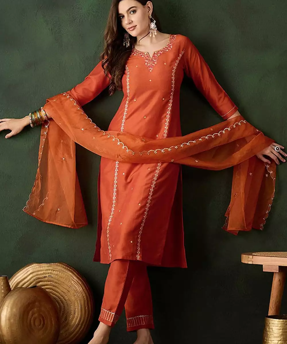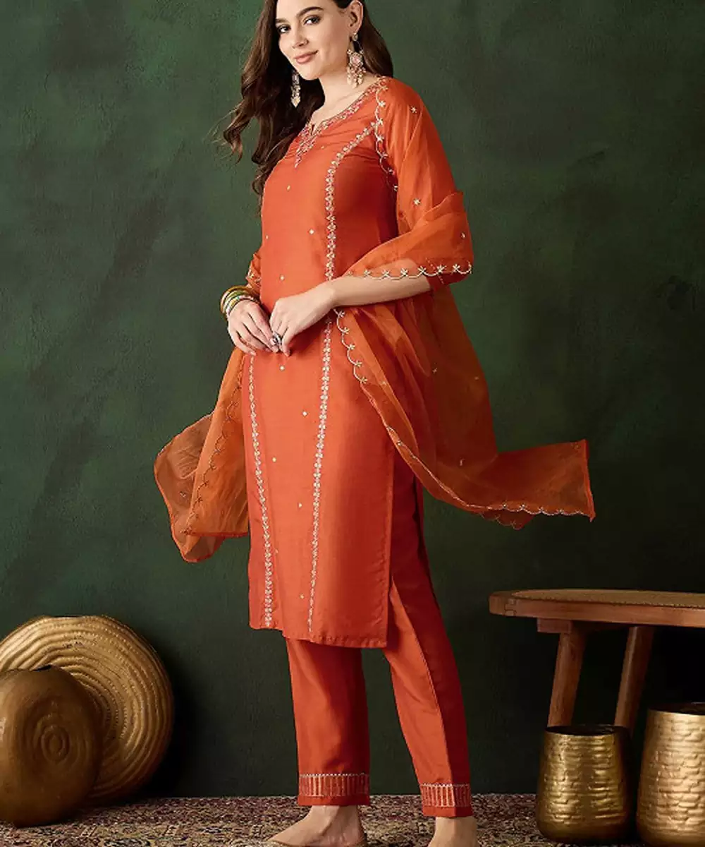 Floral Embroidered Sequinned Straight Kurta & Trouser With Dupatta