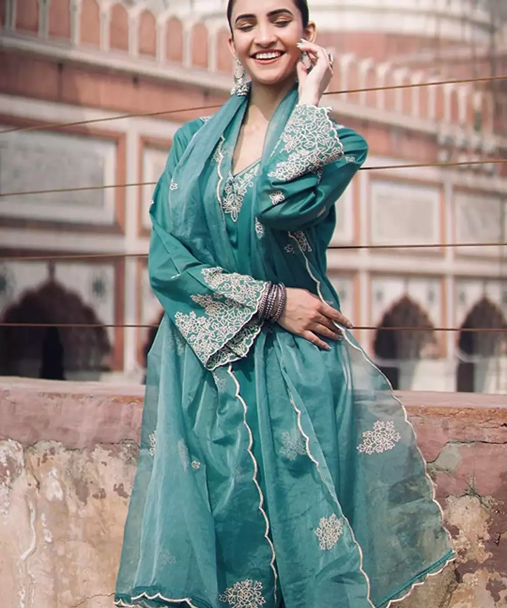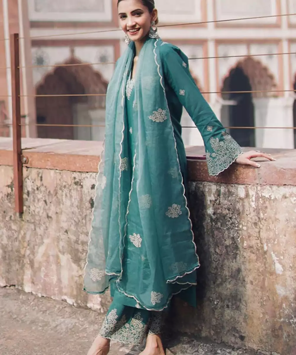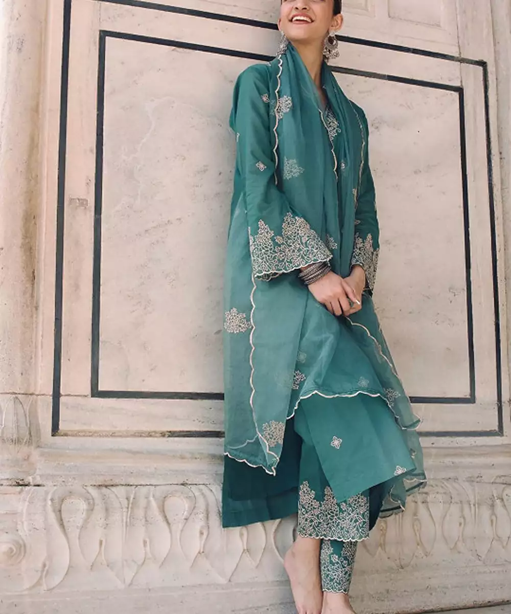 Green & Off White Embroidered Kurta With Palazzos With Dupatta Kurta Design: