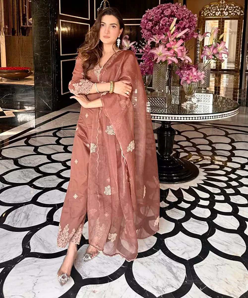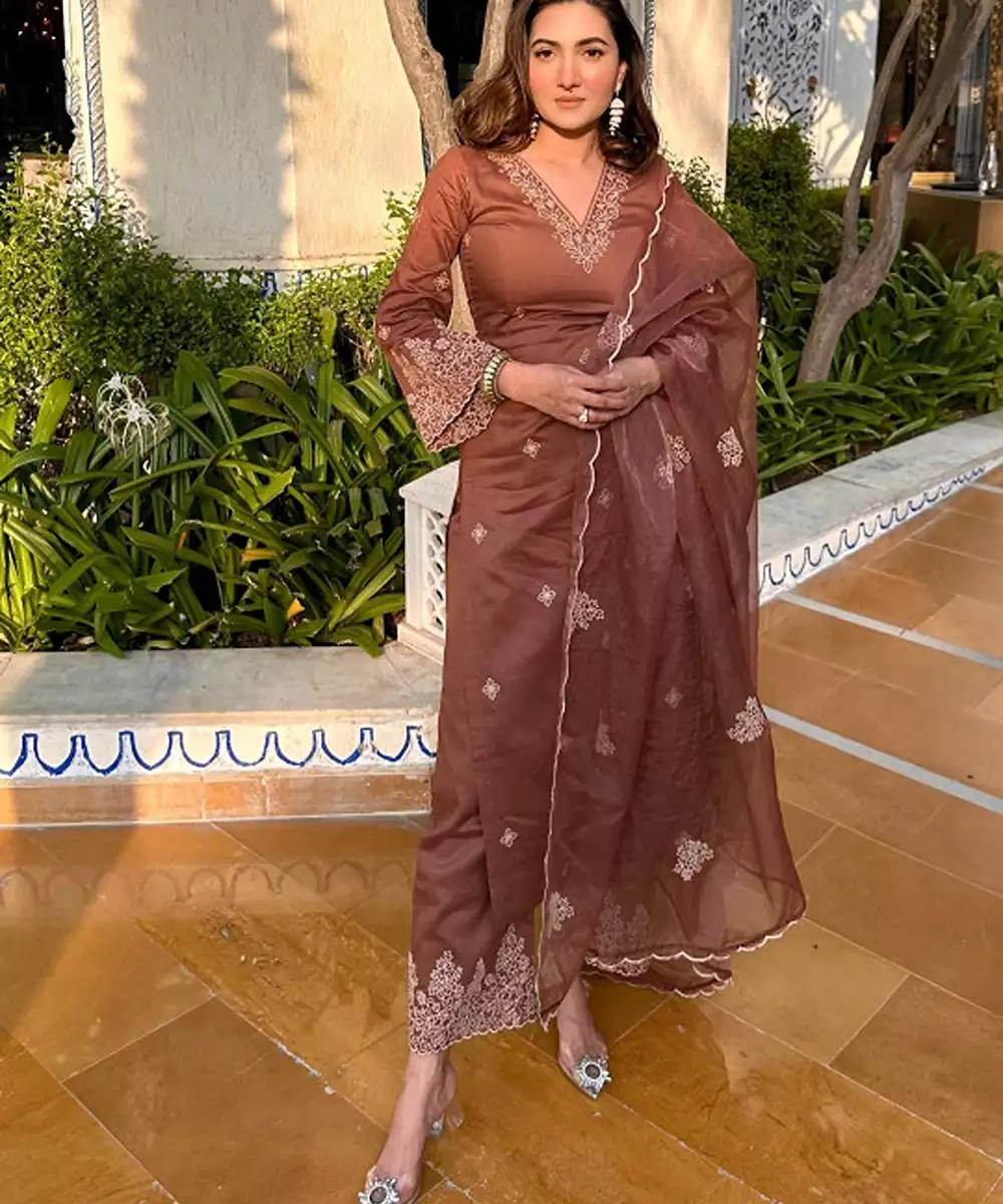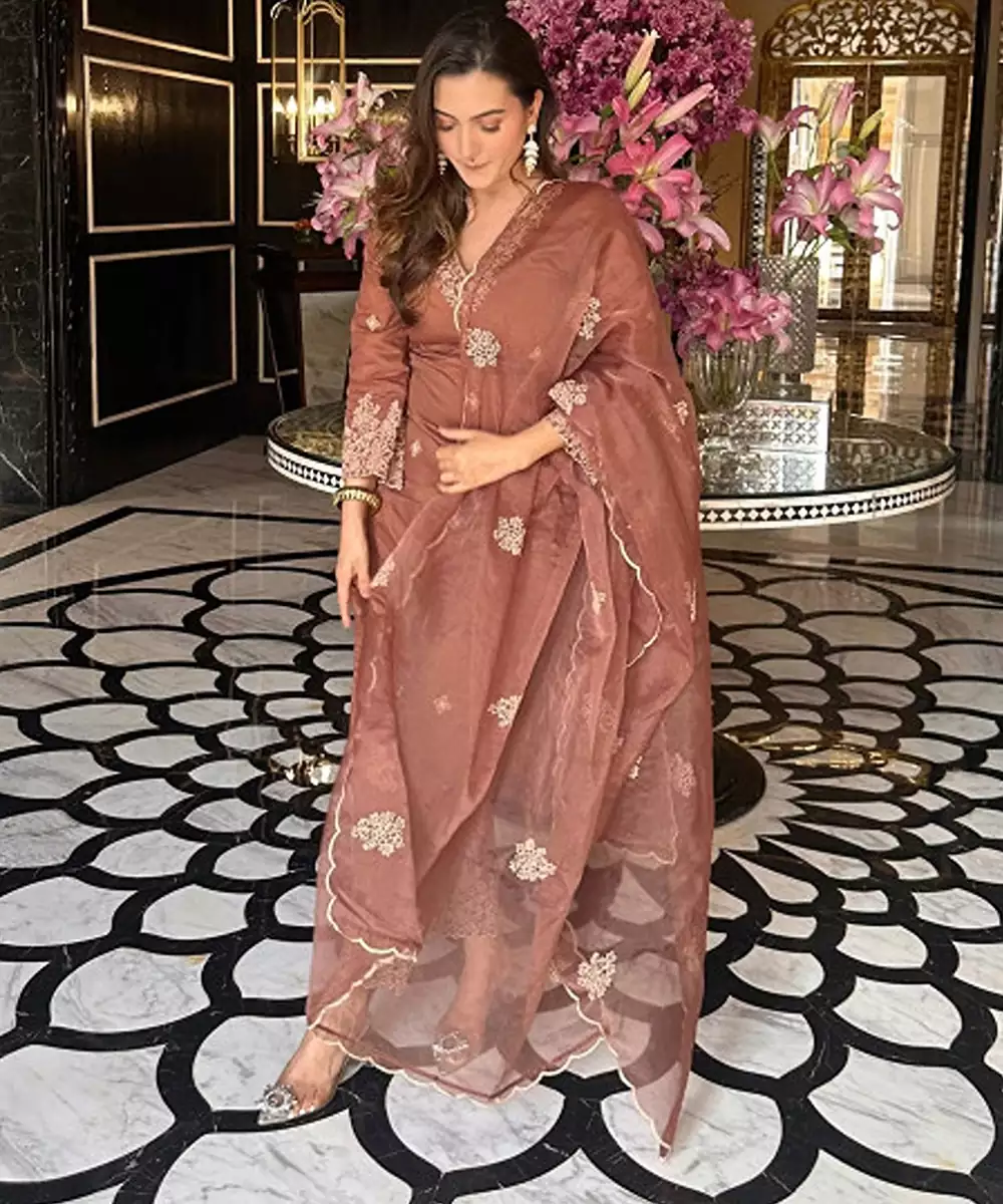 Brown Embroidered Kurta With Trousers With Dupatta Kurta Design: