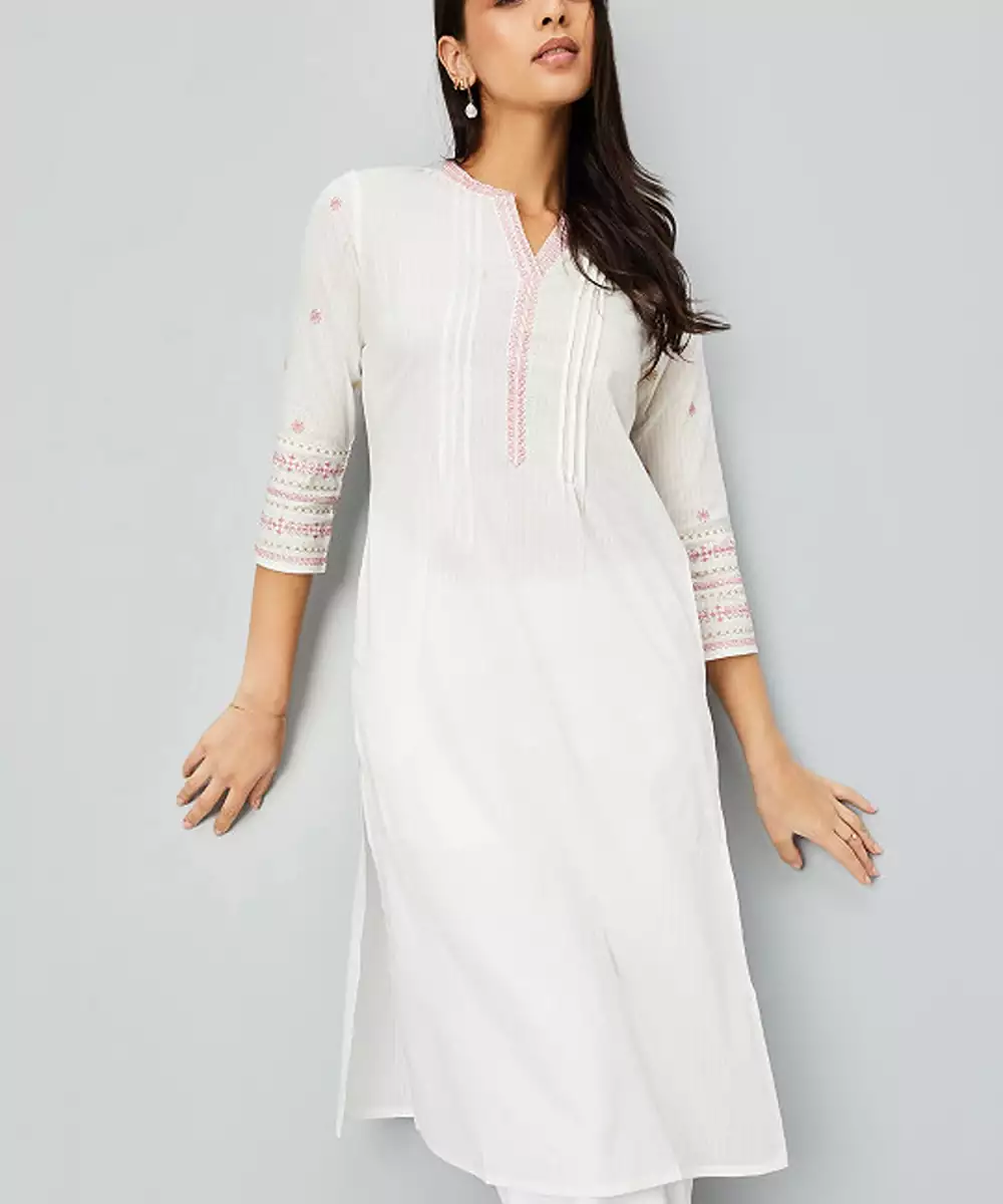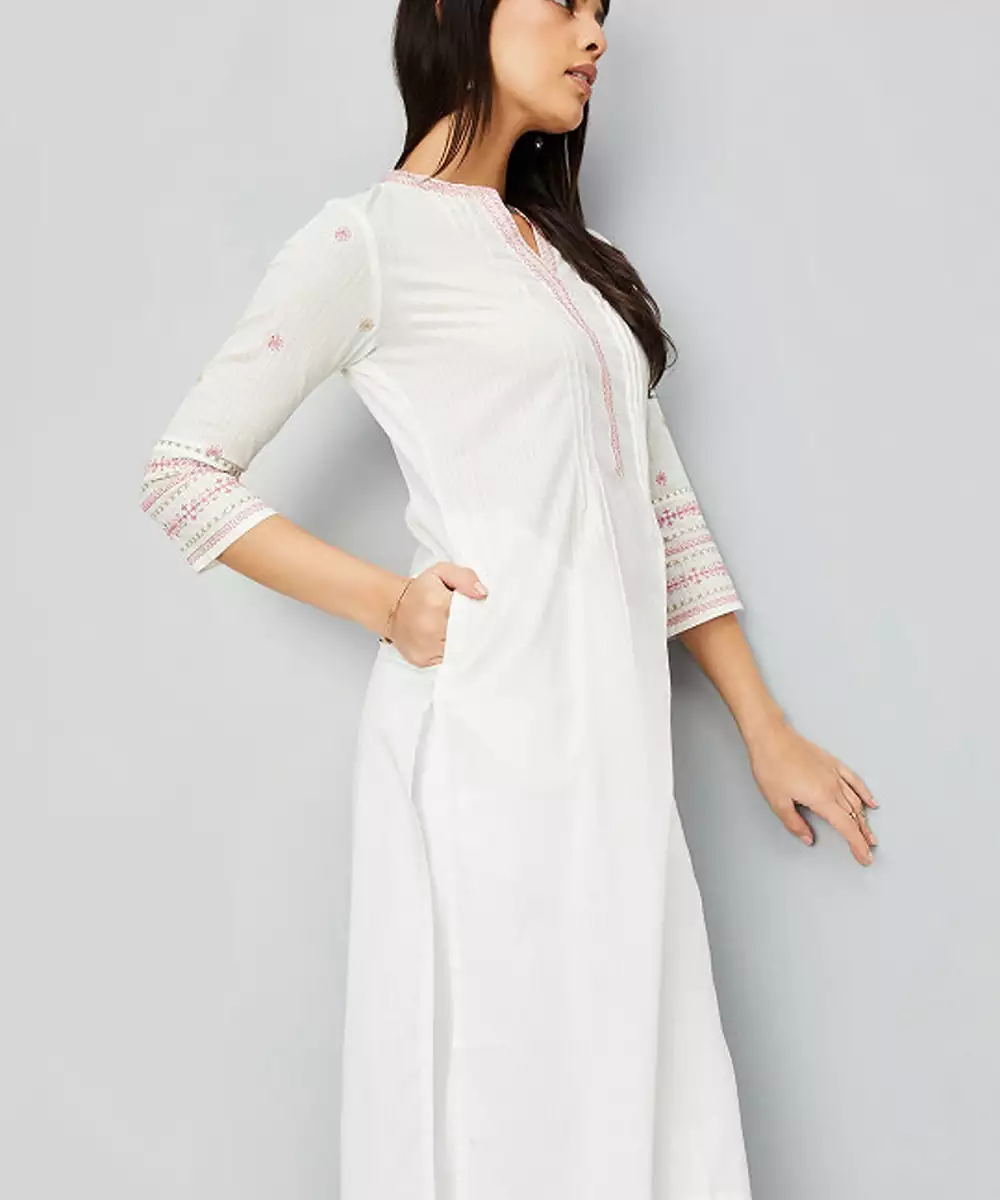 Floral Mandarin Collar Three Quarter Sleeves Thread Work Cotton Kurta