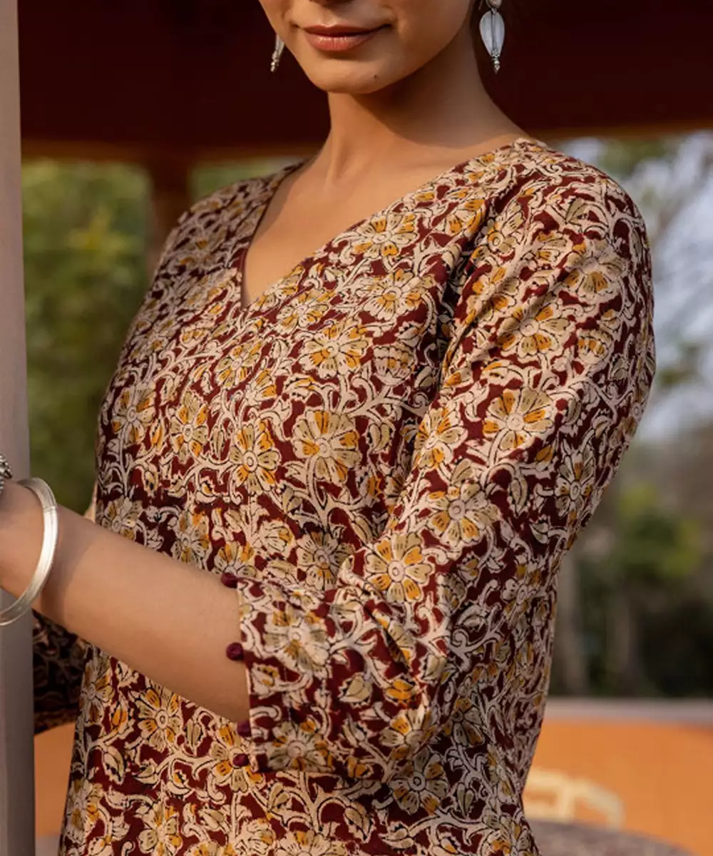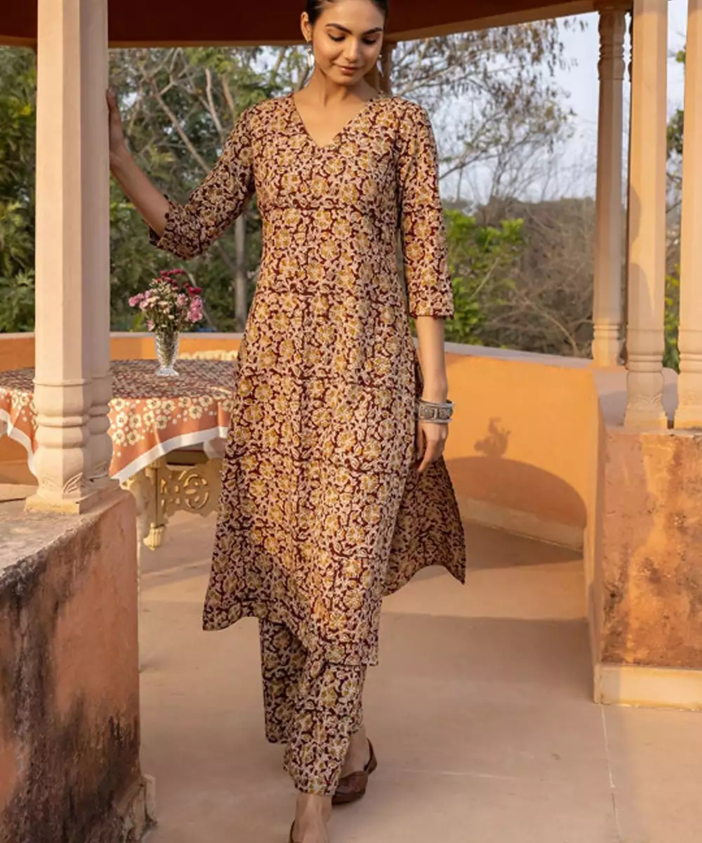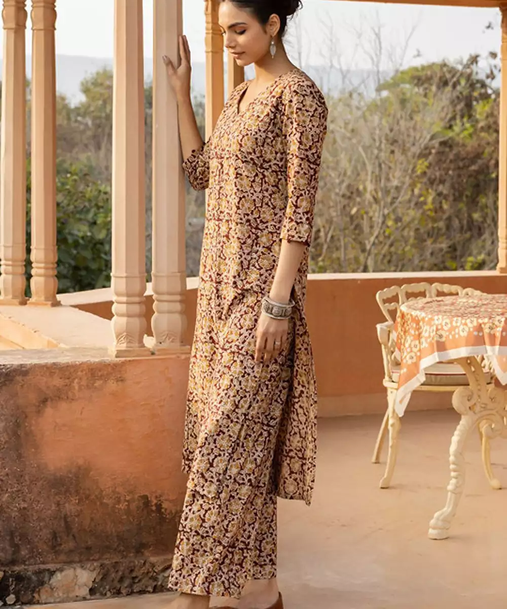Maroon, Mustard, Beige Printed Kurta With Trousers Floral Printed Maroon Kurta Straight Shape V Neck Three Quarter Sleeves Slip On Closure