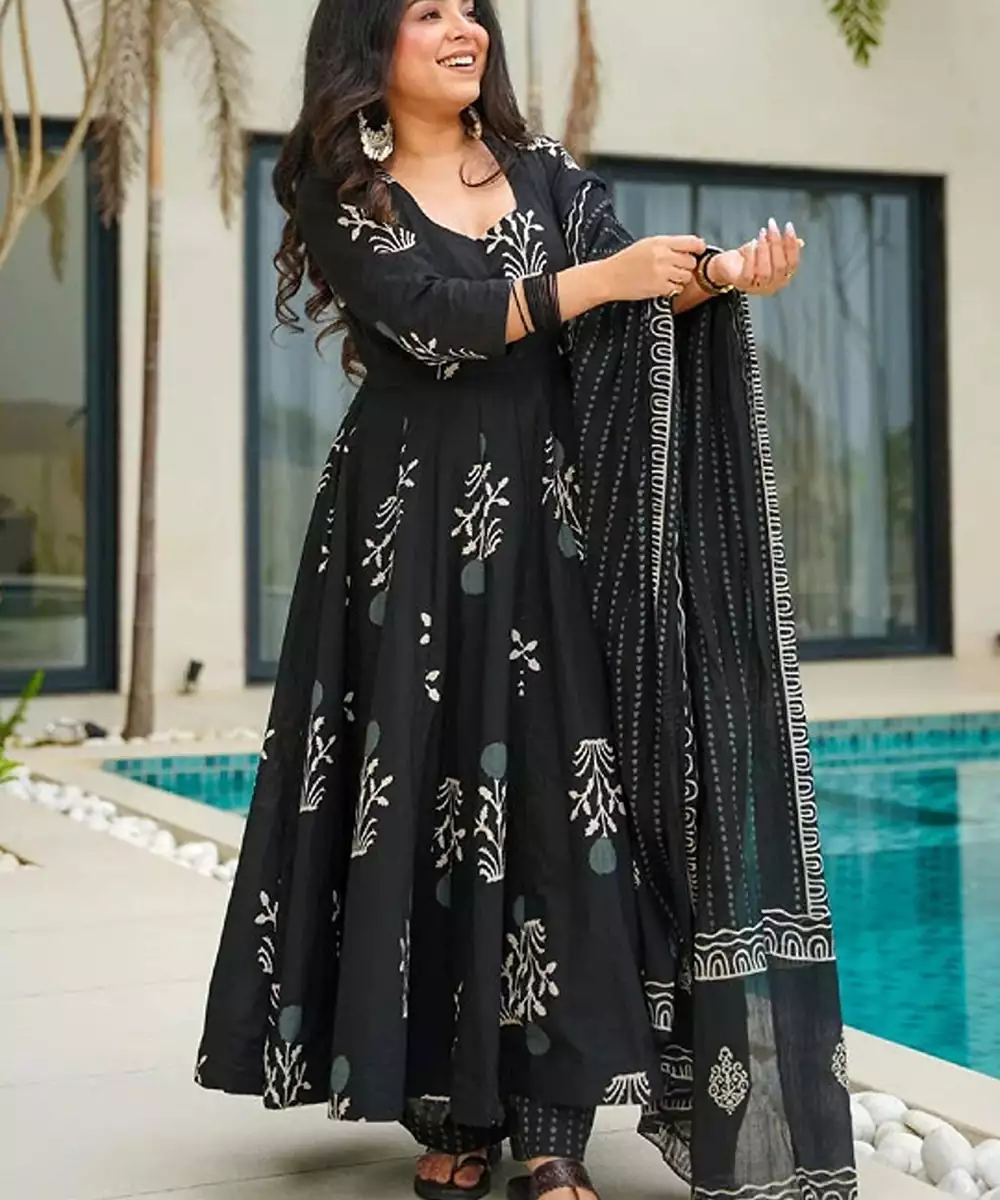 Black & White Printed Kurta With Trousers Floral Printed Black Kurta Anarkali Shape Scoop Neck Three Quarter Sleeves