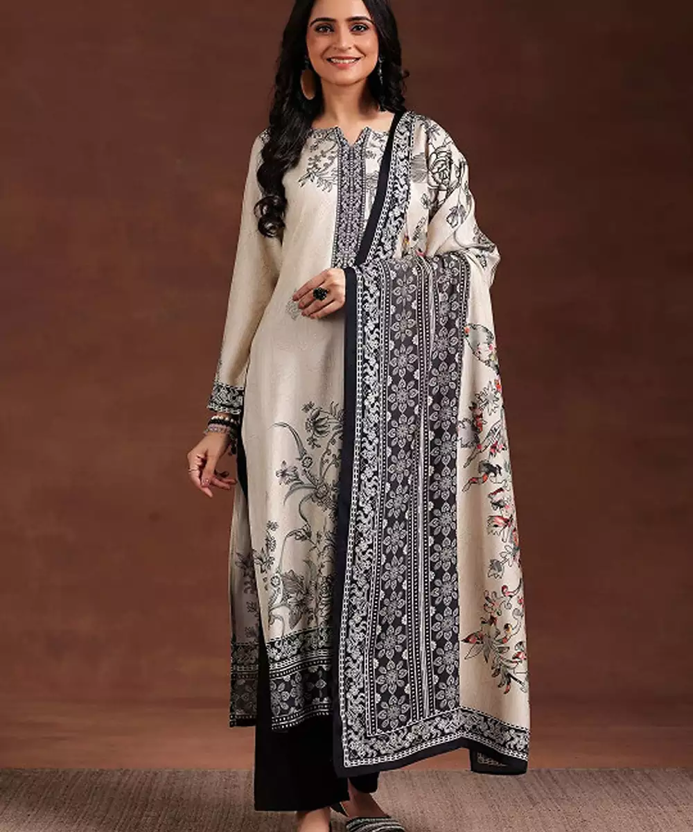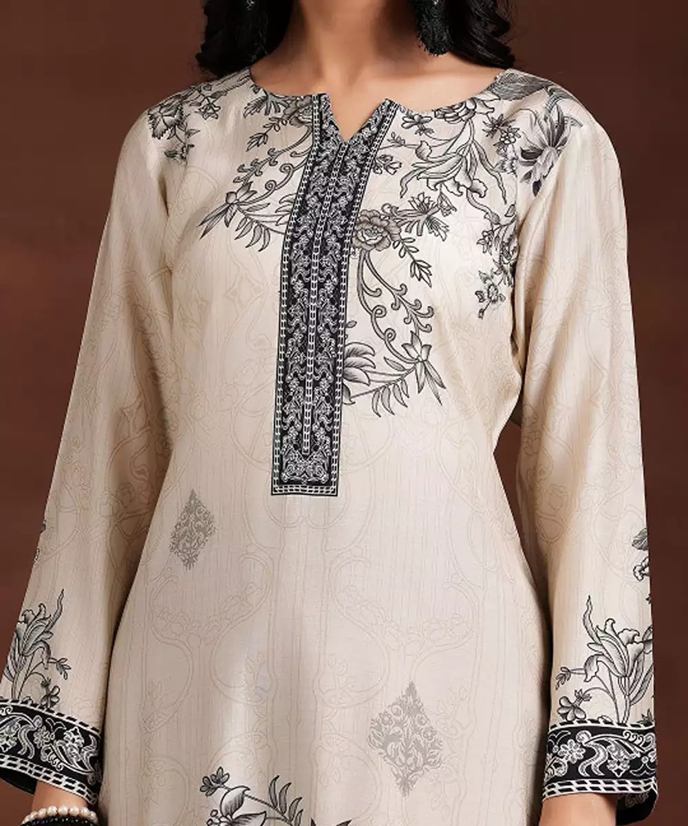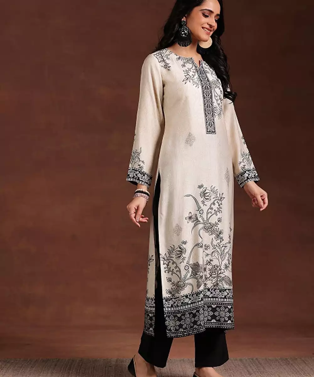White & Black Printed Kurta With Trousers Floral Printed White Kurta Straight Shape Sweetheart Neck Long Sleeves Slip On Closure