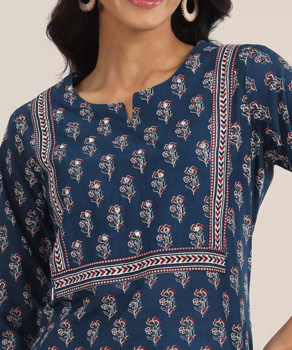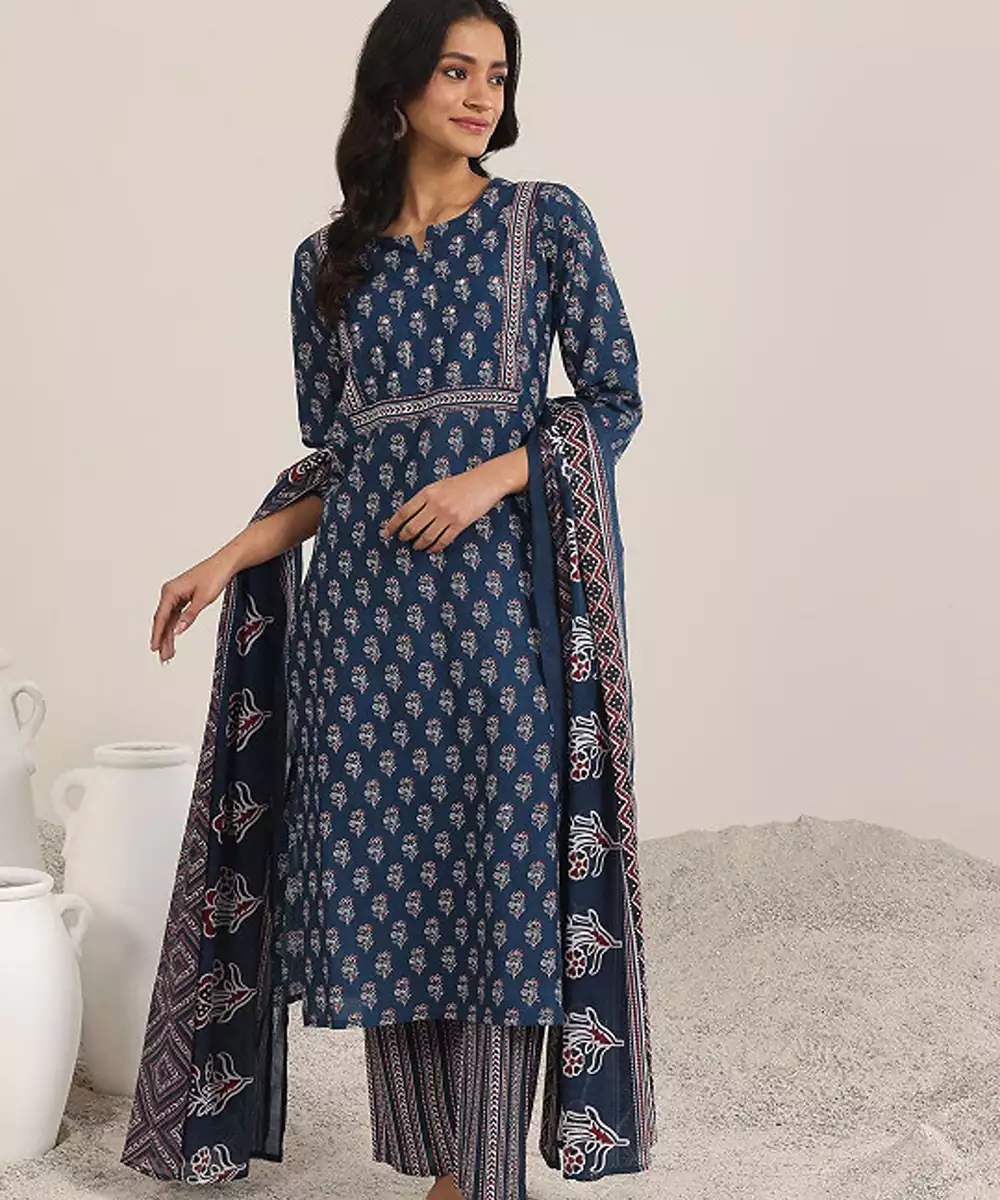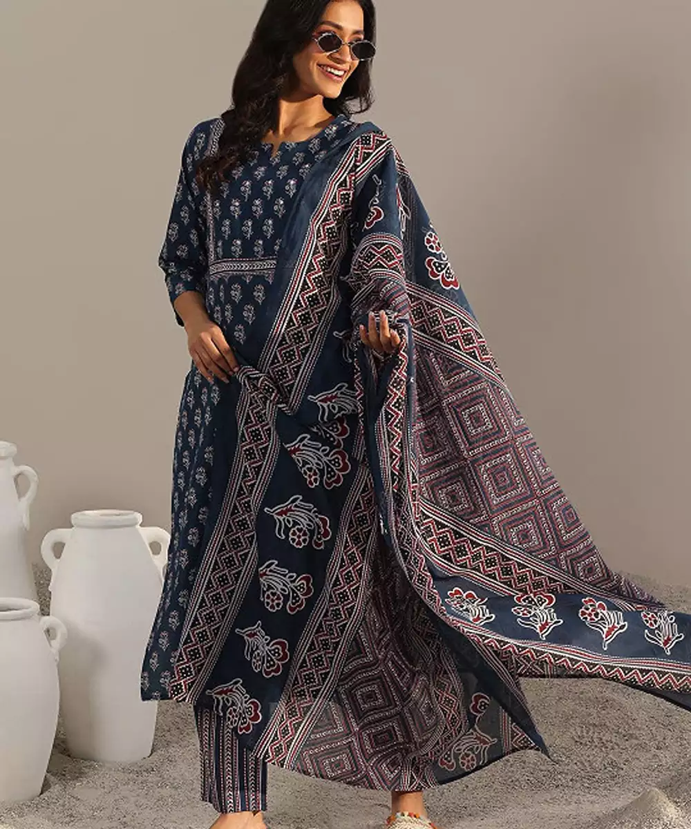 Blue, White Printed Kurta With Trousers And Dupatta Kurta Design: