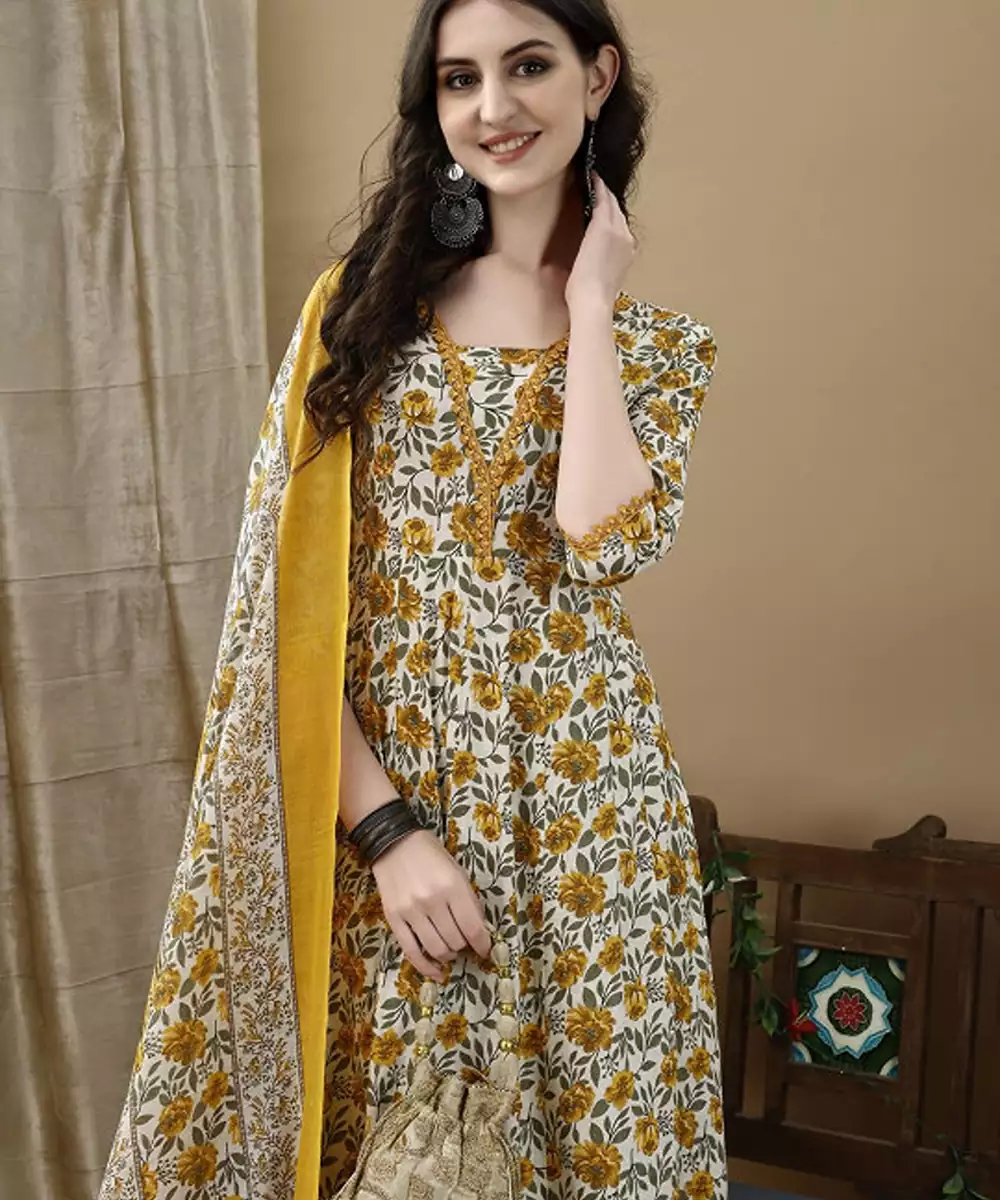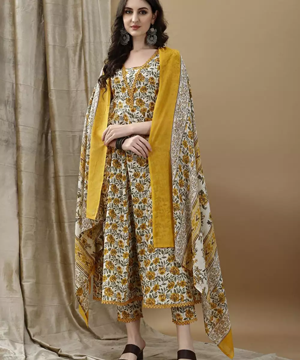 Floral Printed Pure Cotton Anarkali Kurta With Trousers & Dupatta