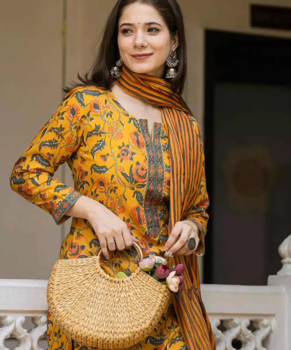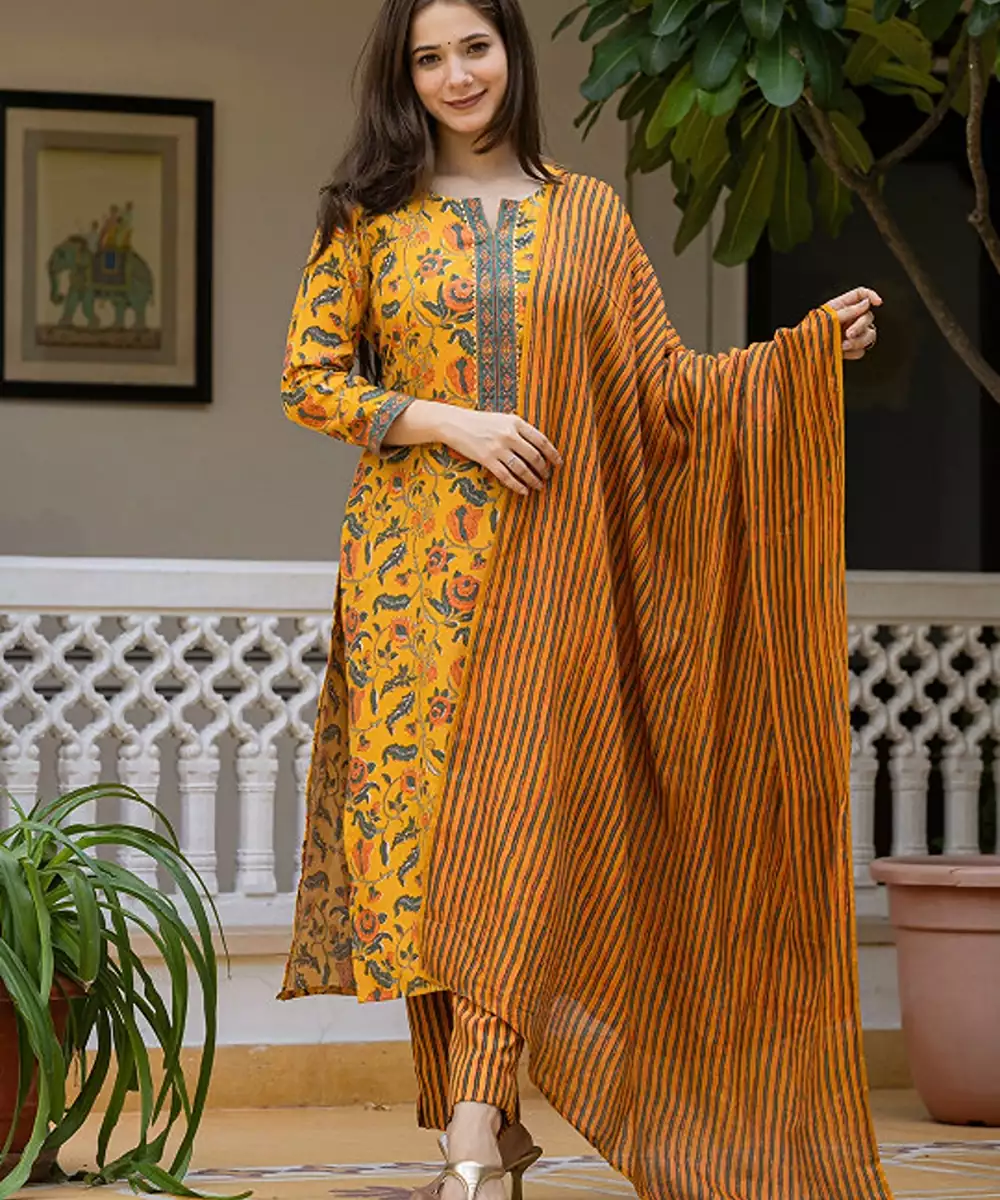 Yellow Printed Kurta With Trousers With Dupatta Kurta Design: