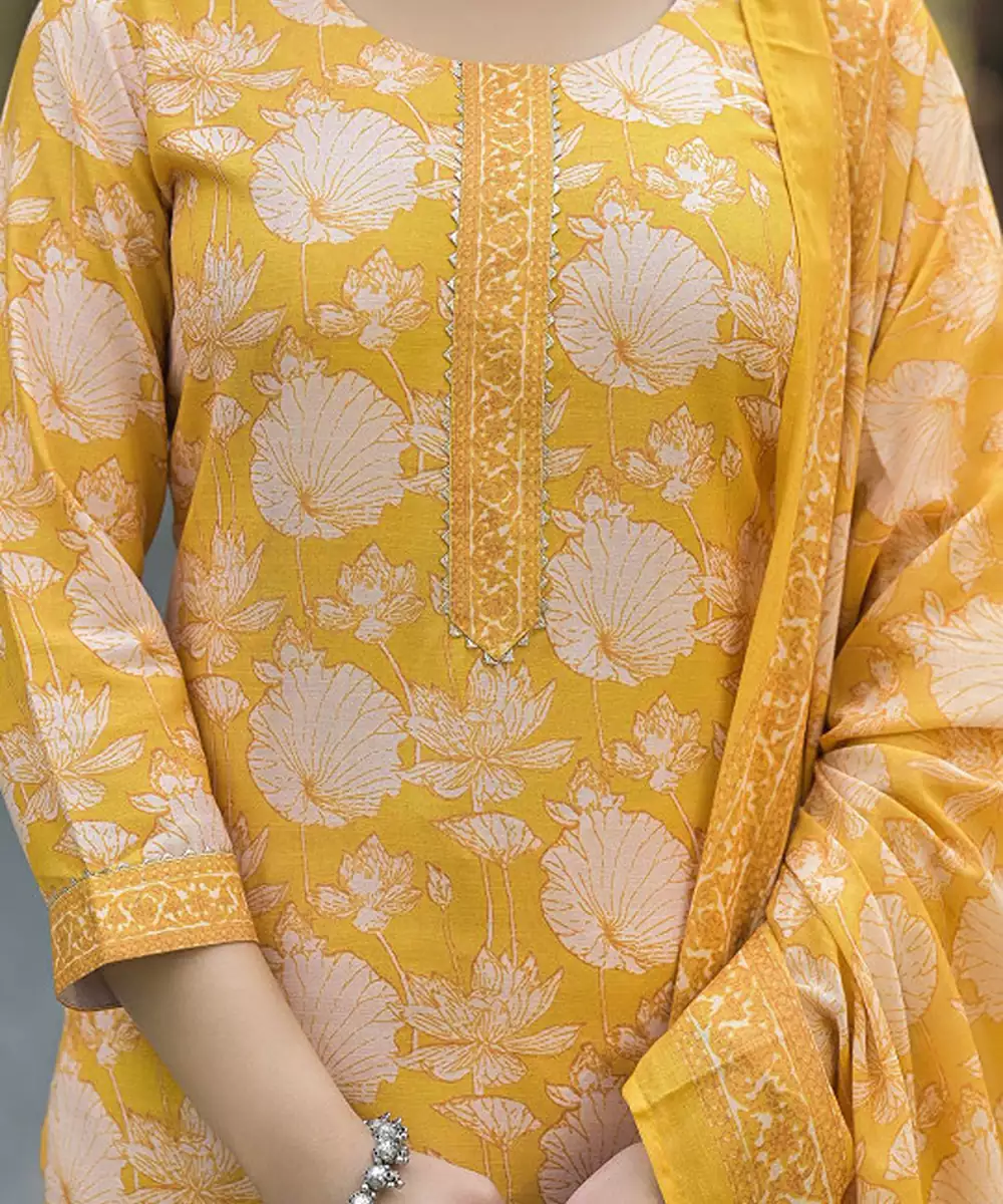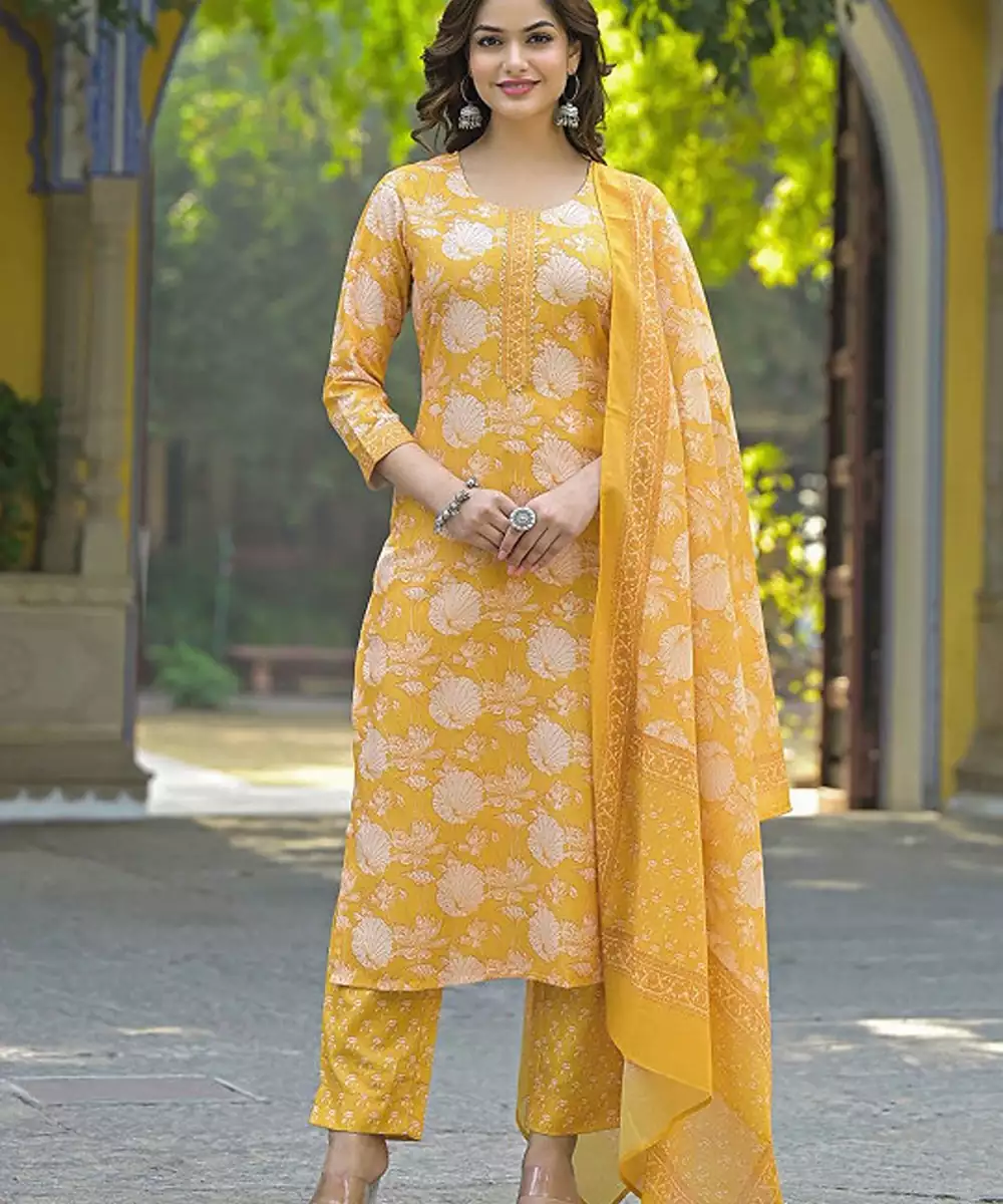 Yellow Printed Kurta With Trousers With Dupatta Kurta Design: