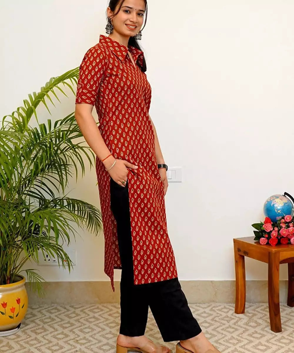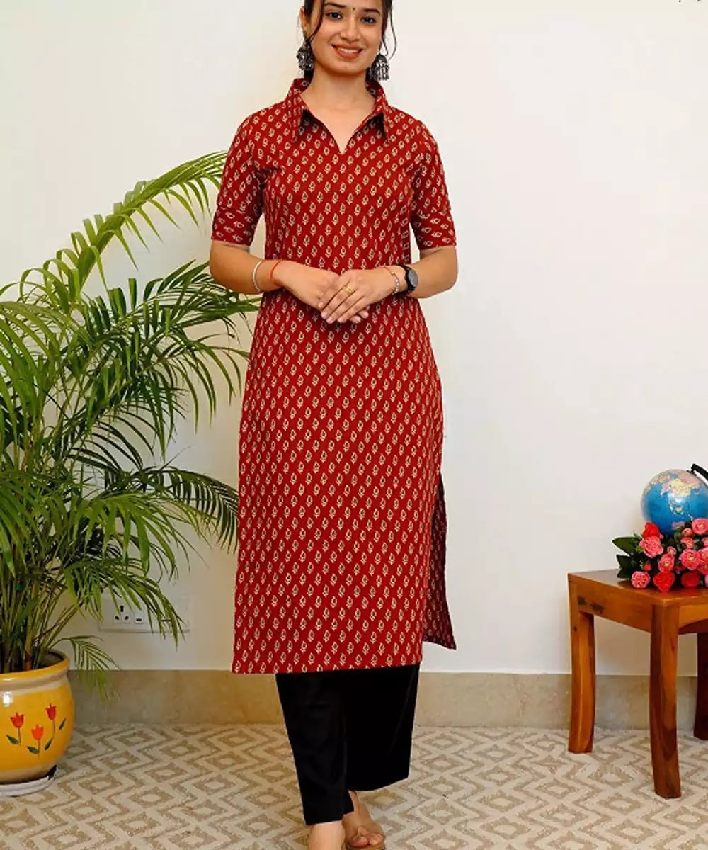 Floral Printed Shirt Collar Straight Cotton Kurta
