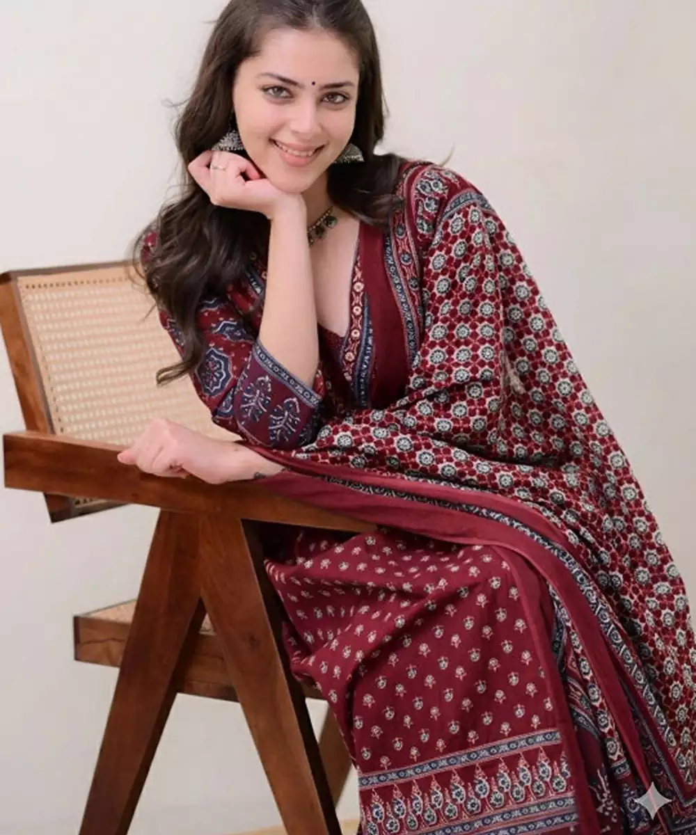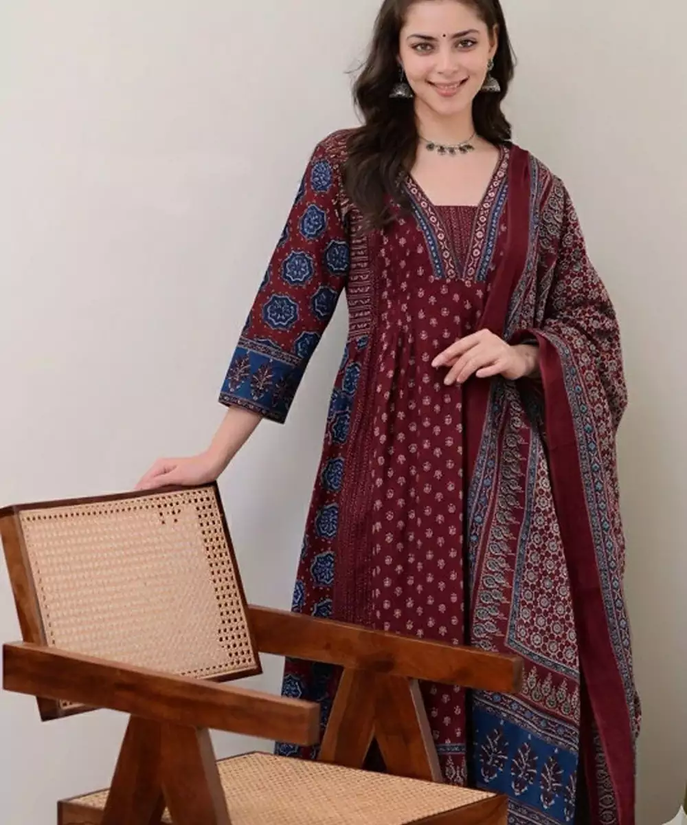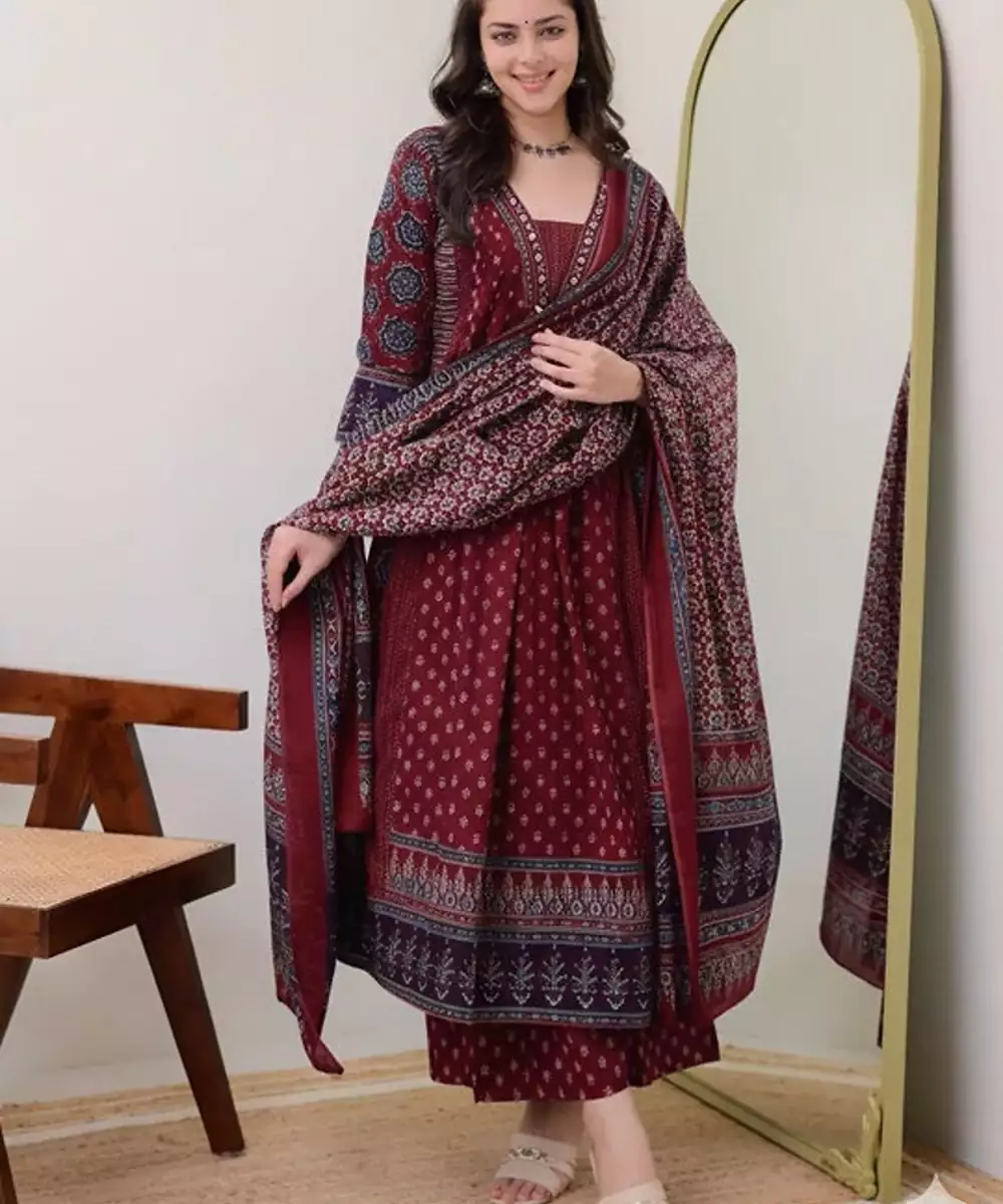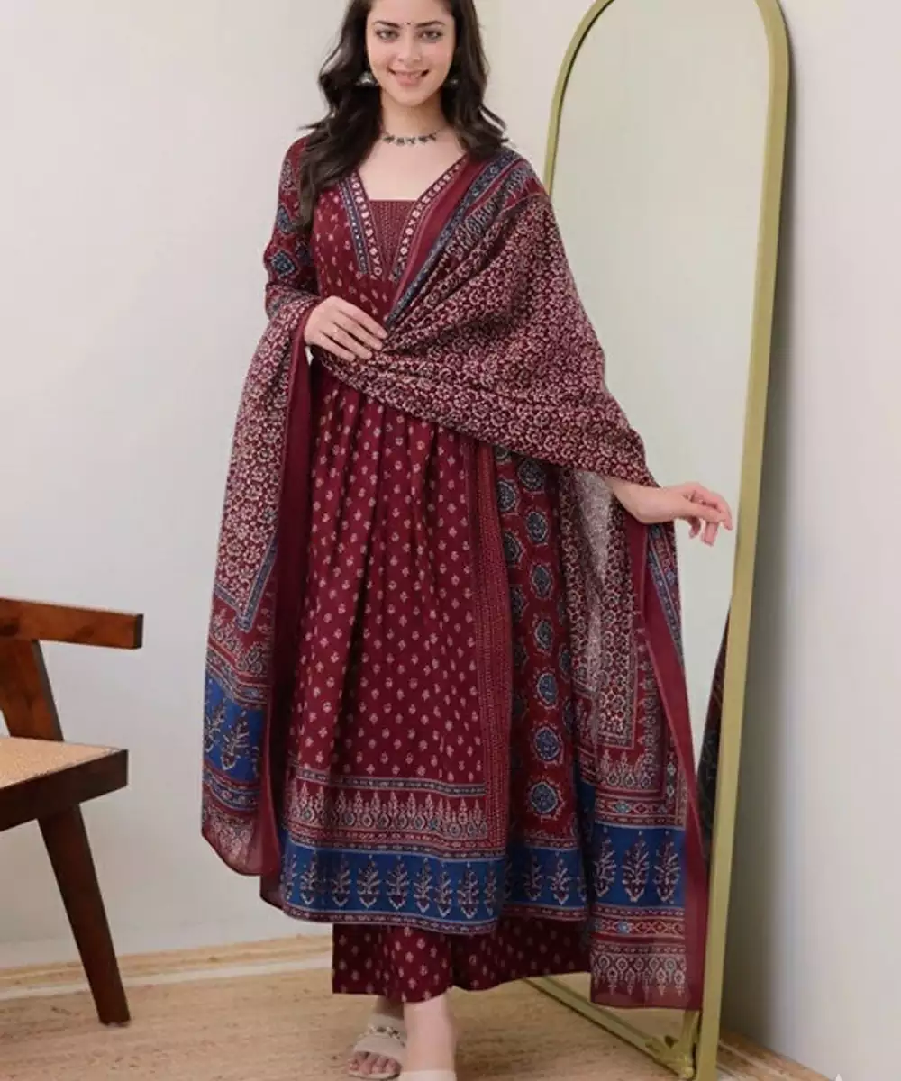 Maroon, White And Blue Printed Kurta With Palazzos And Dupatta Kurta Design: