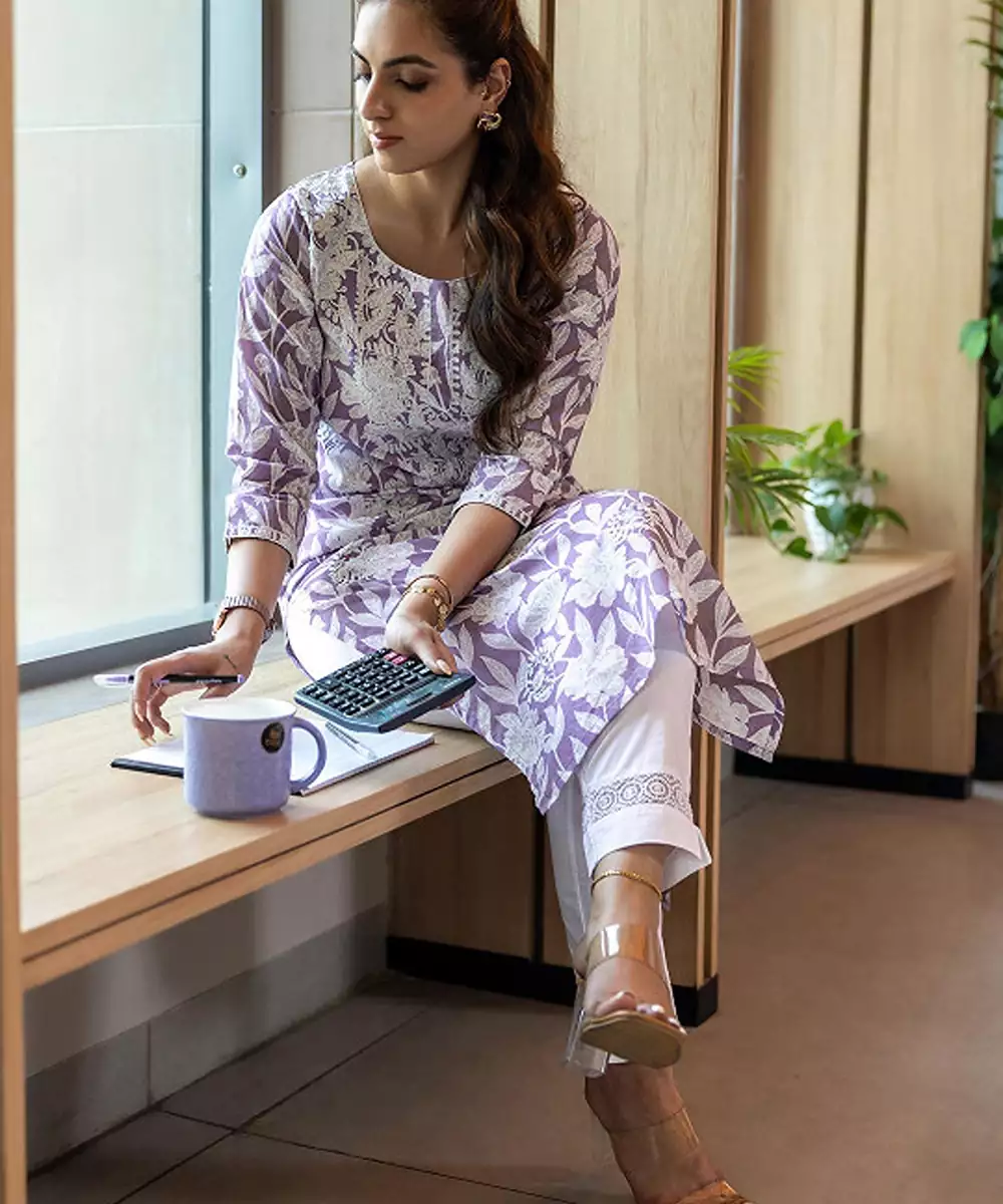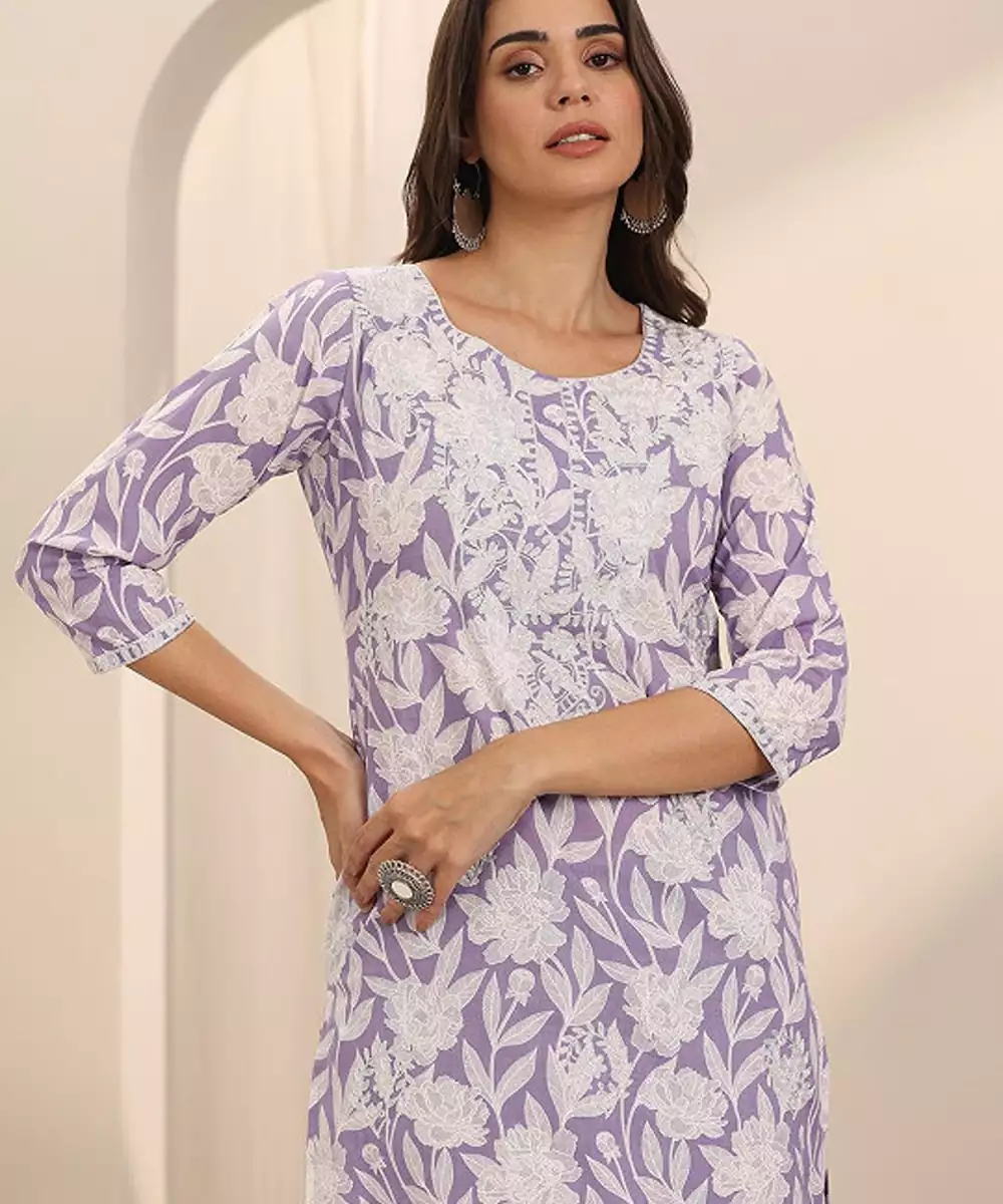 Floral Printed Thread Work Cotton Straight Kurta