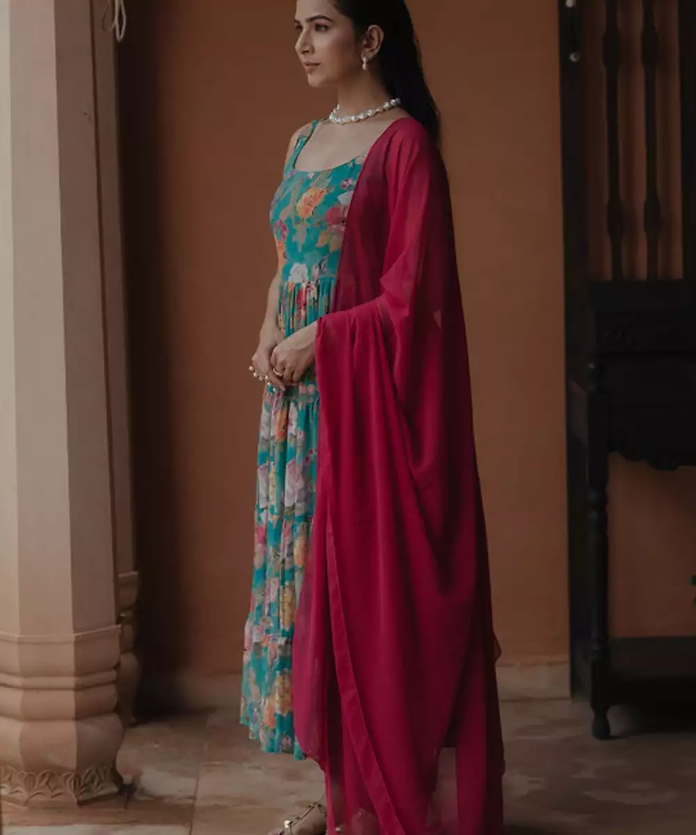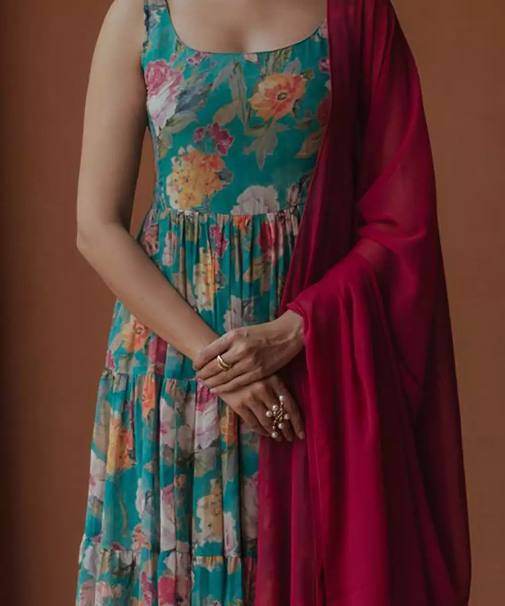 Floral Printed Tiered Kurta With Trousers & With Dupatta