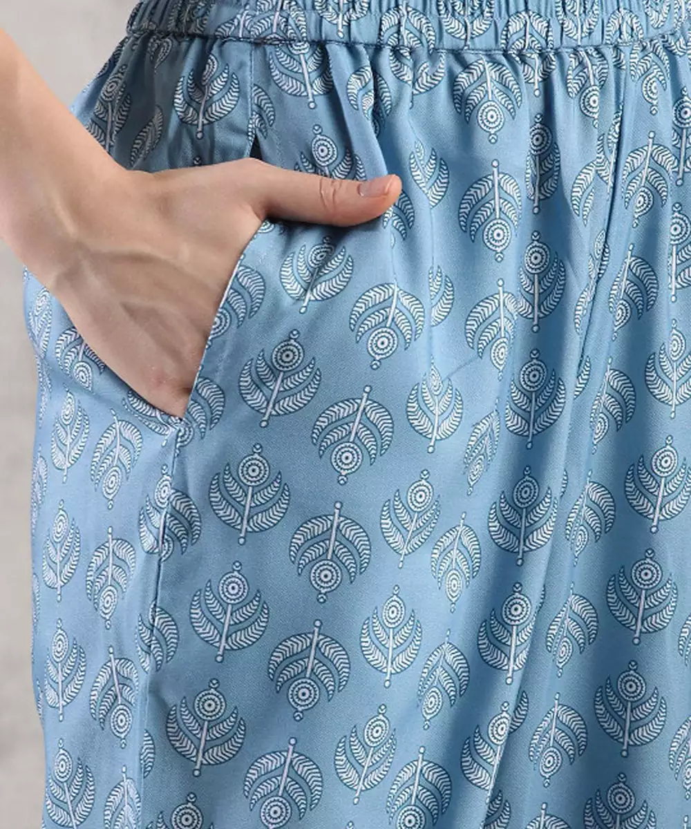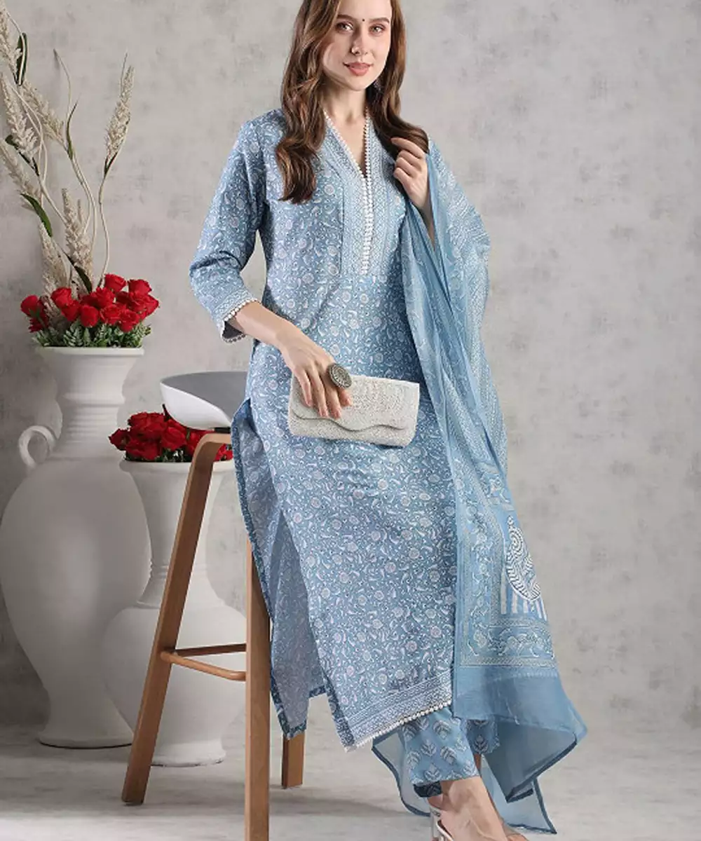 Blue Printed Kurta With Trouser With Dupatta Kurta Design:
