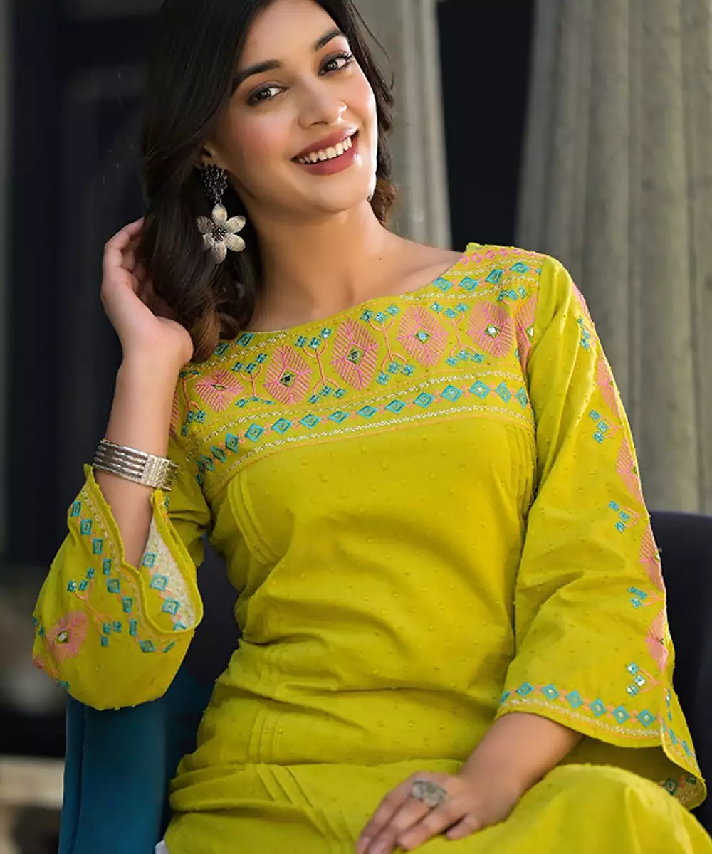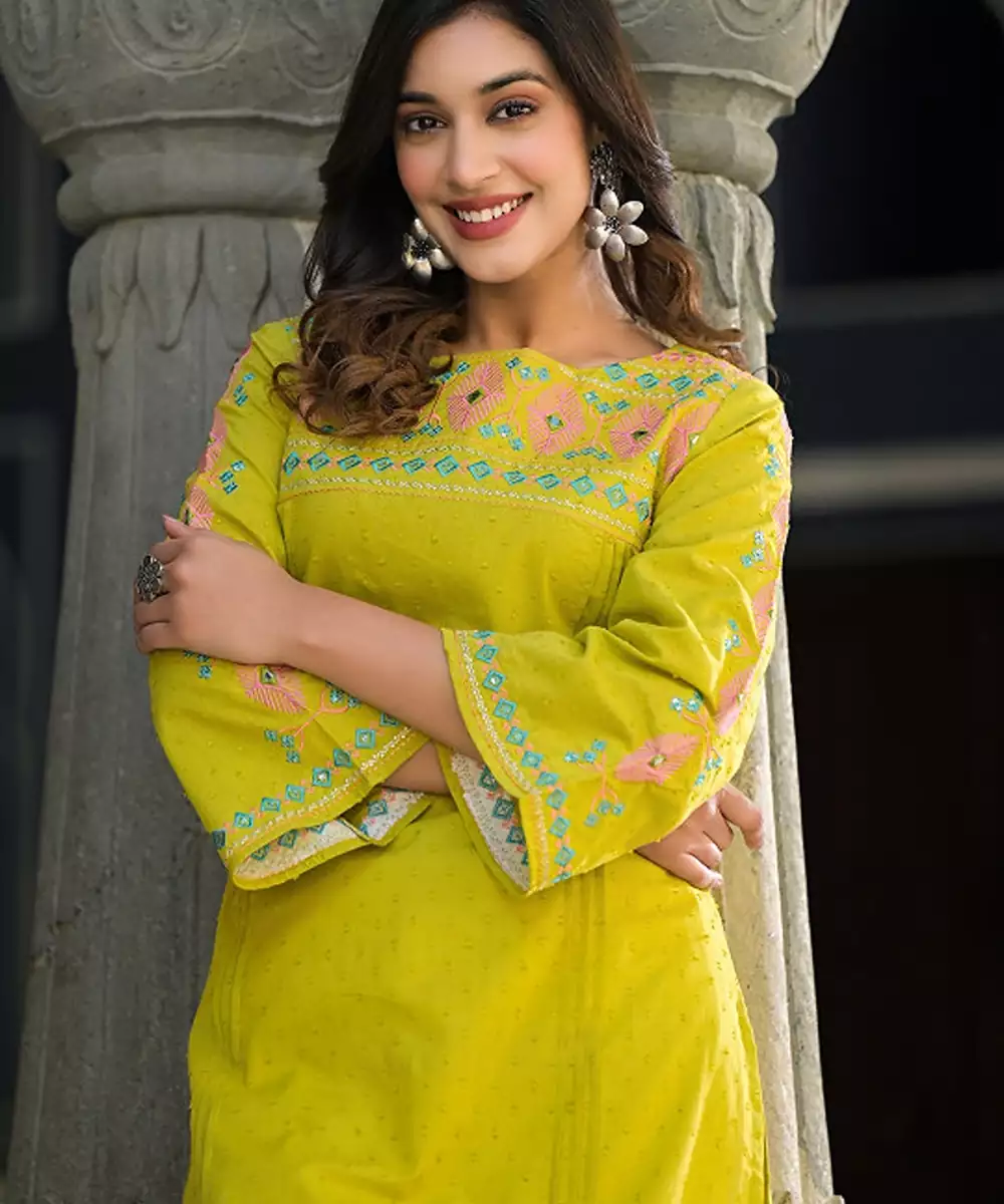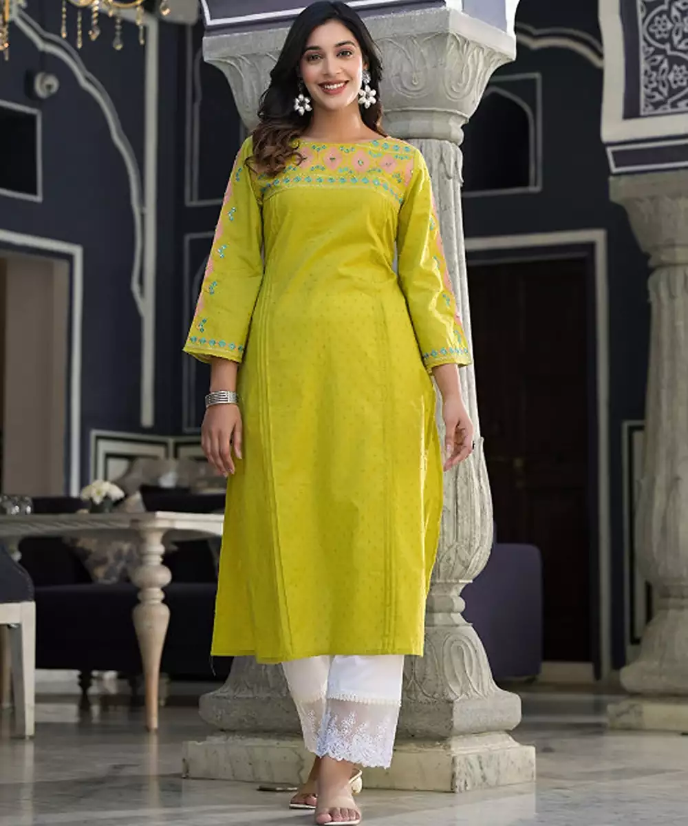 Floral Thread Embroidered Yoke Design Straight Kurta