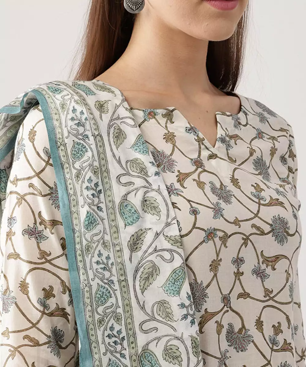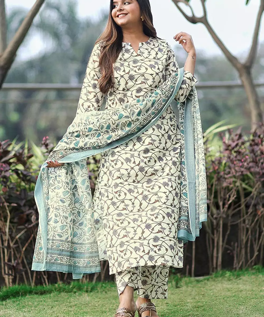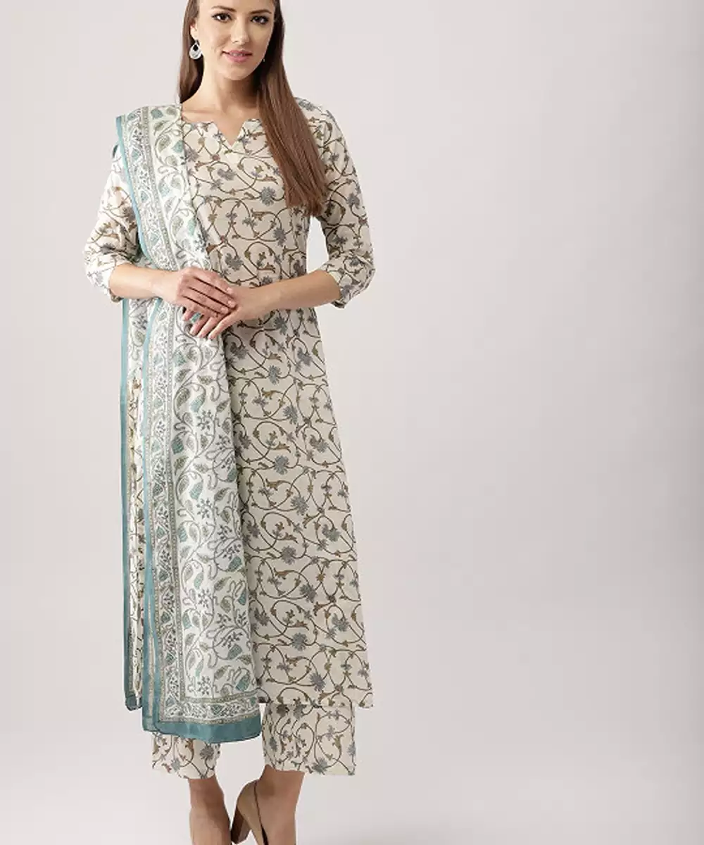This Set Includes: Kurta, Palazzos And Dupatta 'casually Ethnic' Or 'traditionally Casual', Both Are In Quintessence Of This Tasteful Pure Cotton Kurta Set. The Ethnic Overtones Of The Floral Vine Pattern Gives It A Classic Touch And Airy Silhouette Gives Its Statement Look. Minimally Bold, It Is A Perfect Blend Of Latest Trends And Conventional Ethnic Outfits.