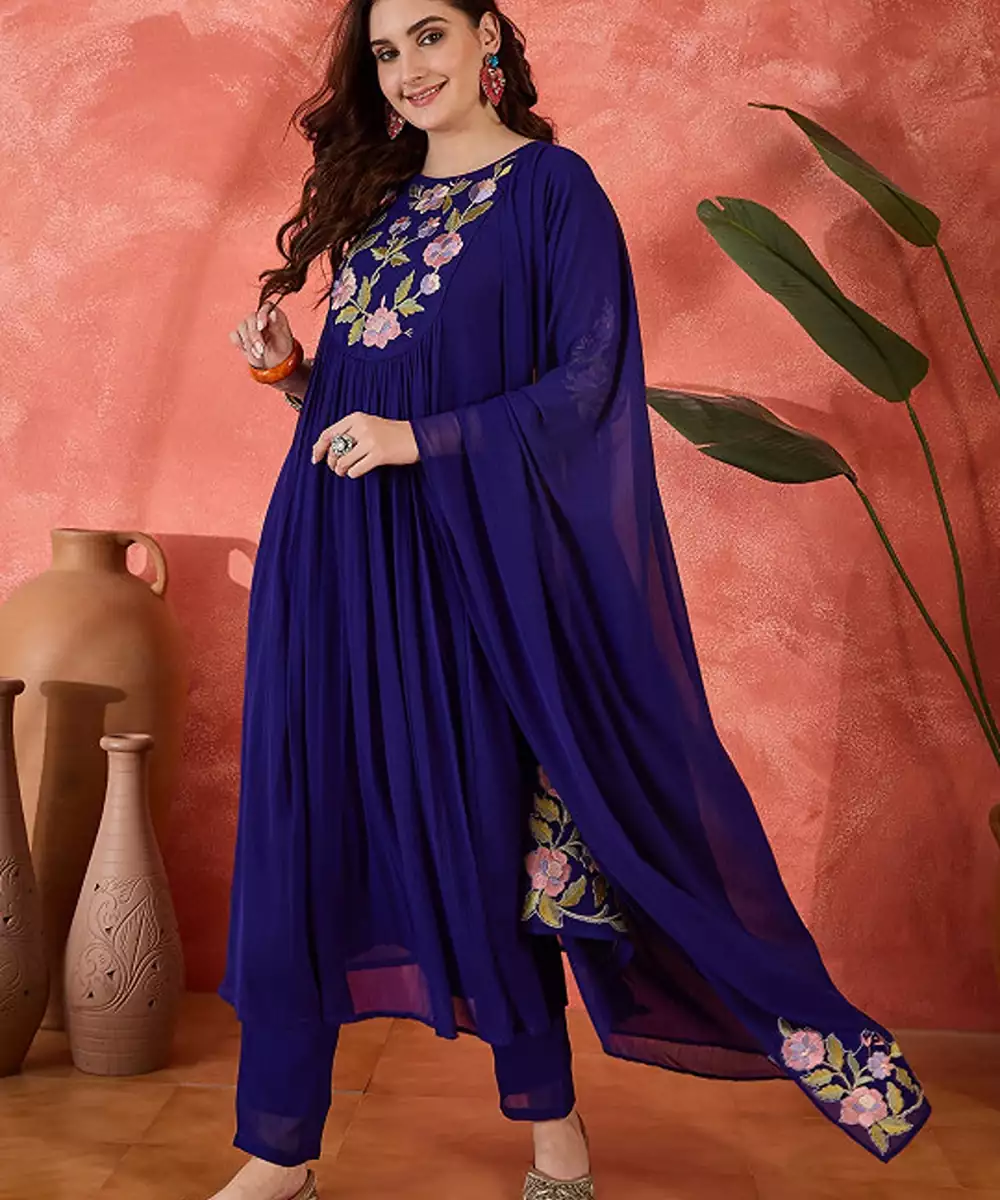 Blue, Pink And Green Yoke Design Kurta With Trouser And Dupatta Kurta Design: