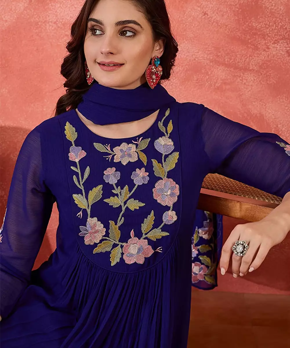 Floral Yoke Design Straight A Line With Trouser And Dupatta