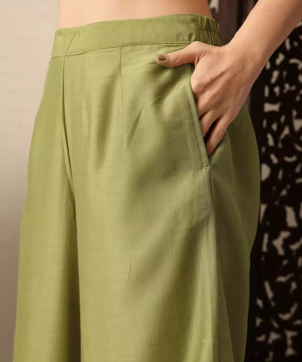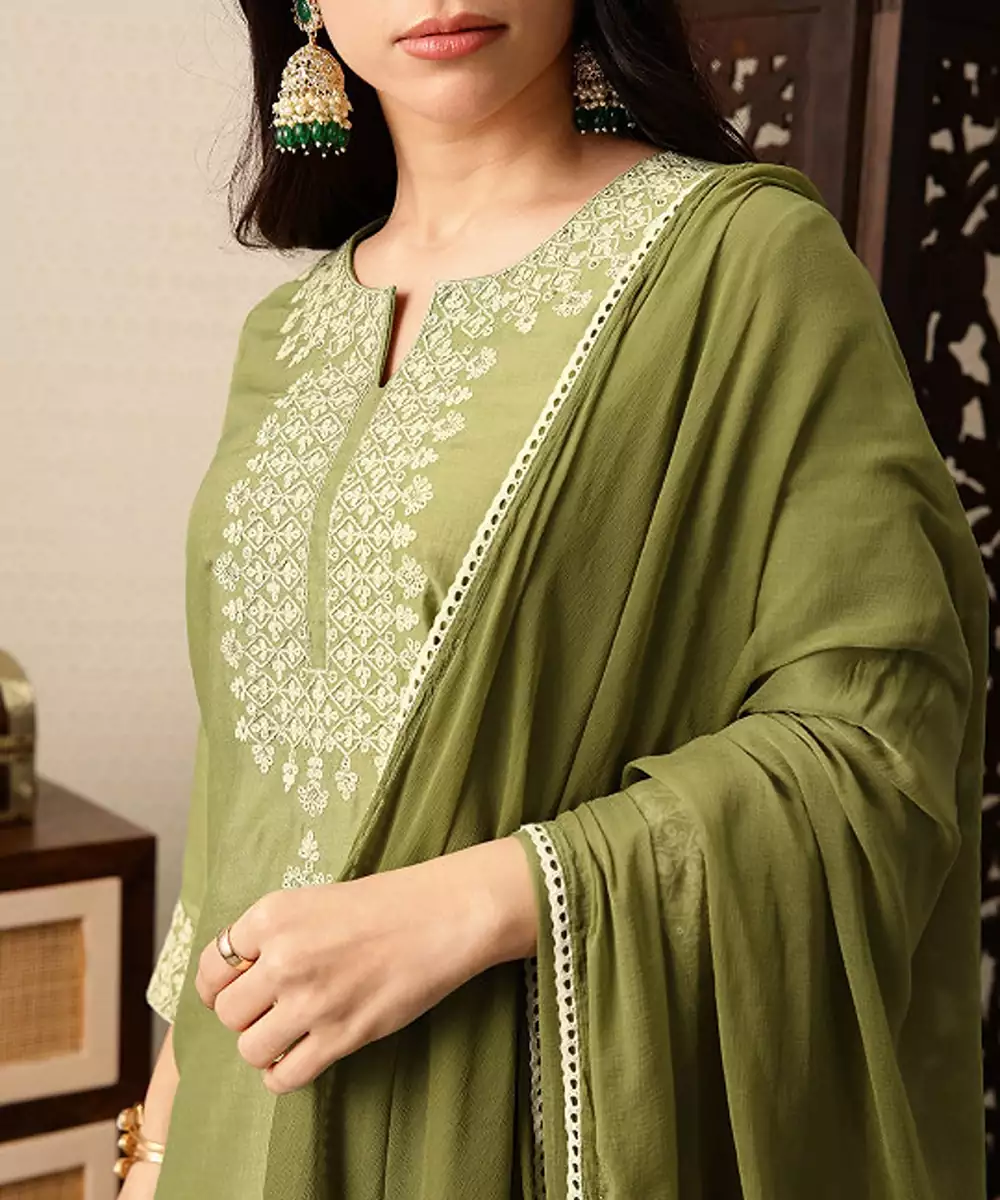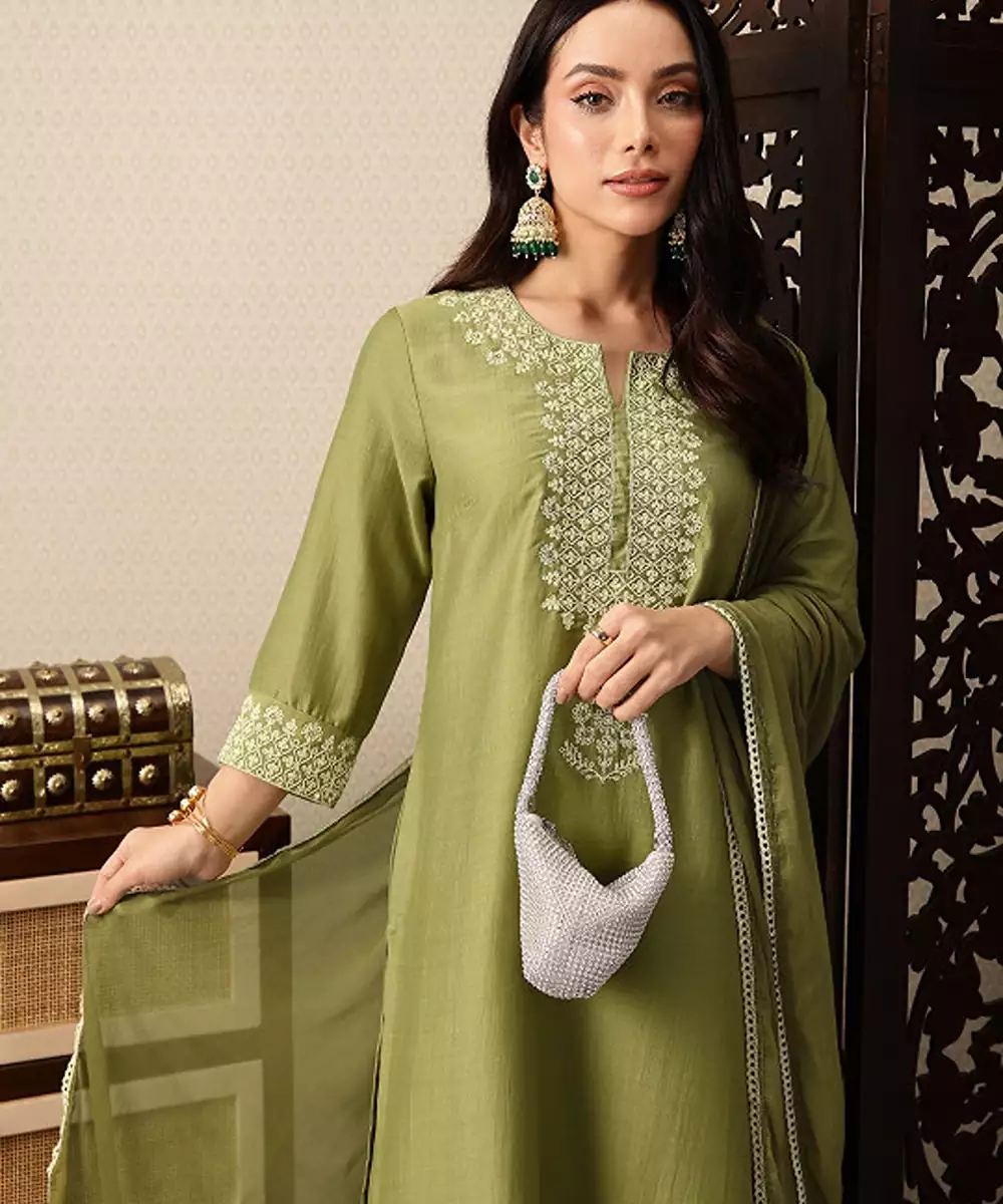 Product Details About The Brand: Everything Created At The House Of Pataudi Is Inspired By The Modern Indian Sensibility. We Believe In A Seamless Weave Of The Past With The Present. Our Carefully Crafted Pieces Give Expression To A Refined And Effortless Way Of Life. About The Collection: Jashn This Line Draws Upon Traditional Costumes For Inspiration While Rendering An India Modern Aesthetic. Rich Textiles With Minimal Yet Exquisite Zari Embroideries. Ideal For Celebrating The Evening With A Contemporary Take On Festive Attire. Green Yoke Design Kurta With Palazzos & Dupatta Kurta Design: