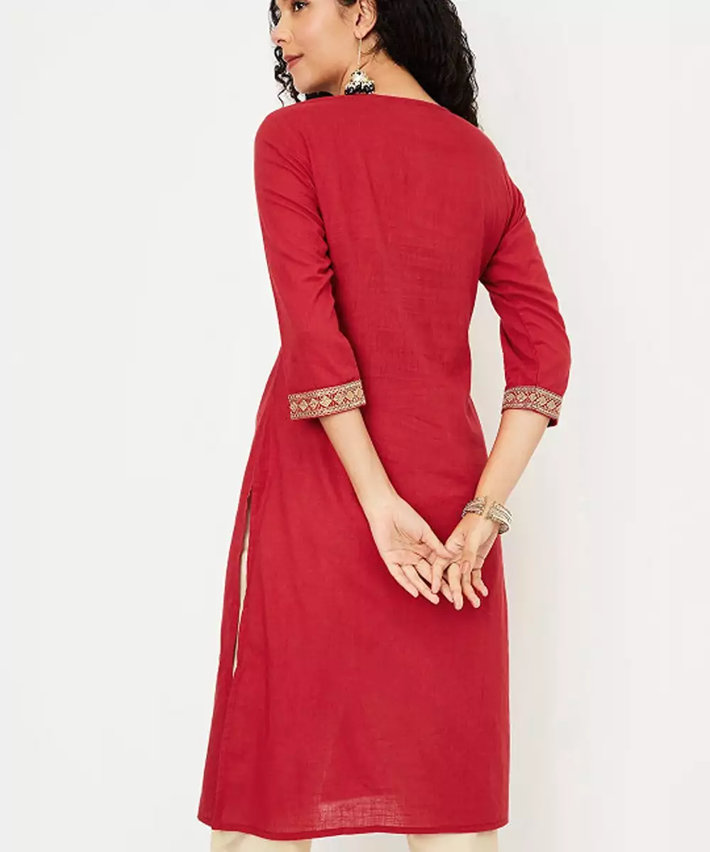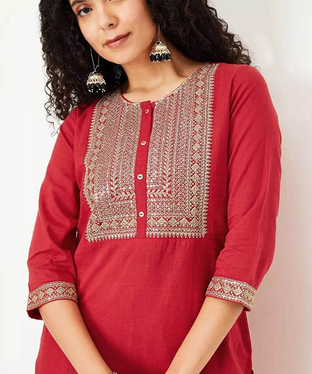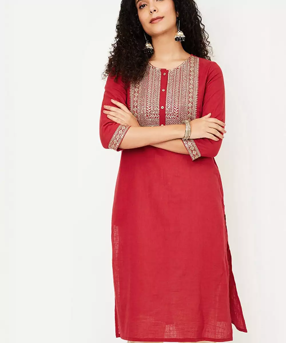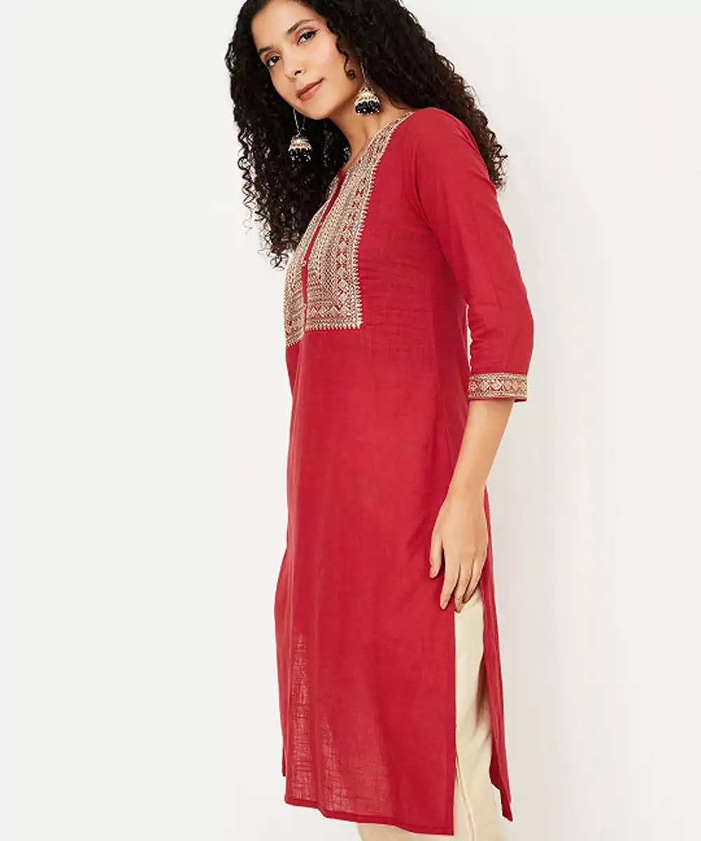 Geometric Yoke Design Thread Work Cotton Straight Kurta