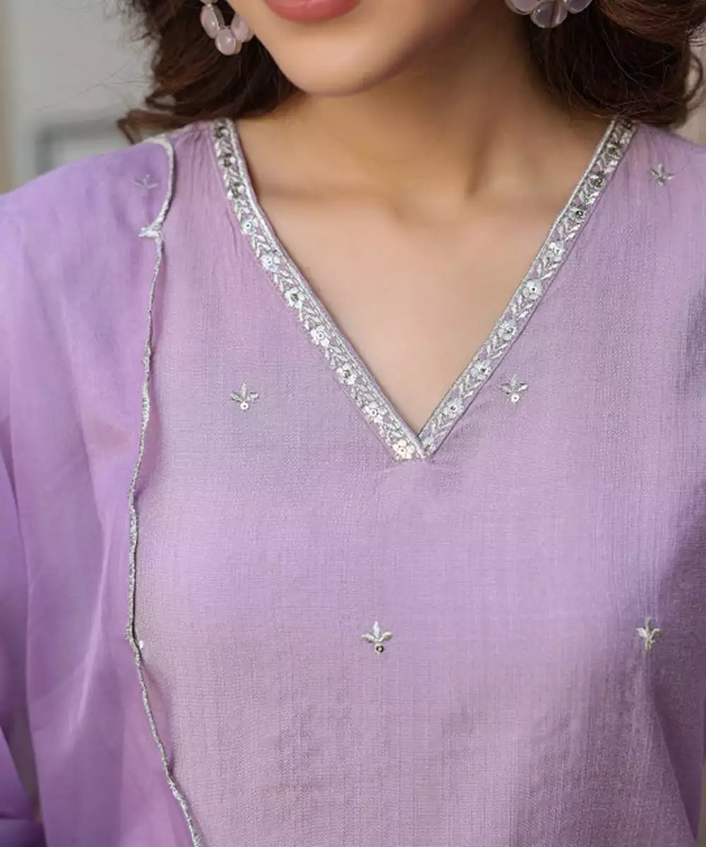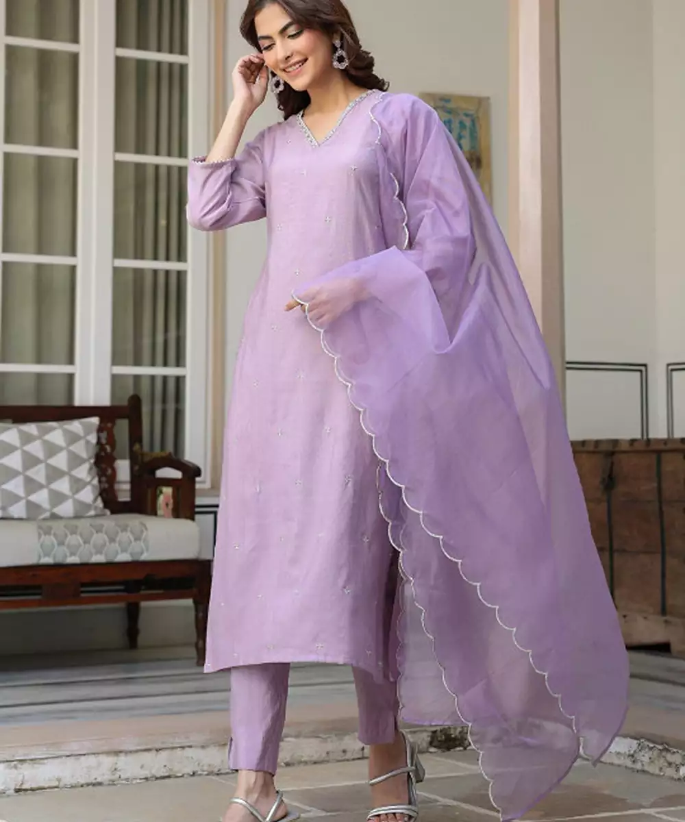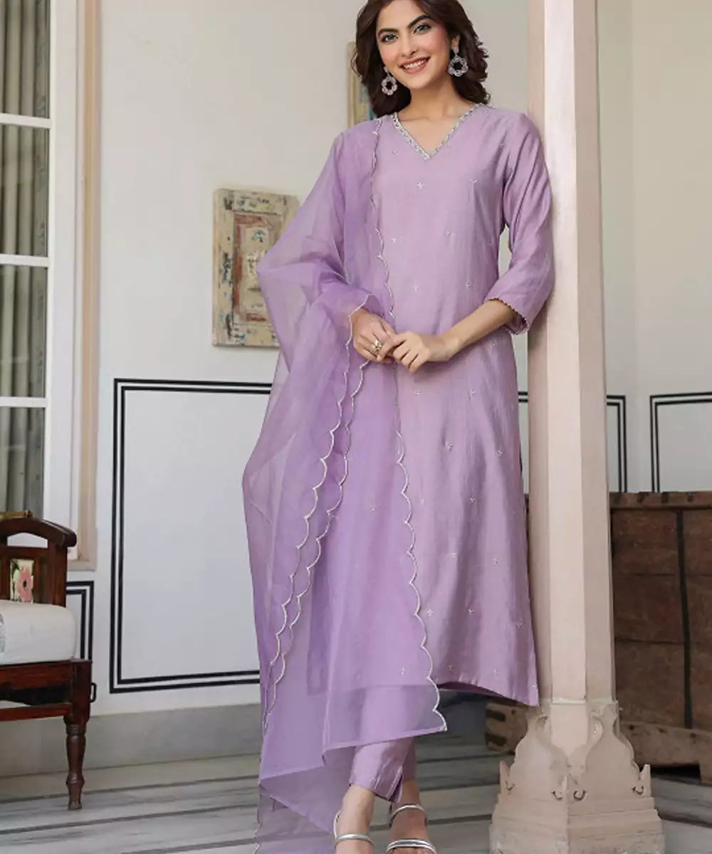 Lavender Self Design Kurta With Trousers With Dupatta Kurta Design: