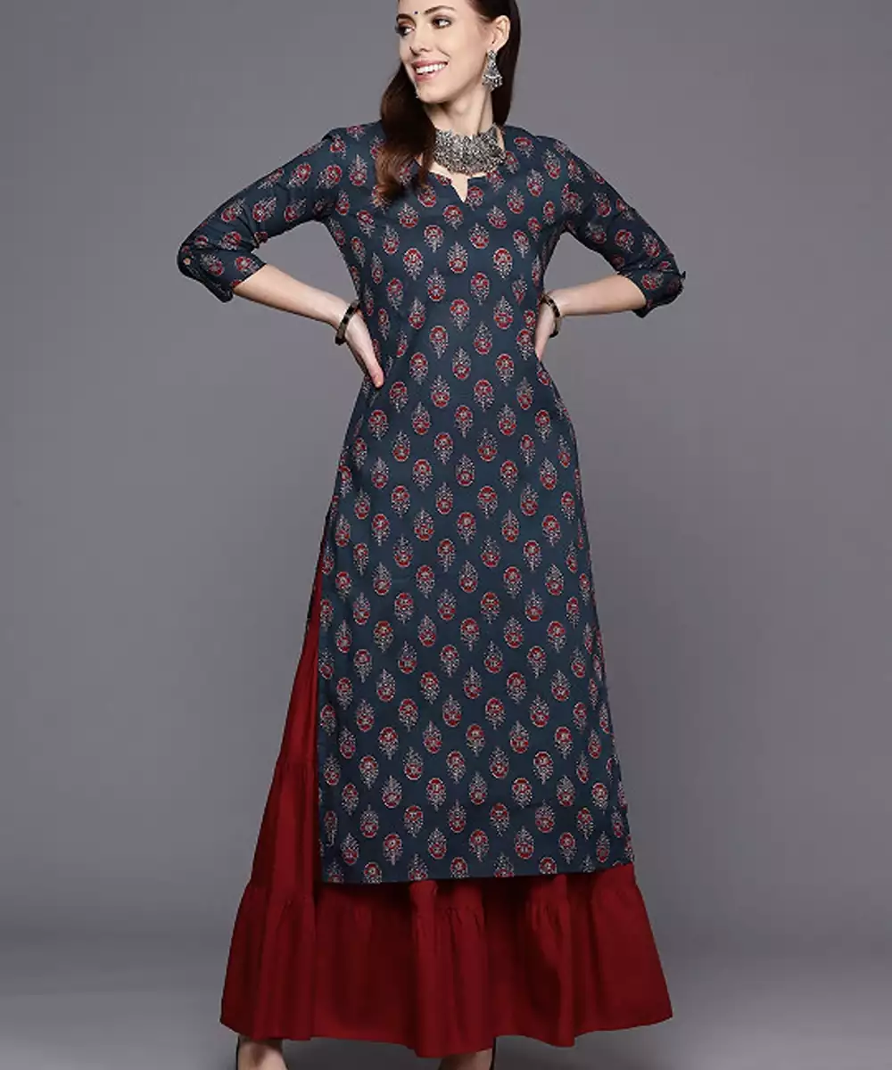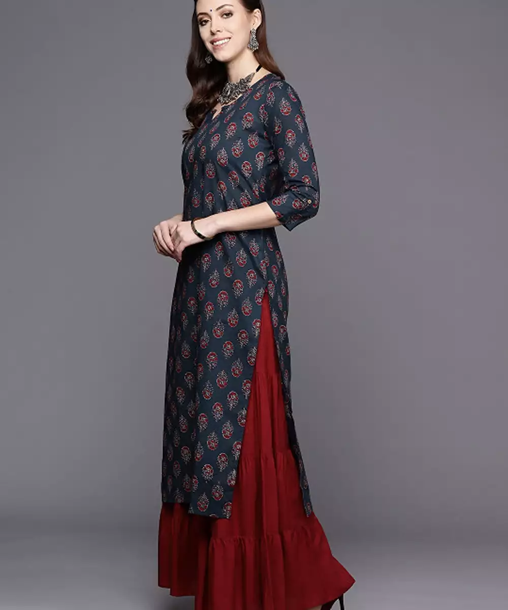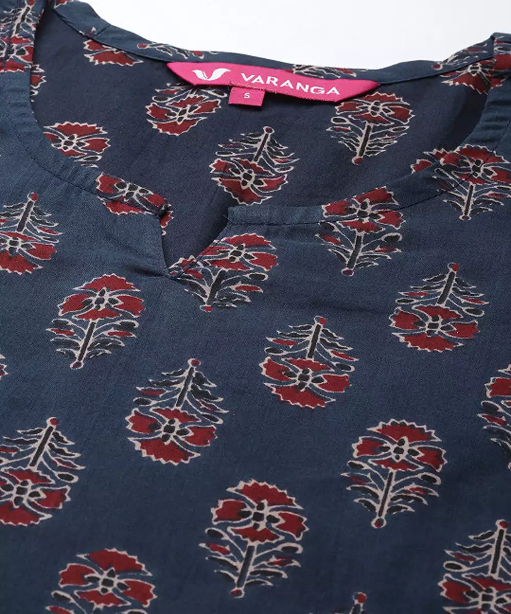 1 Kurta Kurta:Fit Straight Color Navy Blue Print & Pattern Ethnic Motif Printed Neckline Round With V Slit Sleeves Three Quarter"